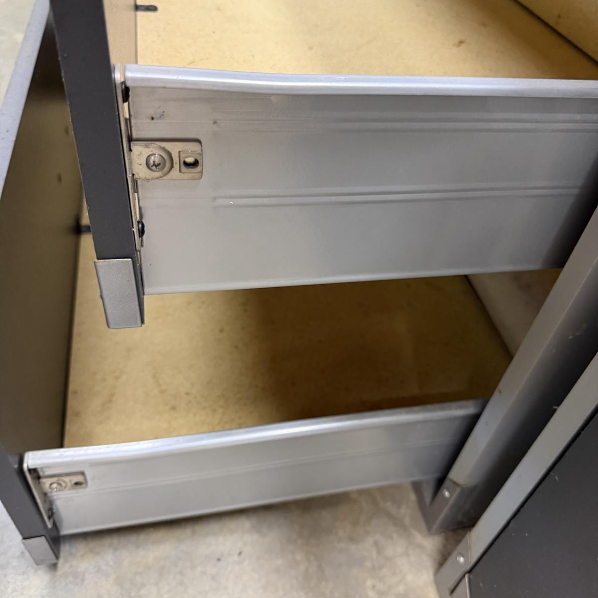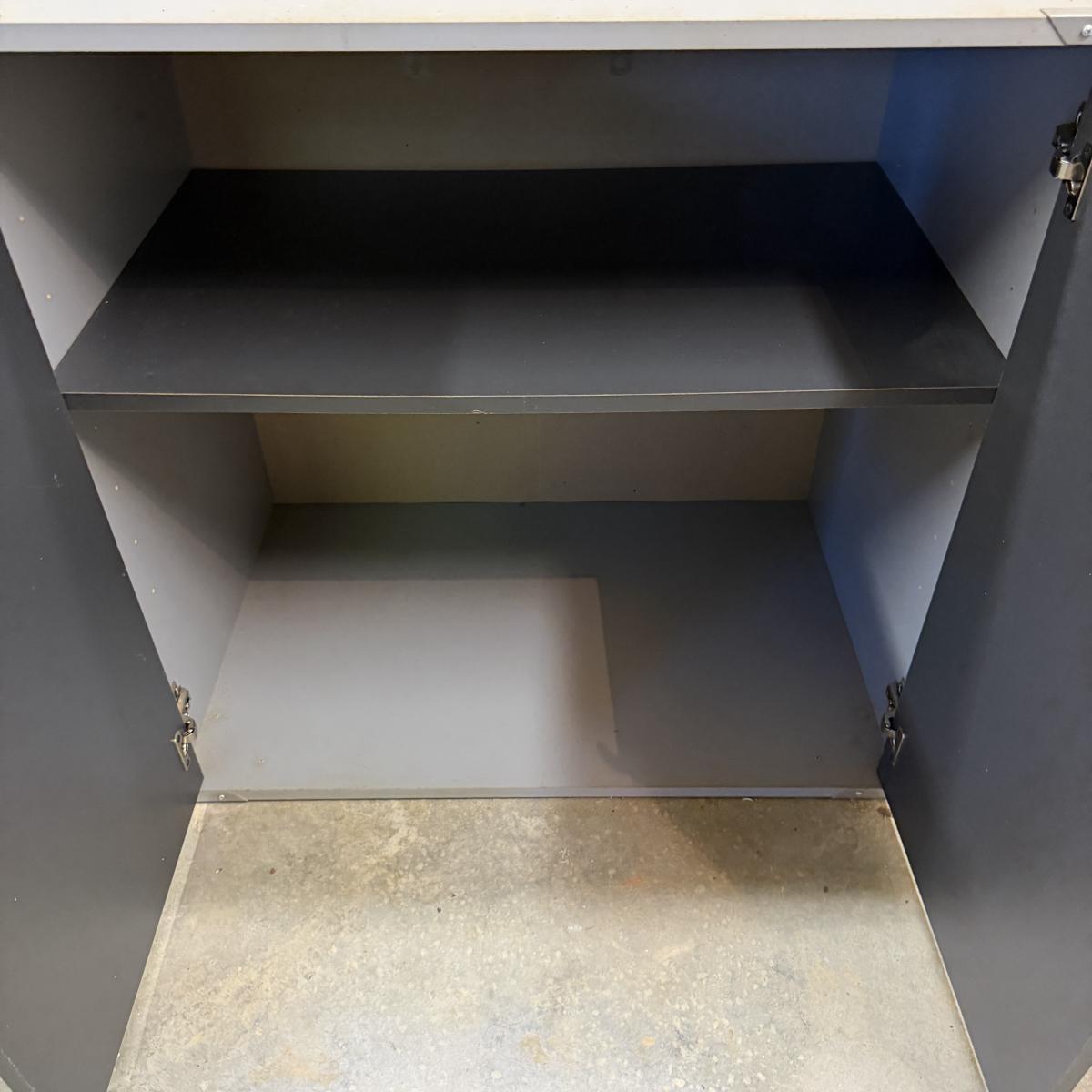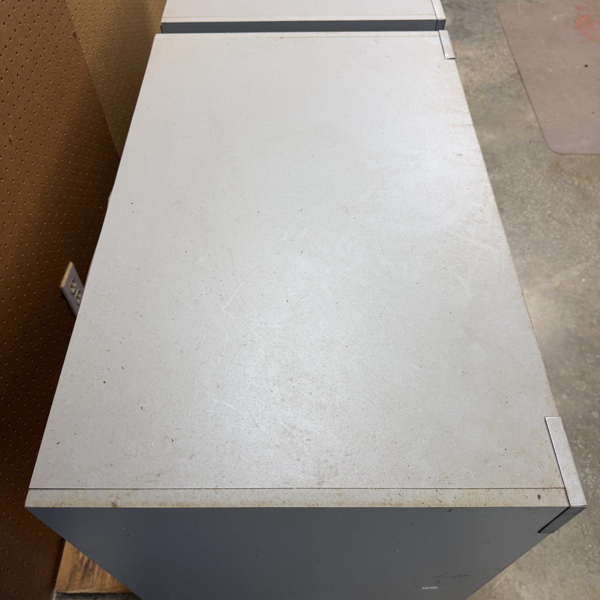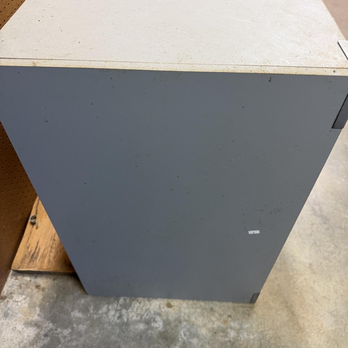 Lot includes a garage storage cabinet with matching three drawer chest. Includes keys. Cabinet has adjustable shelf and each piece measures 31” x 19” x 30”H.