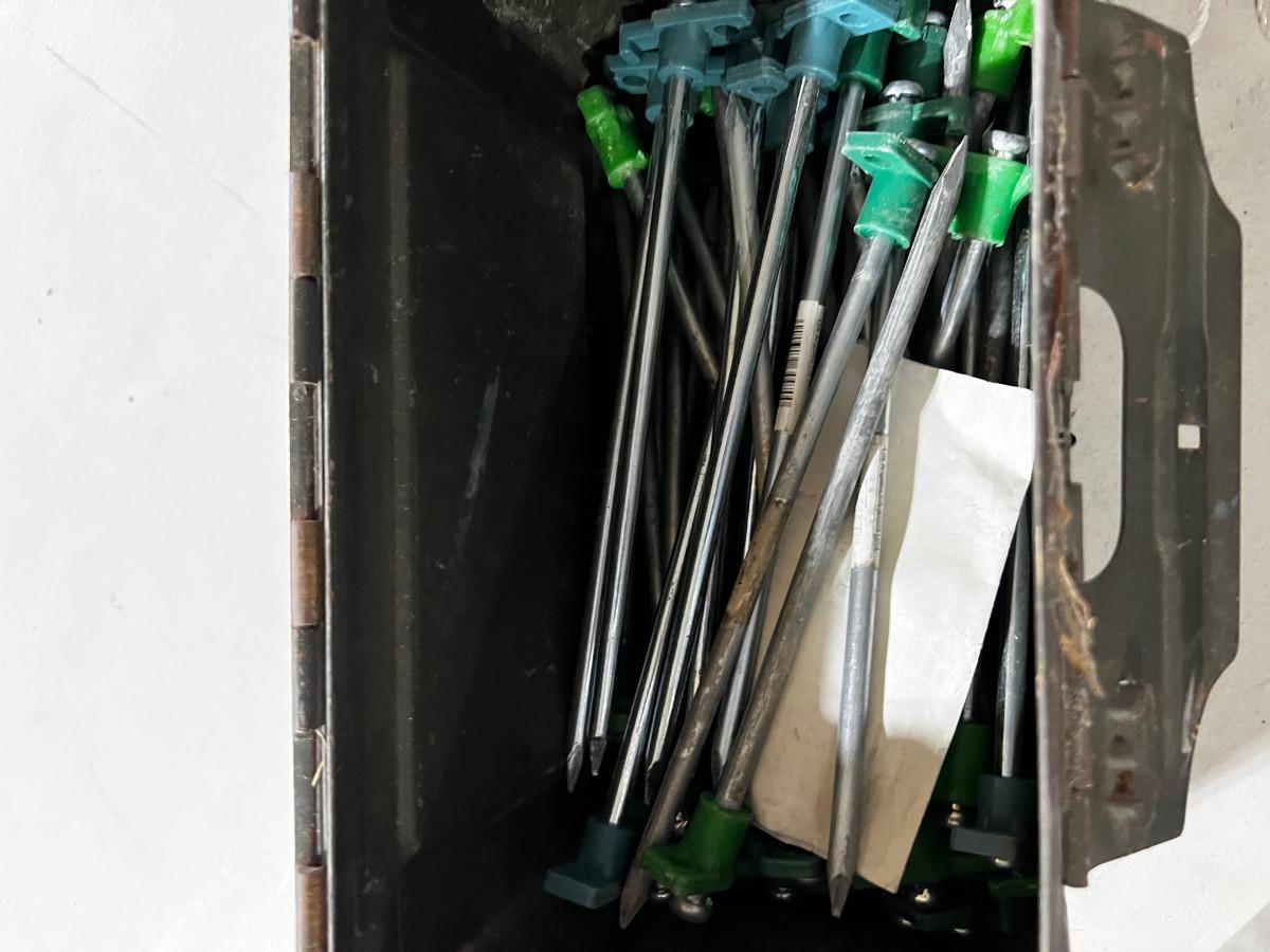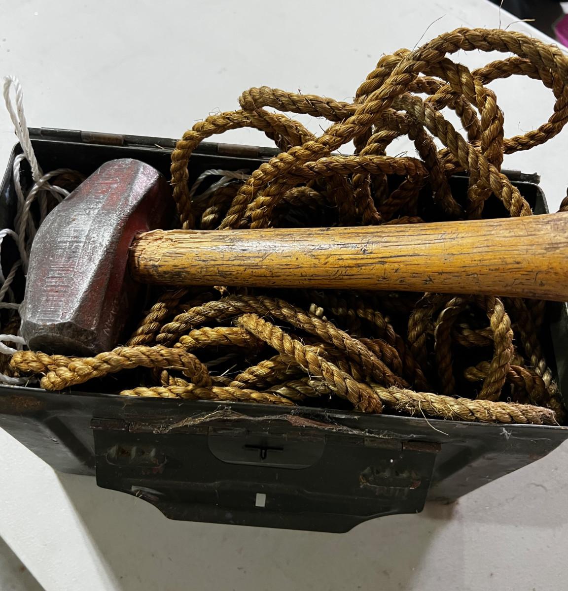 Garage: Tent Pegs ,,Rope and a Hammer in an old AMMO Box