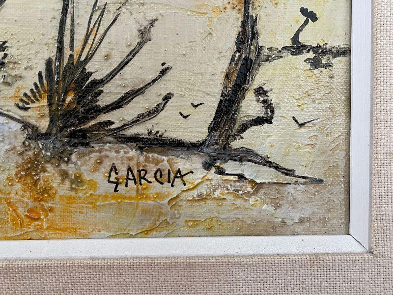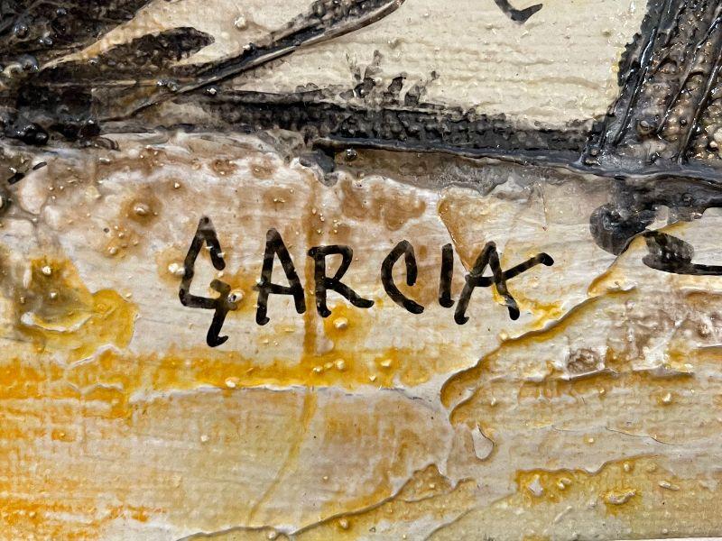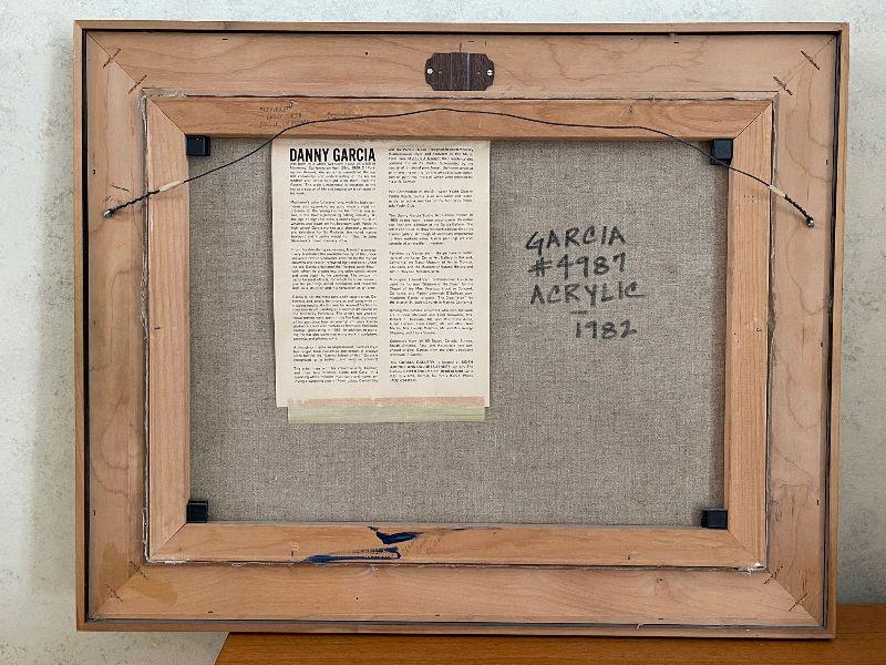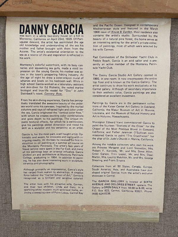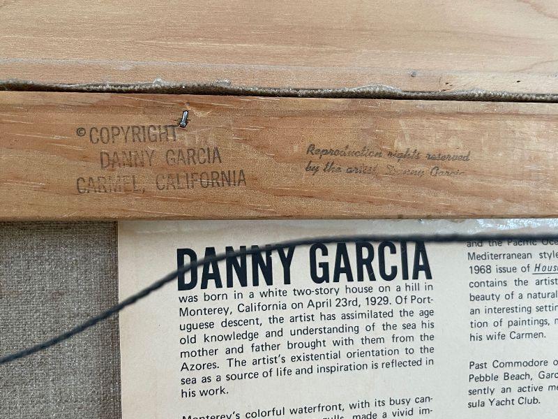 The item for auction is an original abstract oil painting on panel by noted California artist Danny Garcia. The festive environment of Monterey's Waterfront District and the treasures to be found there are most often the subject of this artist's work. The scenes of wharves and boats, and the bounties of sail and sea make for colorful renderings of his meanderings.