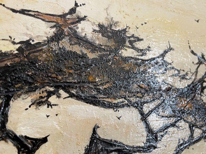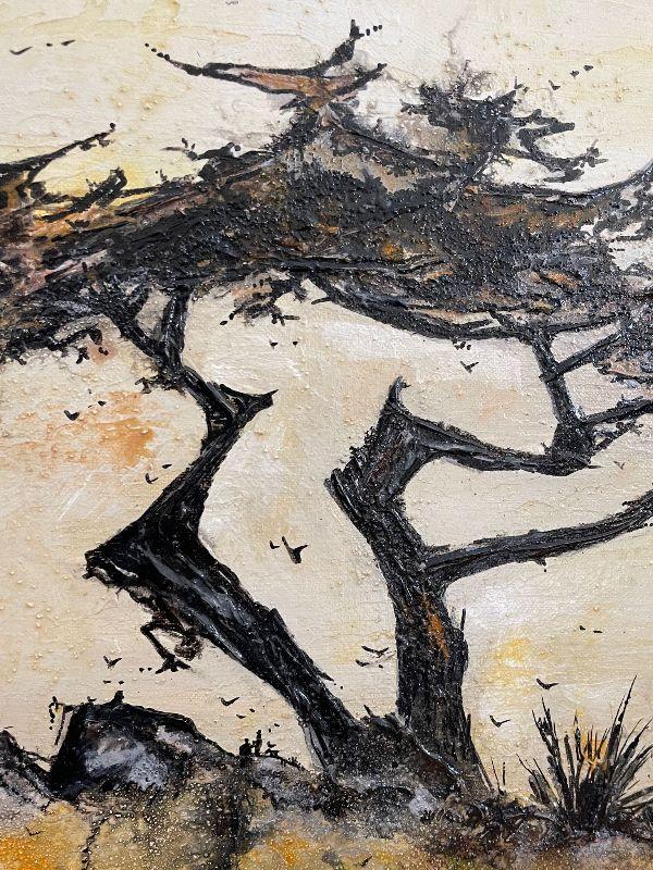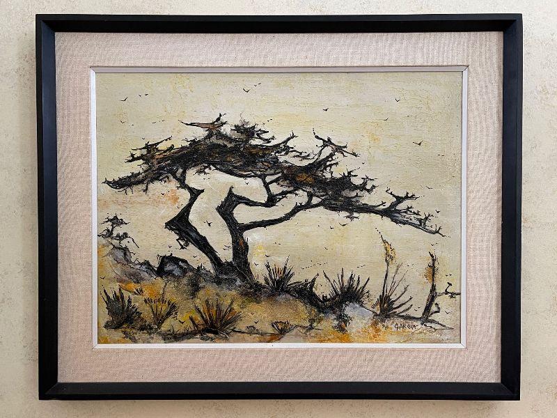 This painting features a weather-worn tree typical of those along the rugged, rocky shoreline of Monterey, CA.