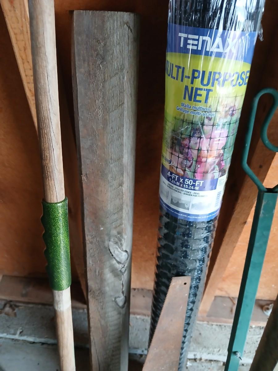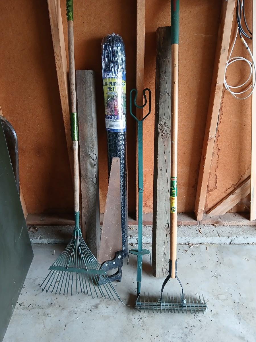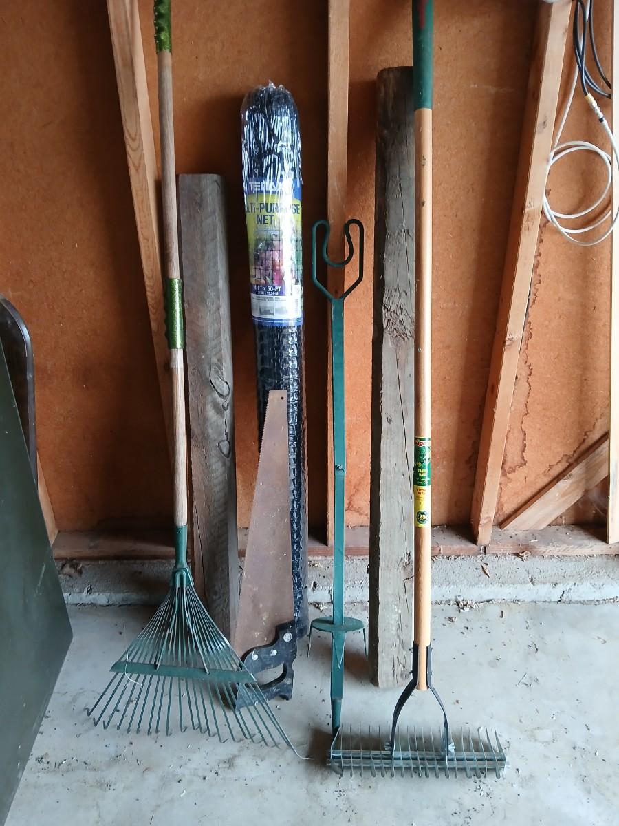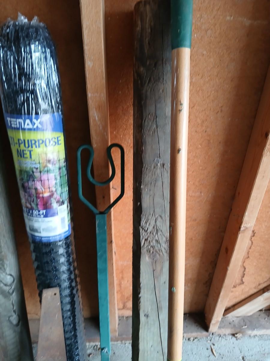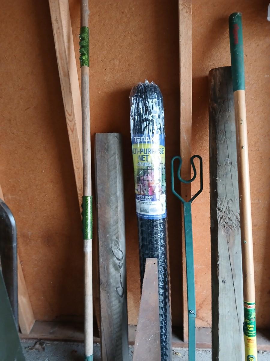 Gardening items - roll of new net fencing - short landscape timbers- rakes and more