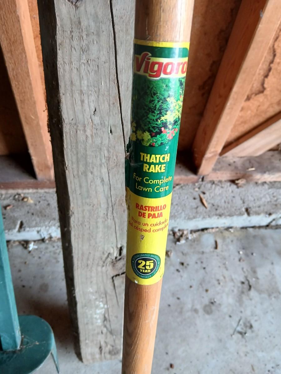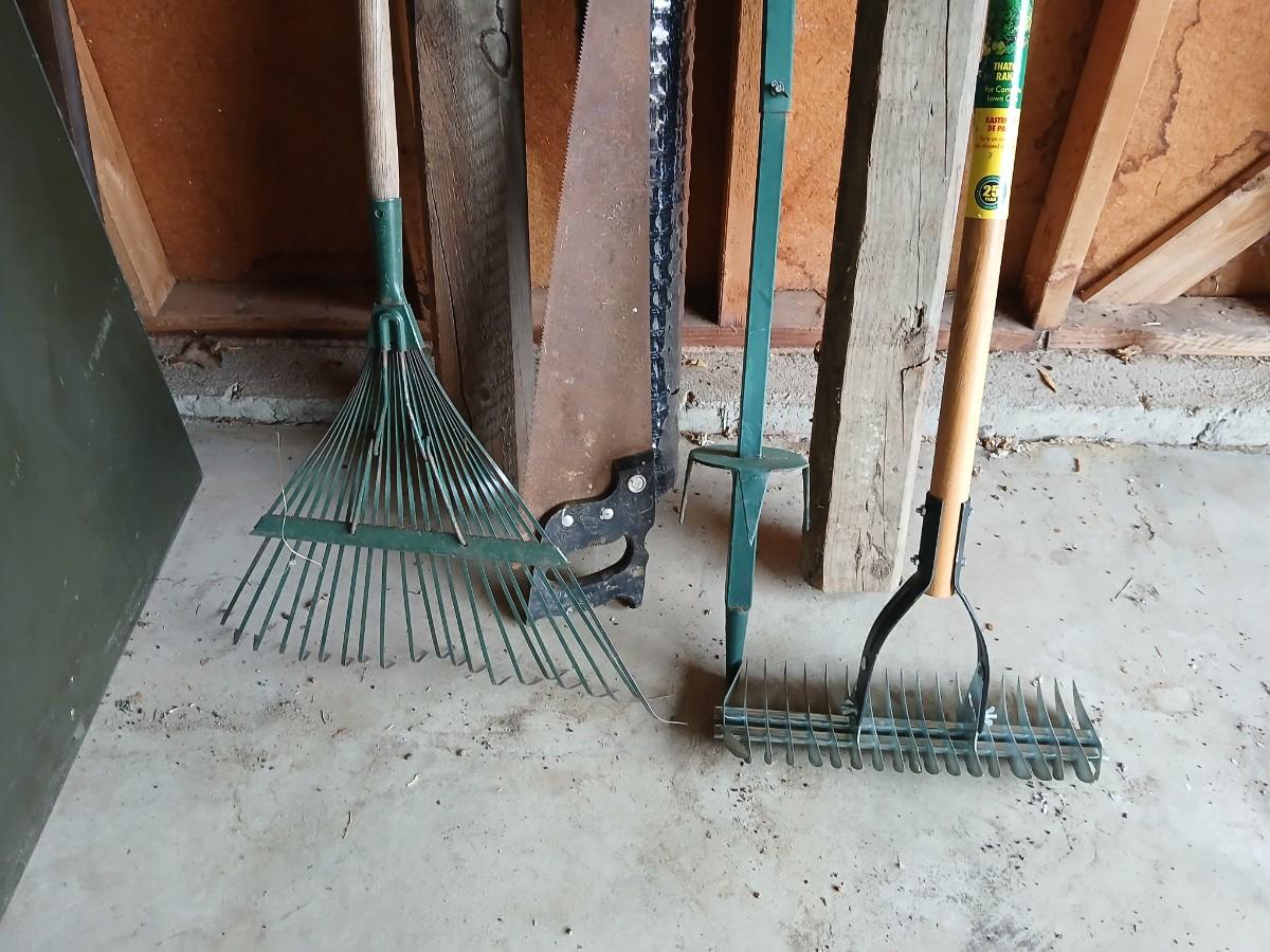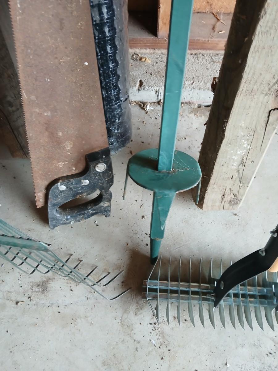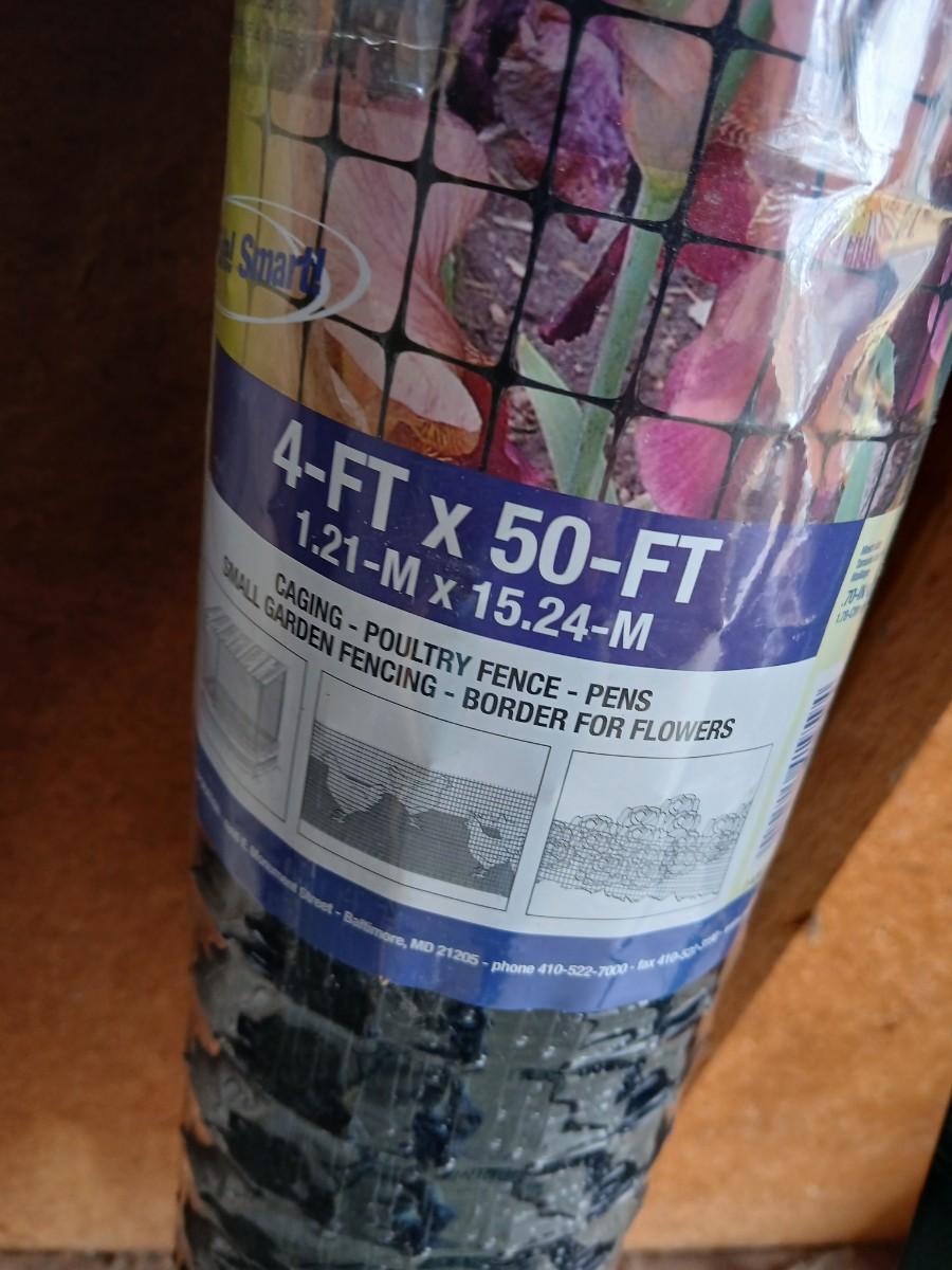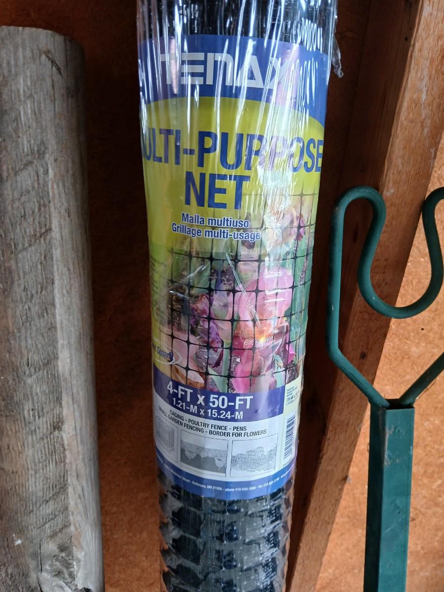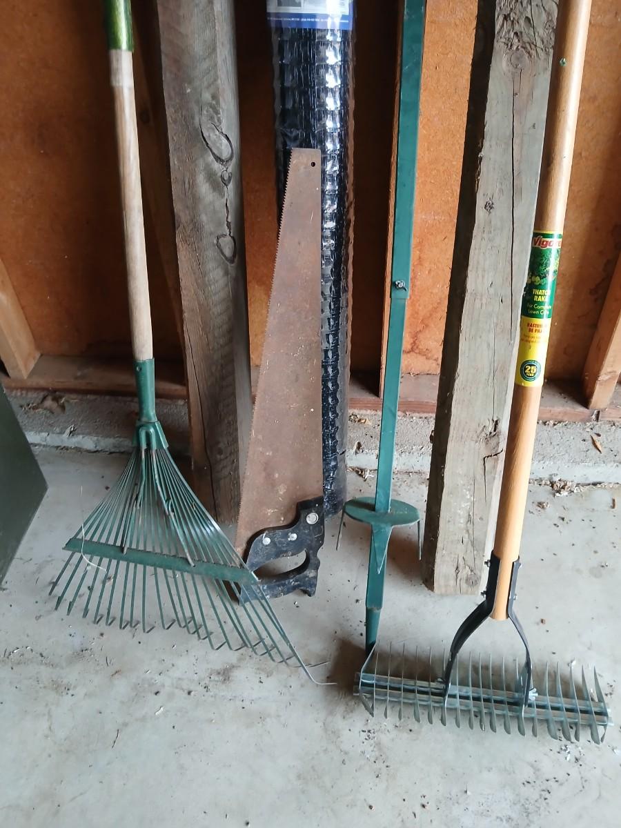 Gardening items - roll of new net fencing - short landscape timbers- rakes and more