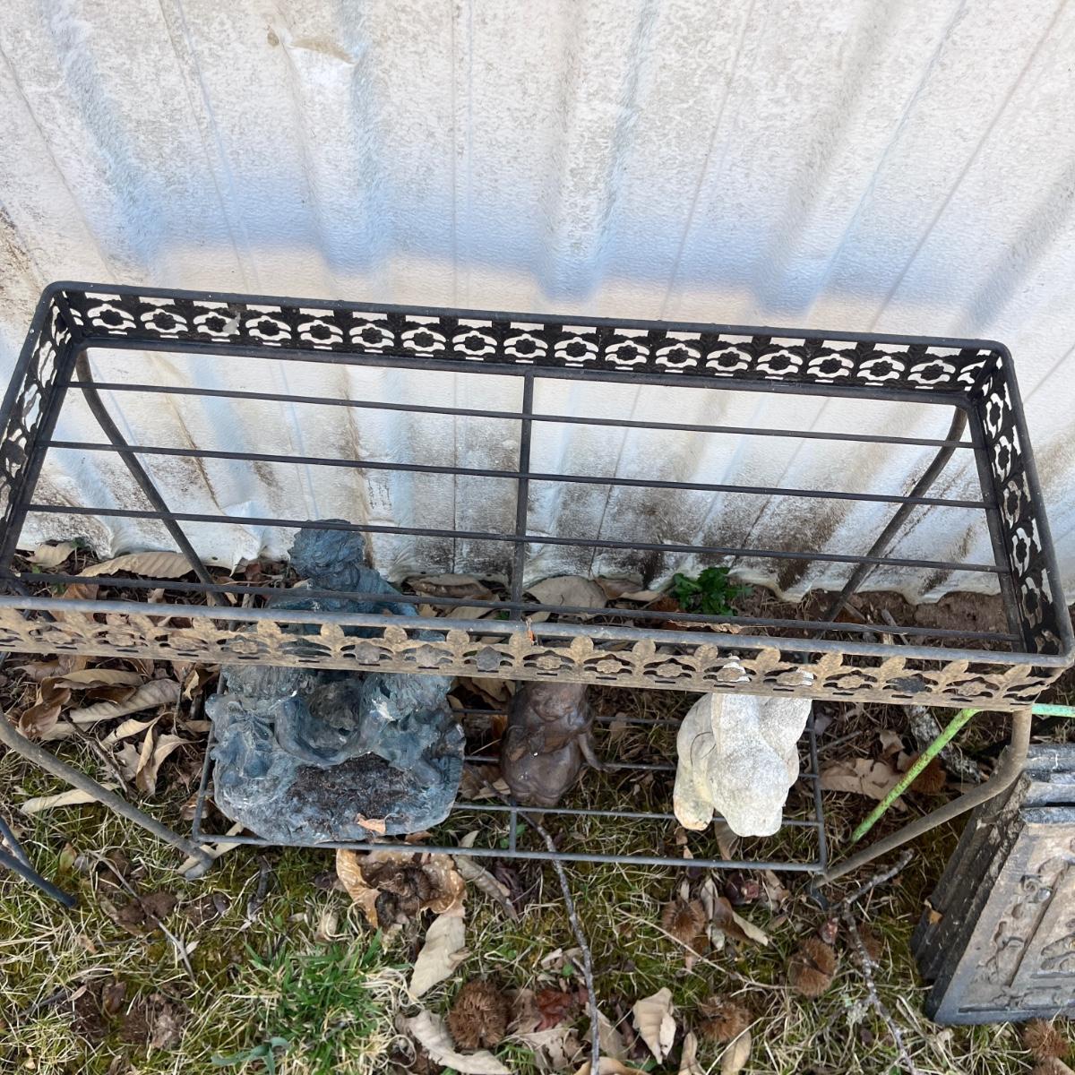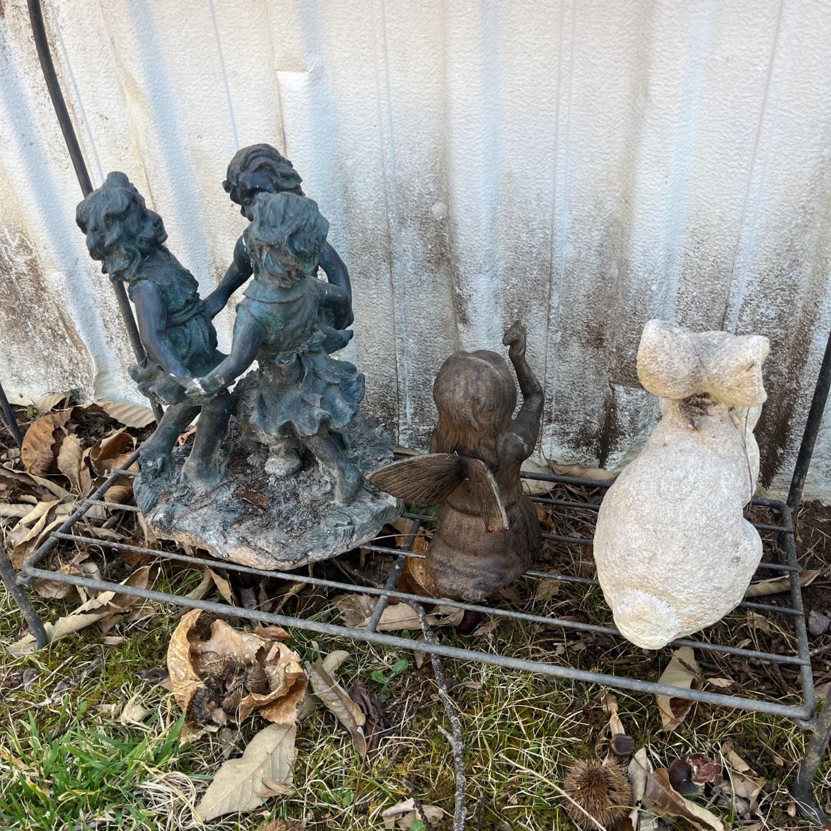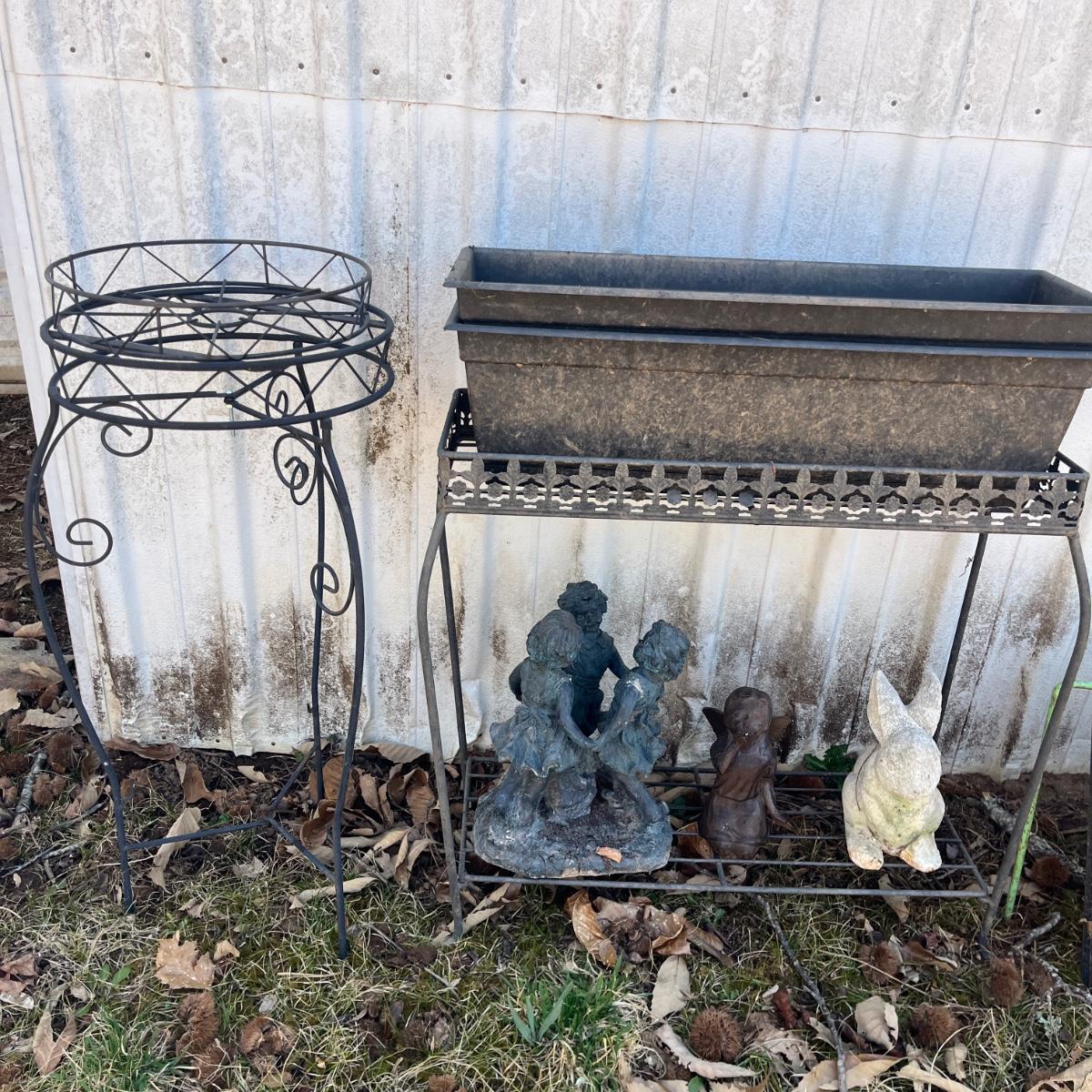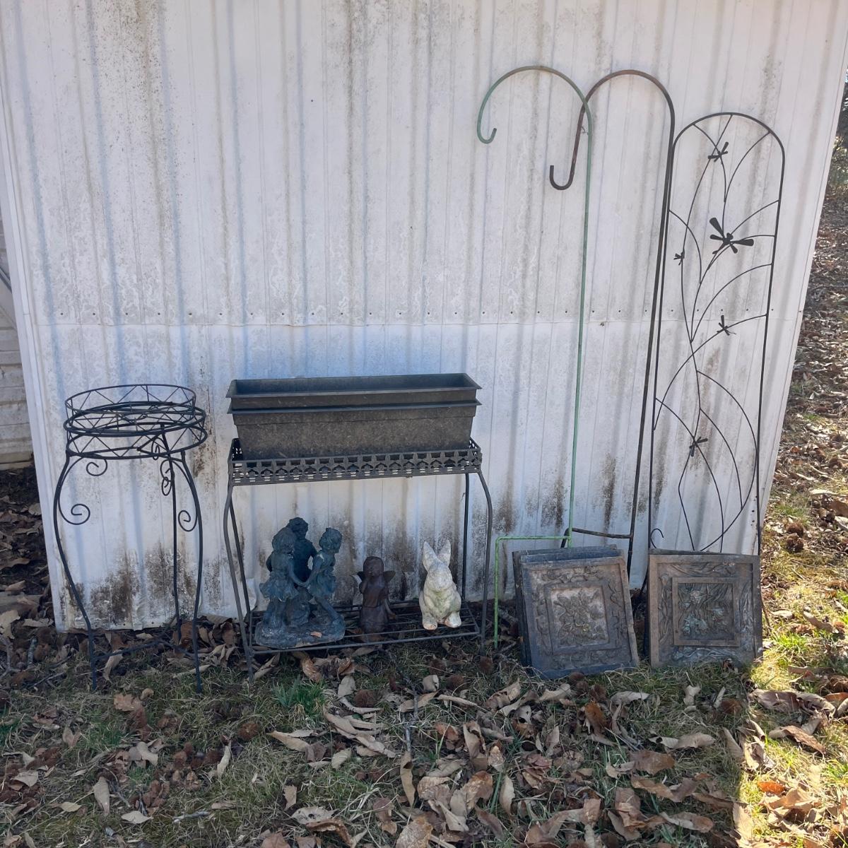 Lot includes two metal plant stands, five resin steps, two iron plant hangers, cement rabbit, resin garden statue, metal angel statue and more. Largest plant stand measures 25” x 10” x 23”H.