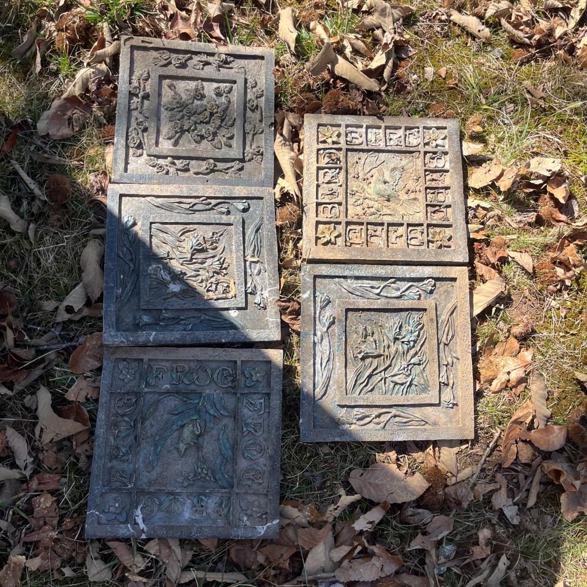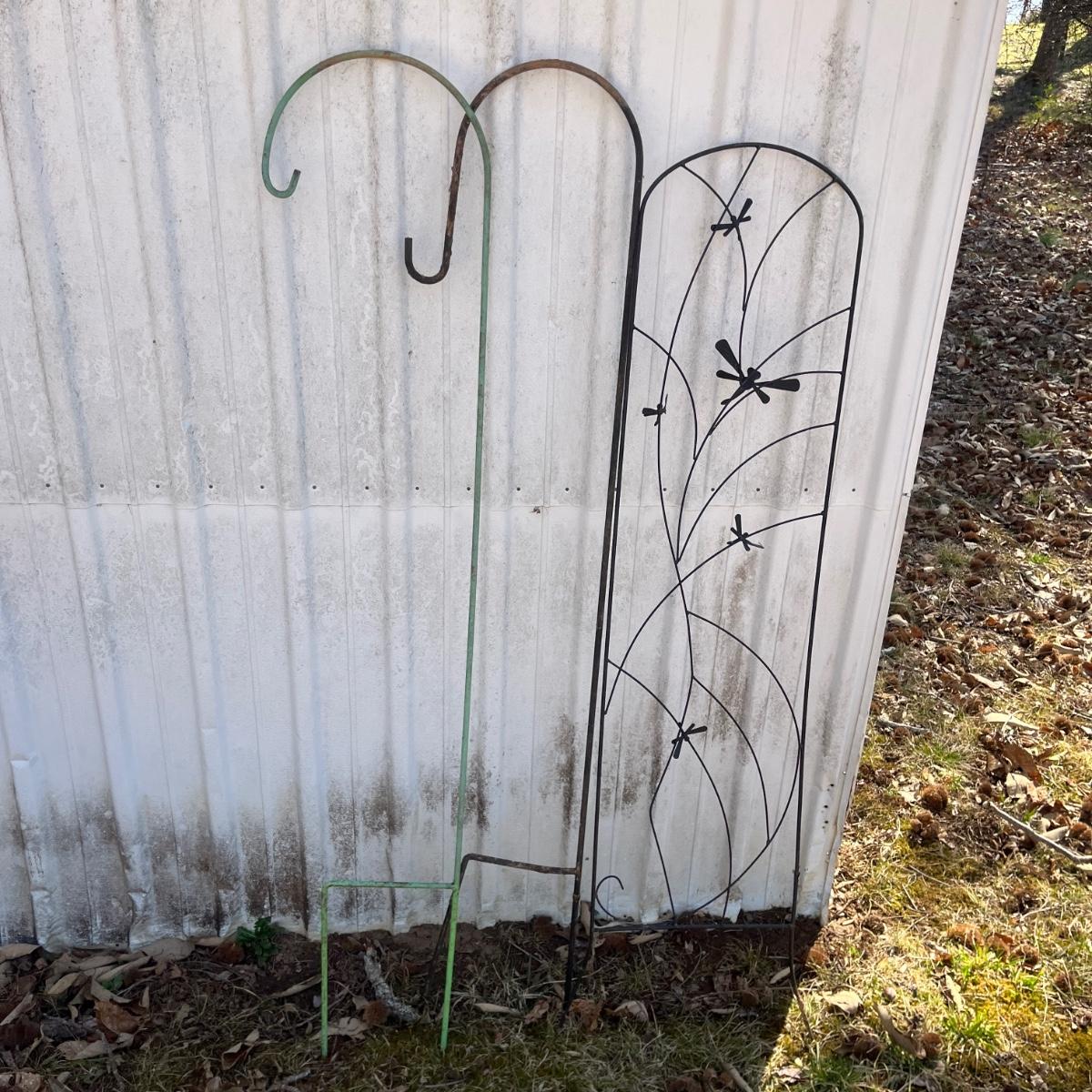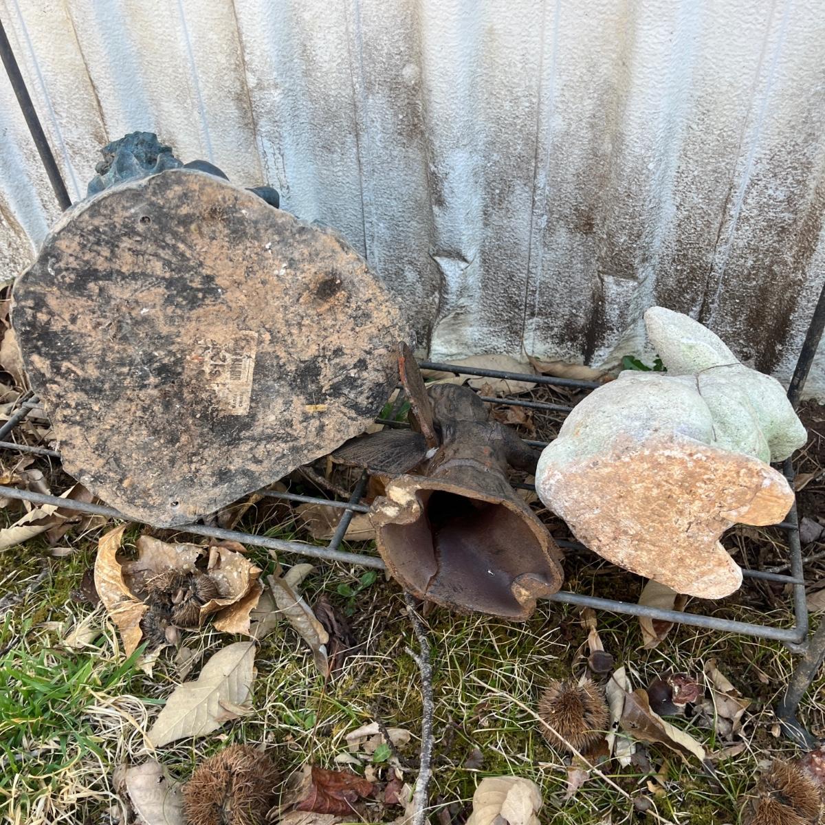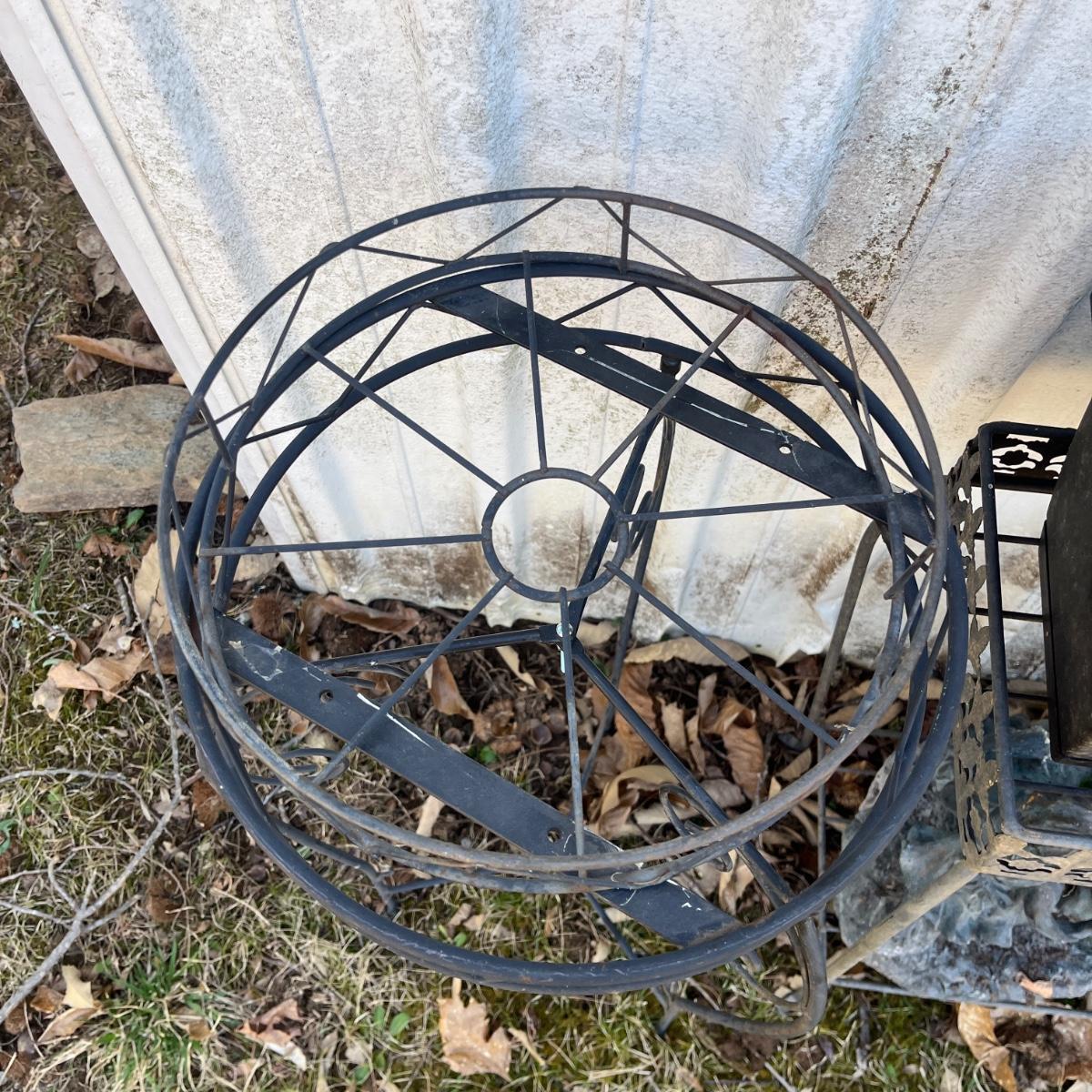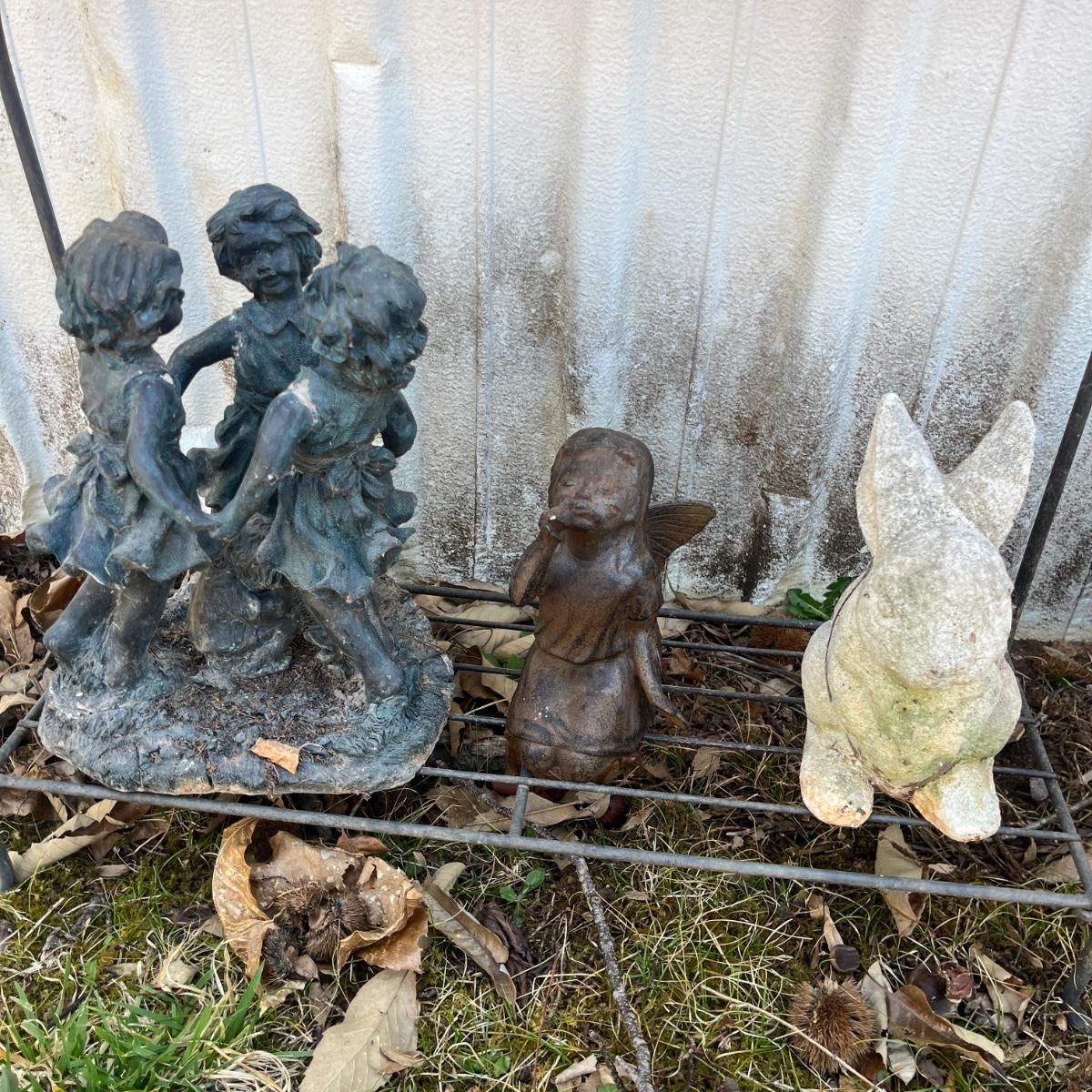 Lot includes two metal plant stands, five resin steps, two iron plant hangers, cement rabbit, resin garden statue, metal angel statue and more. Largest plant stand measures 25” x 10” x 23”H.
