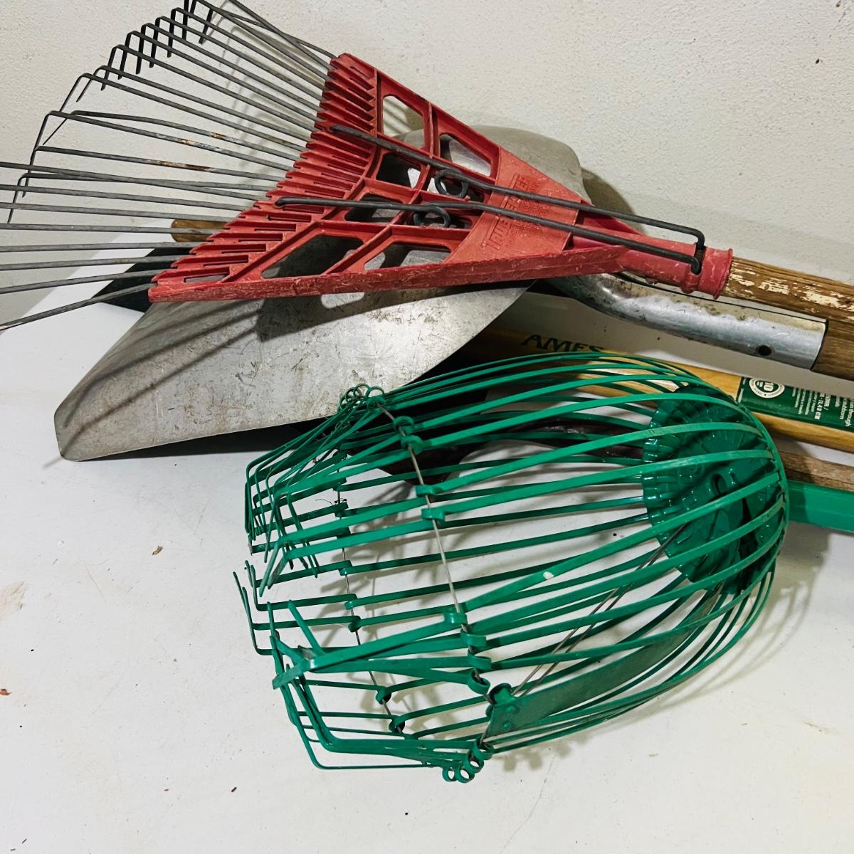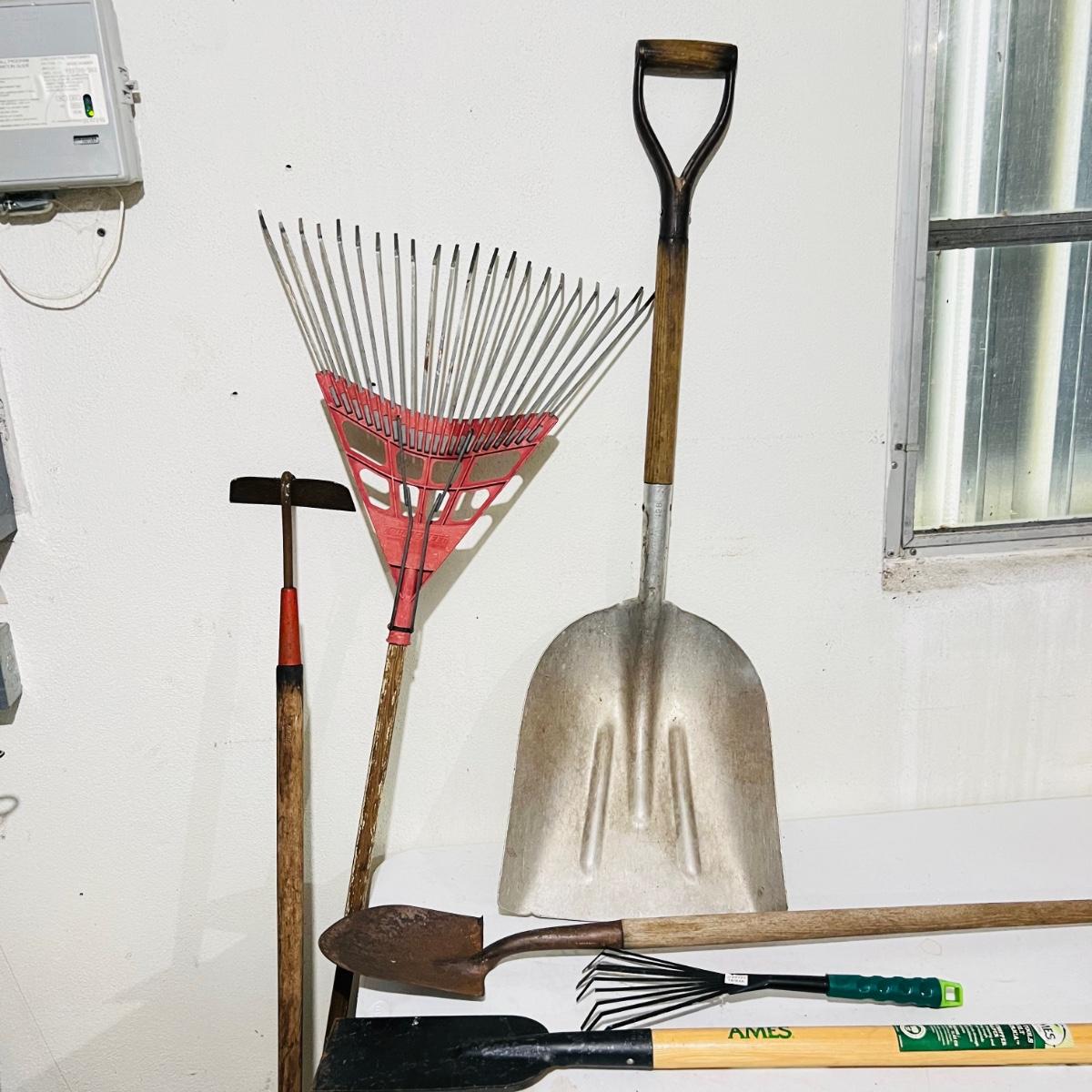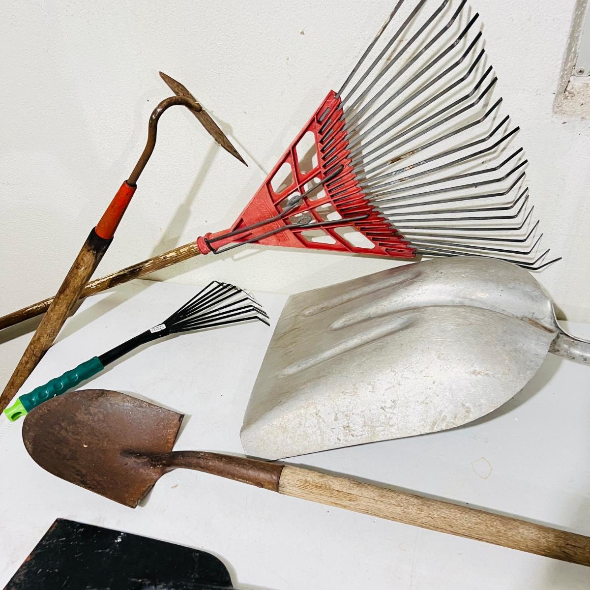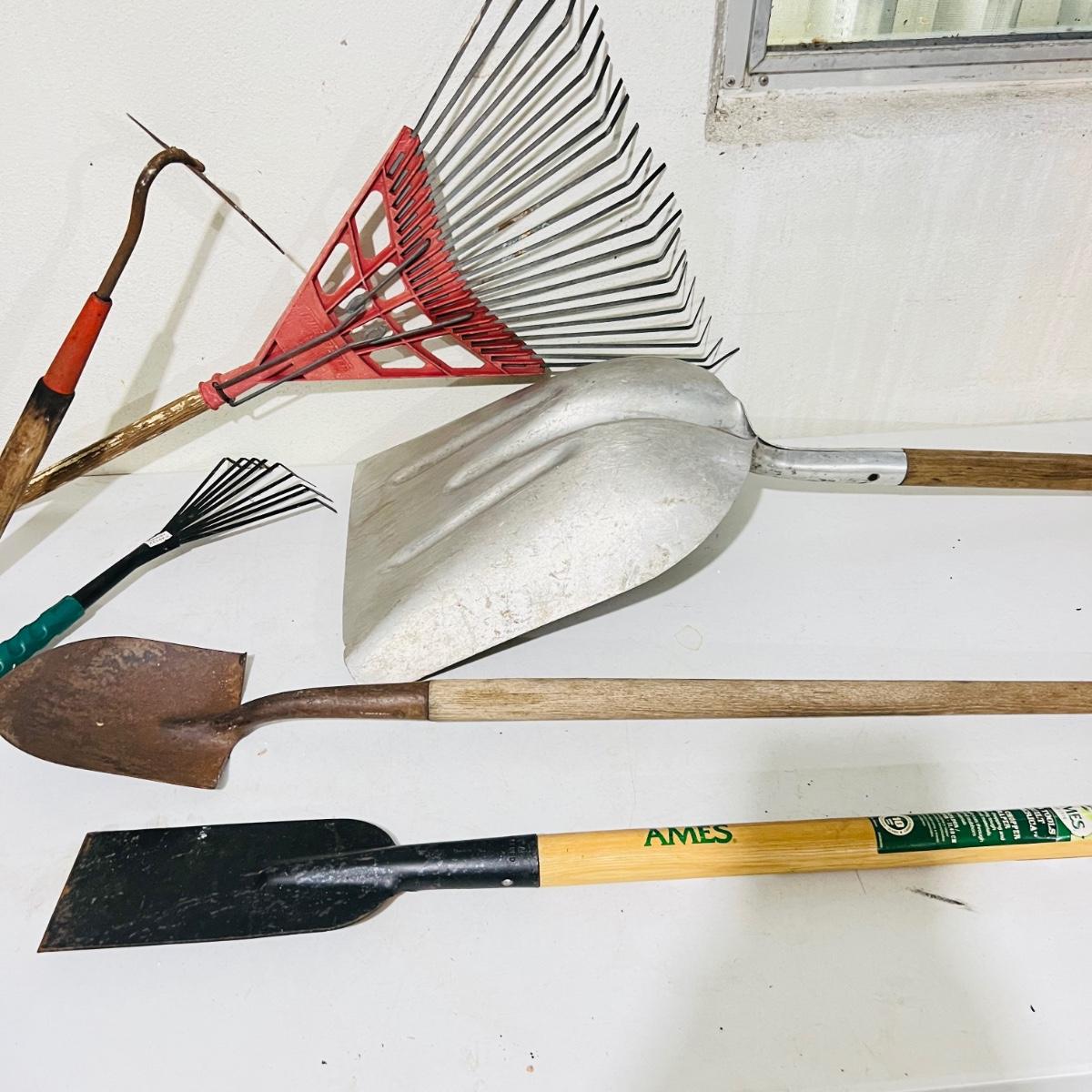 Lot includes a large metal shovel 15”W x 43”L, Rake has wood handle, metal tines and measures 65”L. 4.5”chopper scraper that measures 52”L. Metal hoe and shovel are rusted but sturdy with wood handles and an orange picker. Hand rake also included.