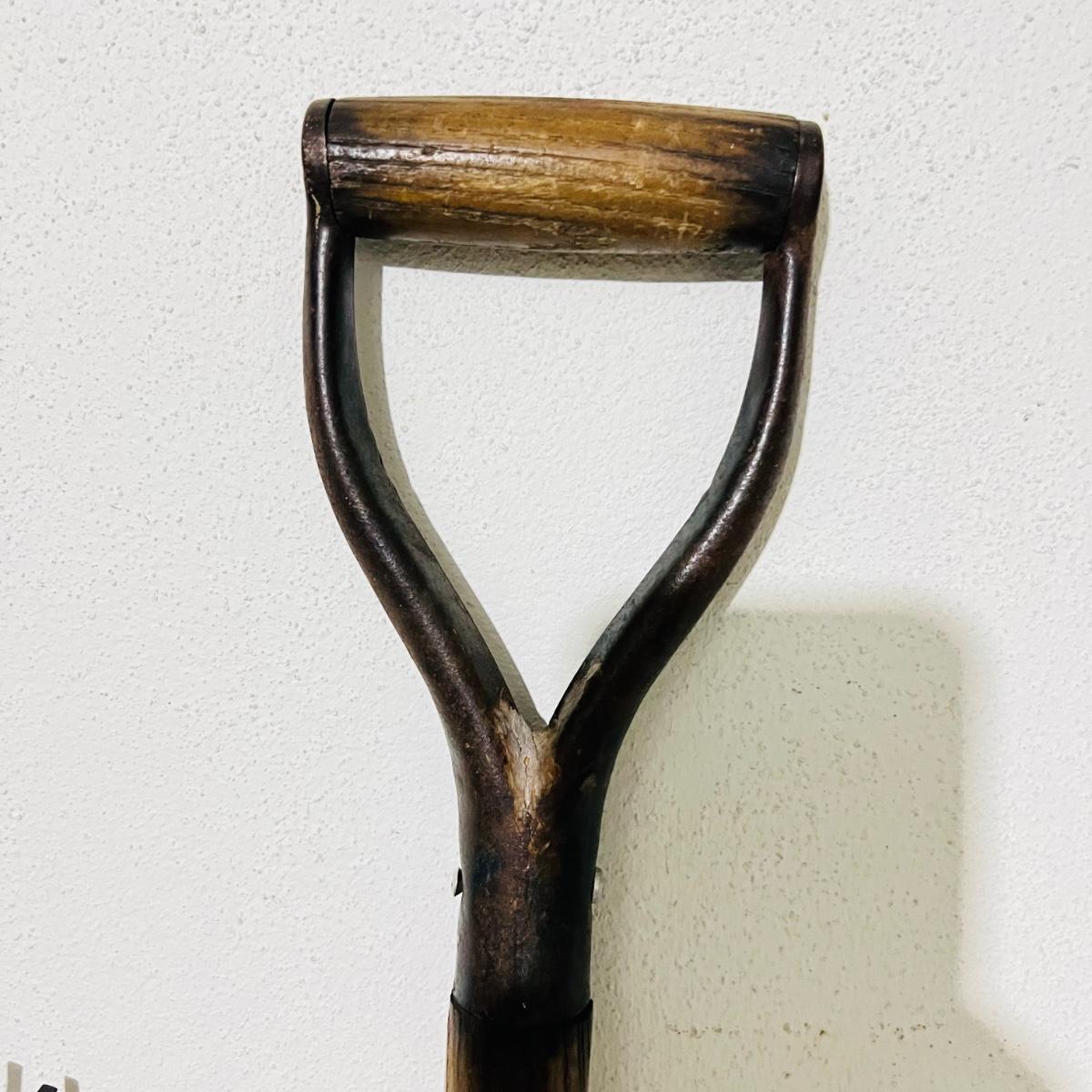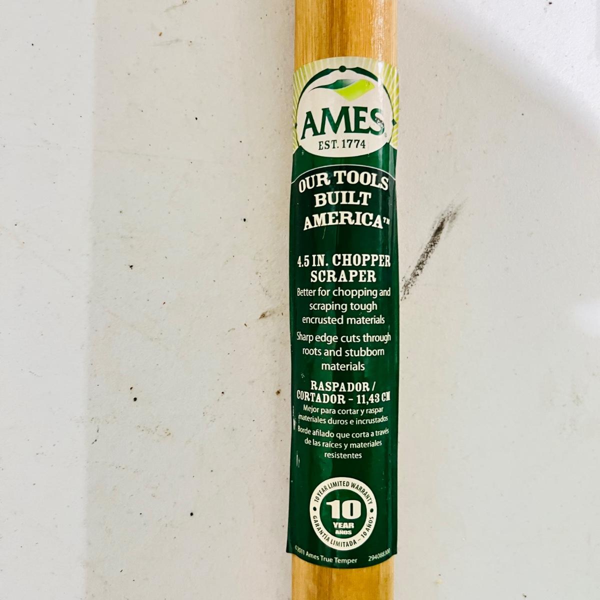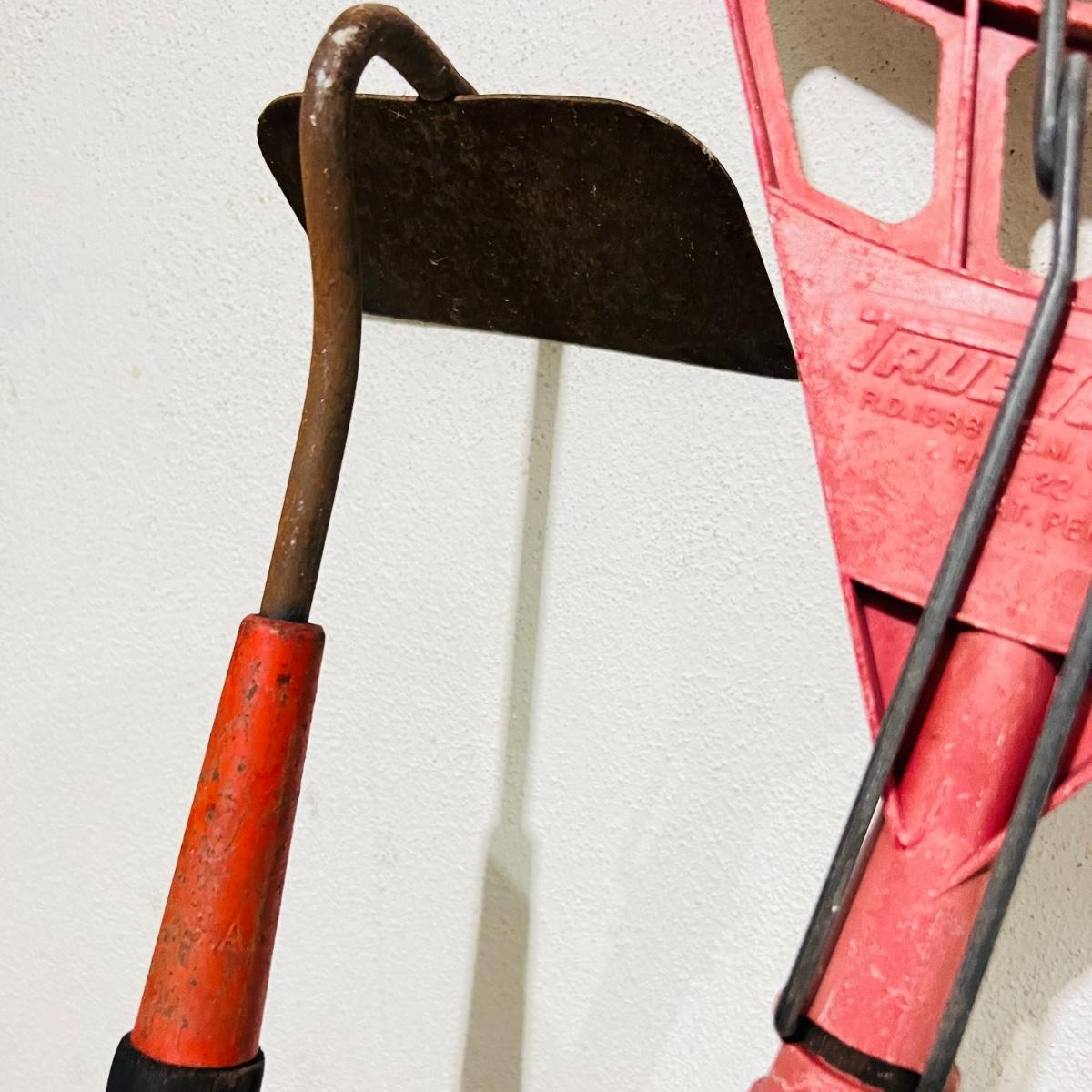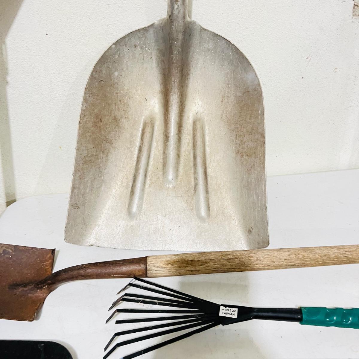Lot includes a large metal shovel 15”W x 43”L, Rake has wood handle, metal tines and measures 65”L. 4.5”chopper scraper that measures 52”L. Metal hoe and shovel are rusted but sturdy with wood handles and an orange picker. Hand rake also included.