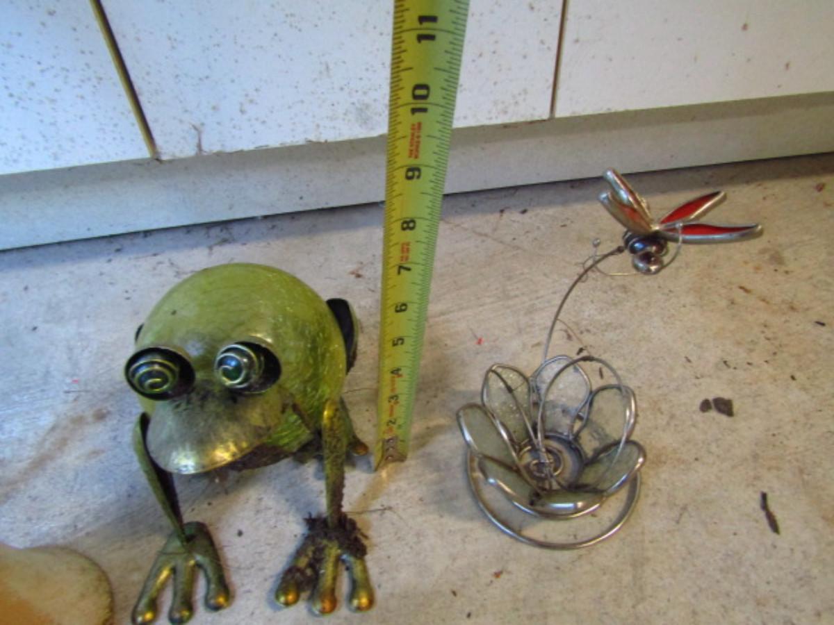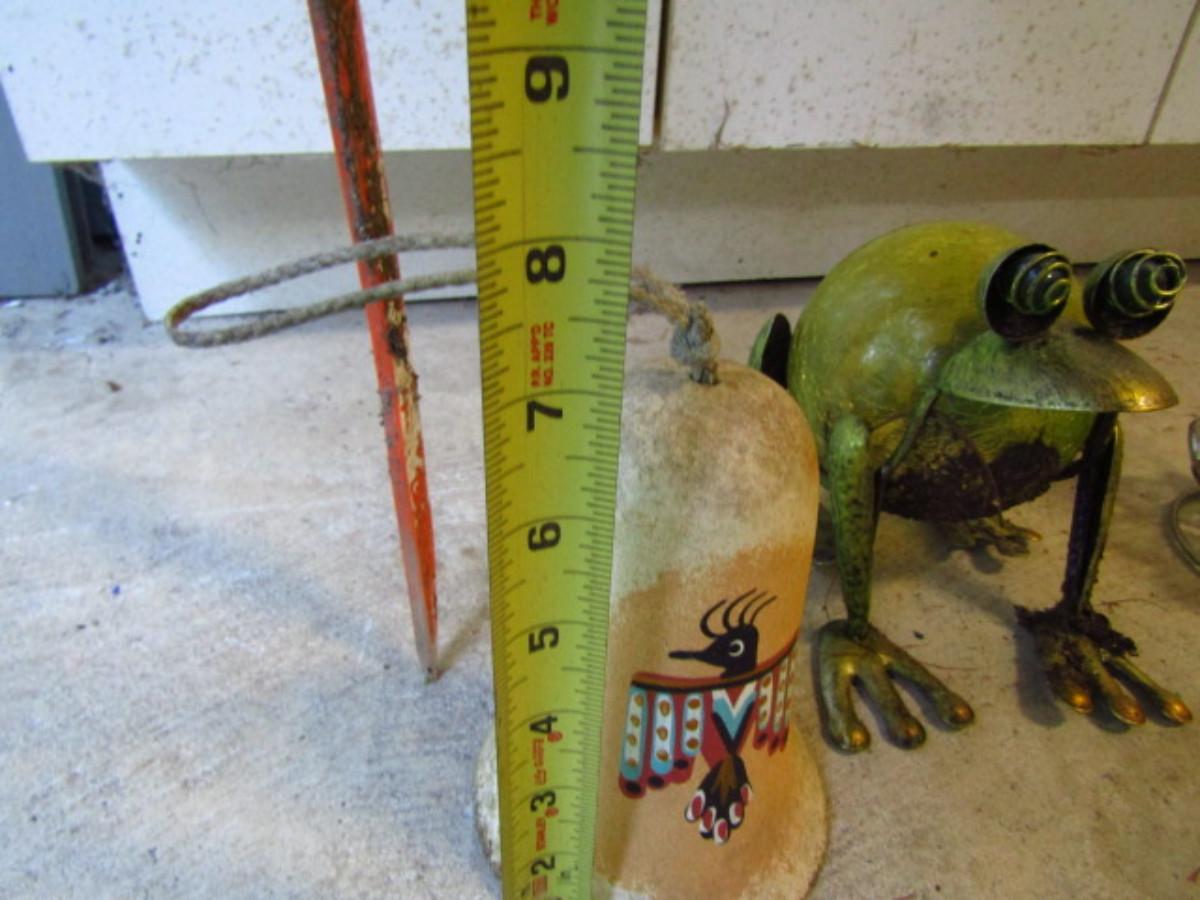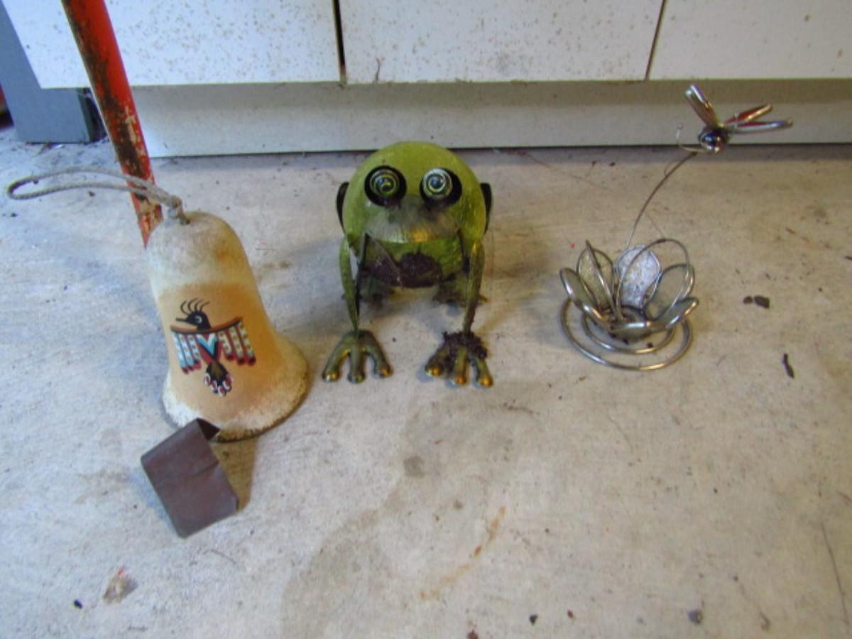 Garden and Patio Decor. Flamingo is PVC. Dragonfly candle holder. Frog looks like maybe it used to have a solar light inside. Painted native American design hanging bell.