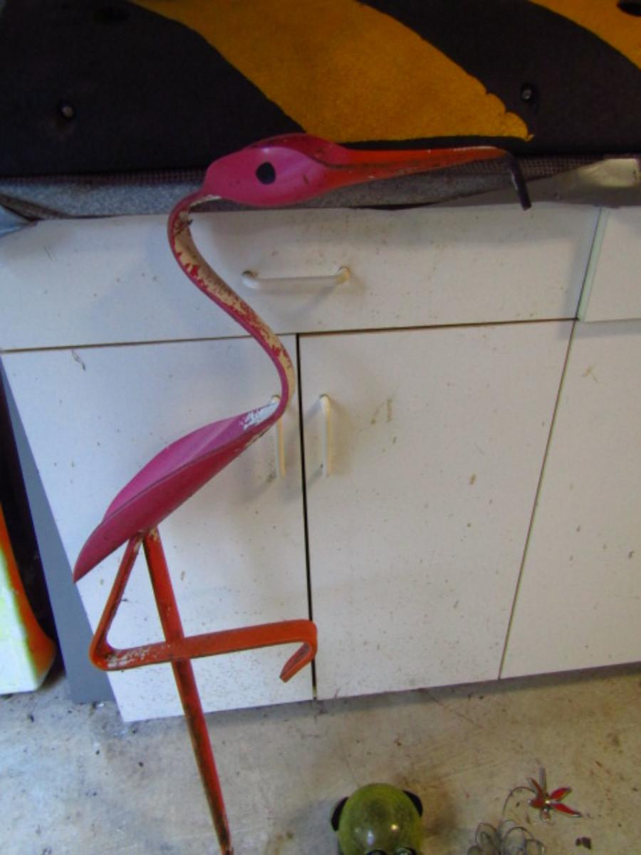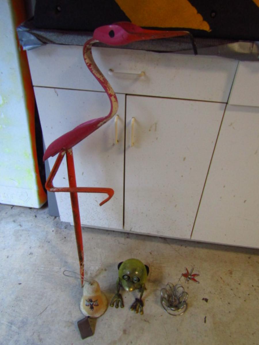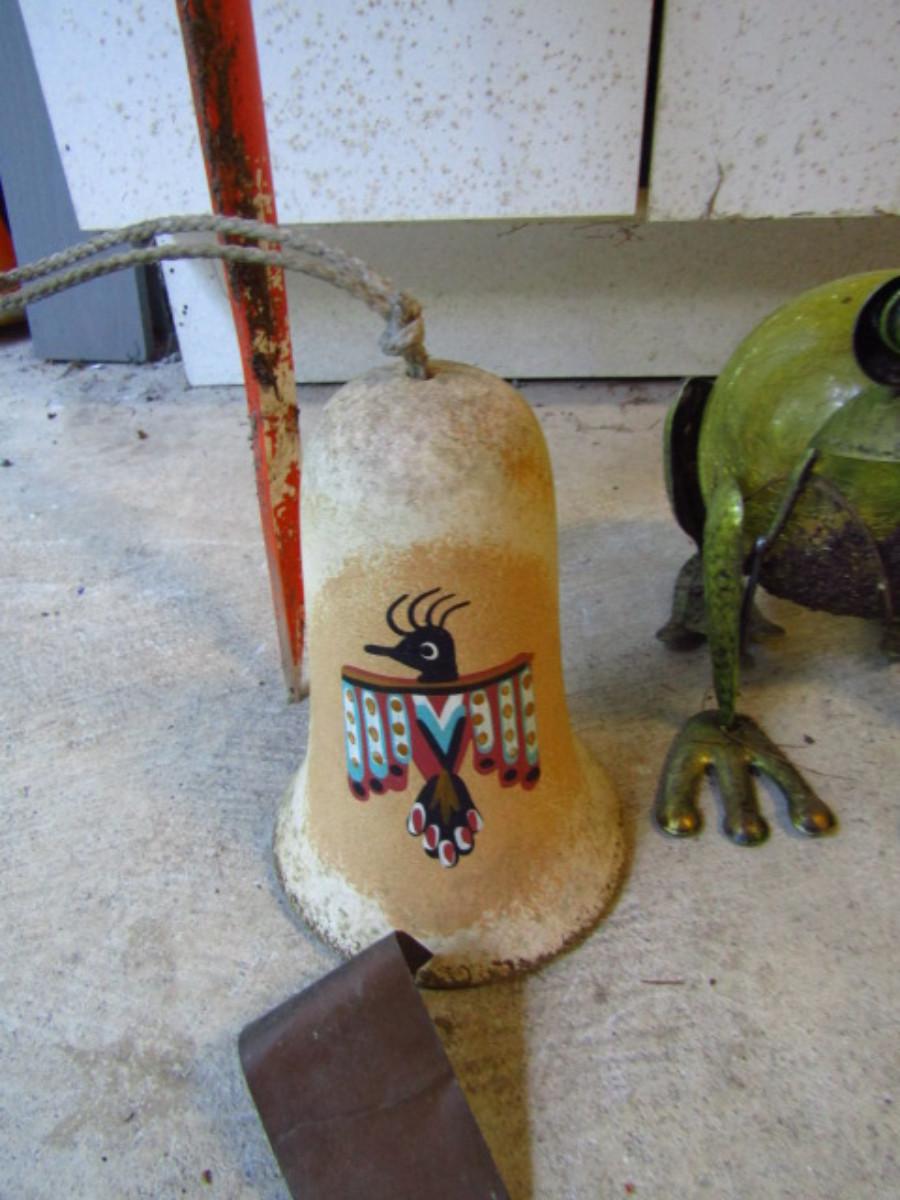 Garden and Patio Decor. Flamingo is PVC. Dragonfly candle holder. Frog looks like maybe it used to have a solar light inside. Painted native American design hanging bell.