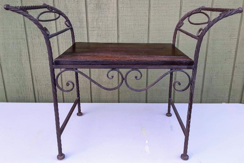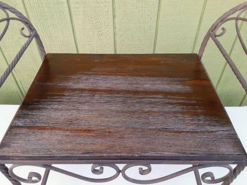 Metal frame and a wooden seat. Measures 31in end to end and the bench is 17in deep.