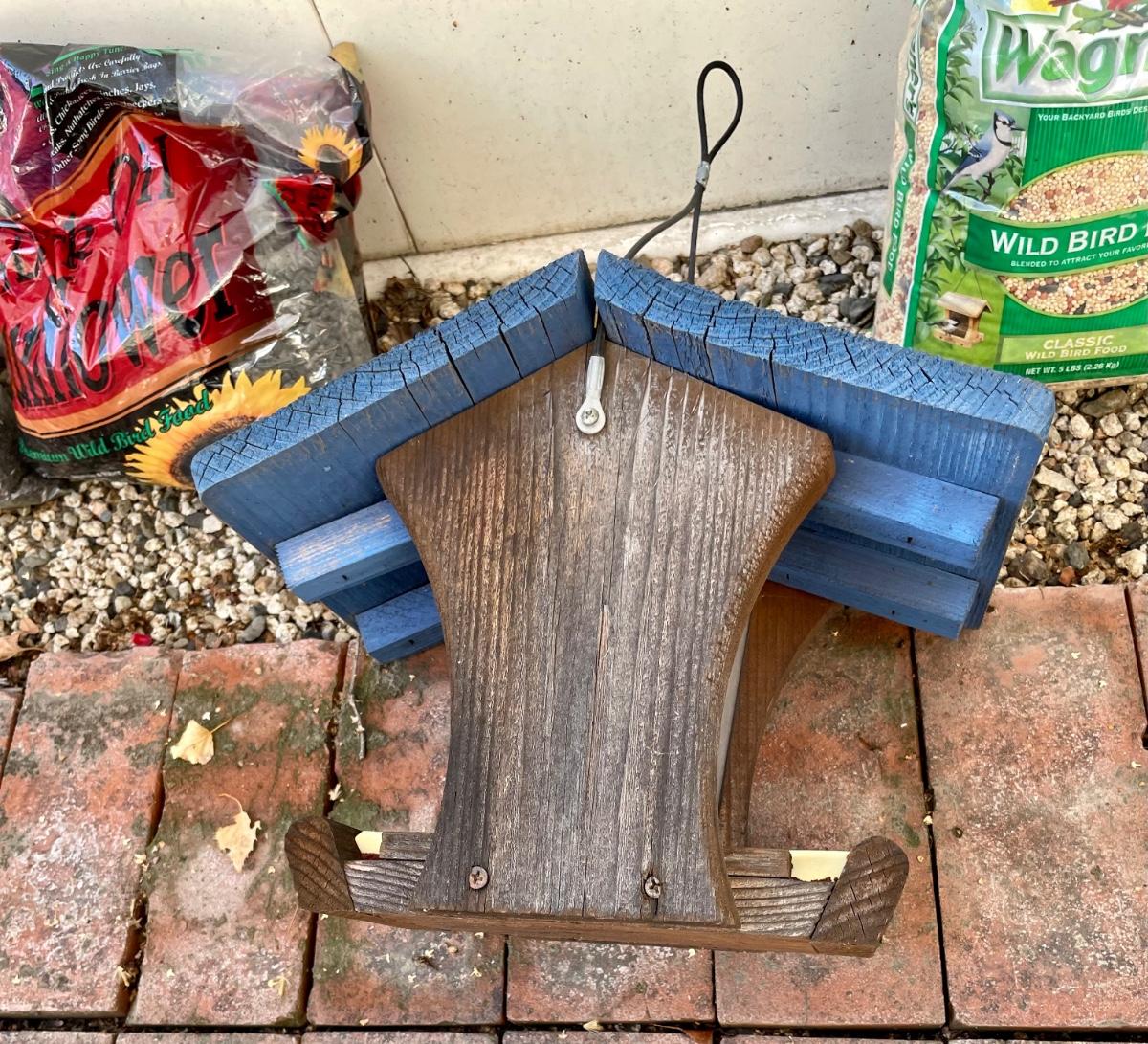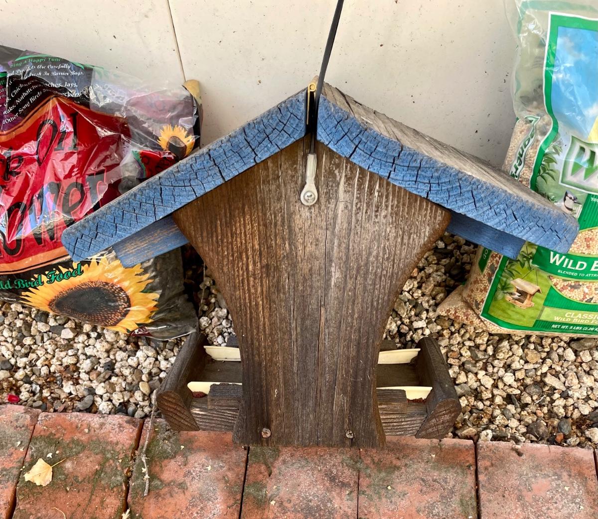 Bird Seed Feeder looks like a birdhouse. Made of wood with hinged too. Includes 3 bags of seed.