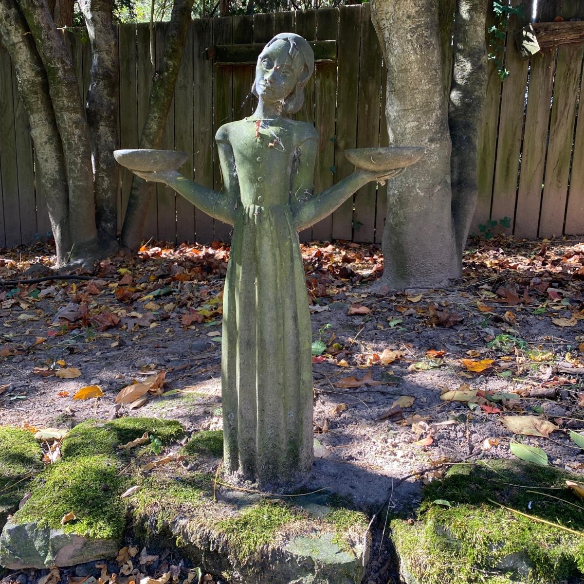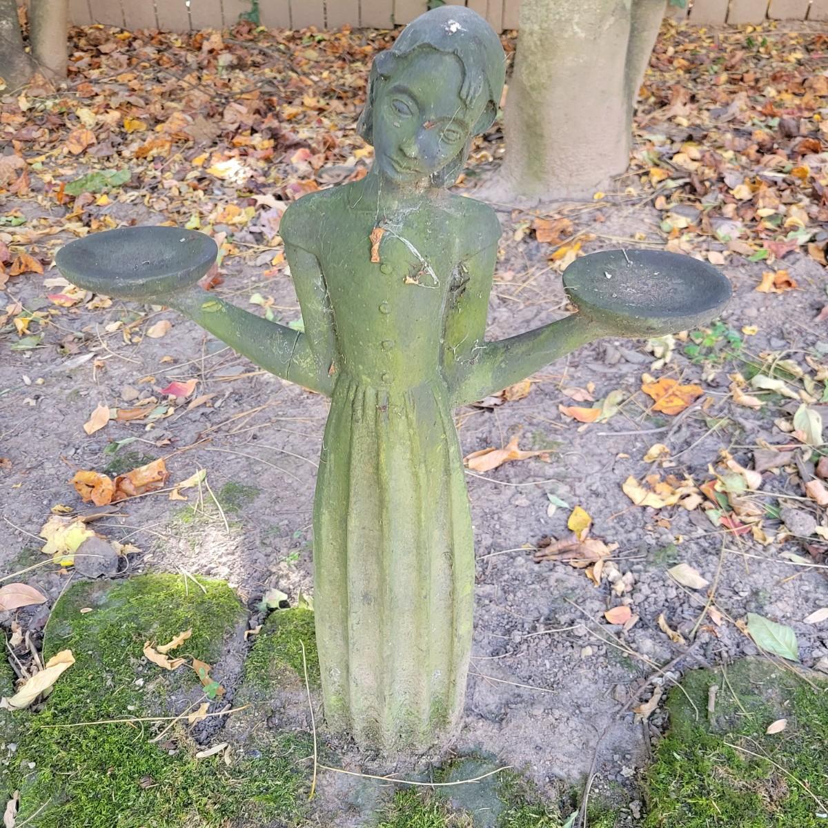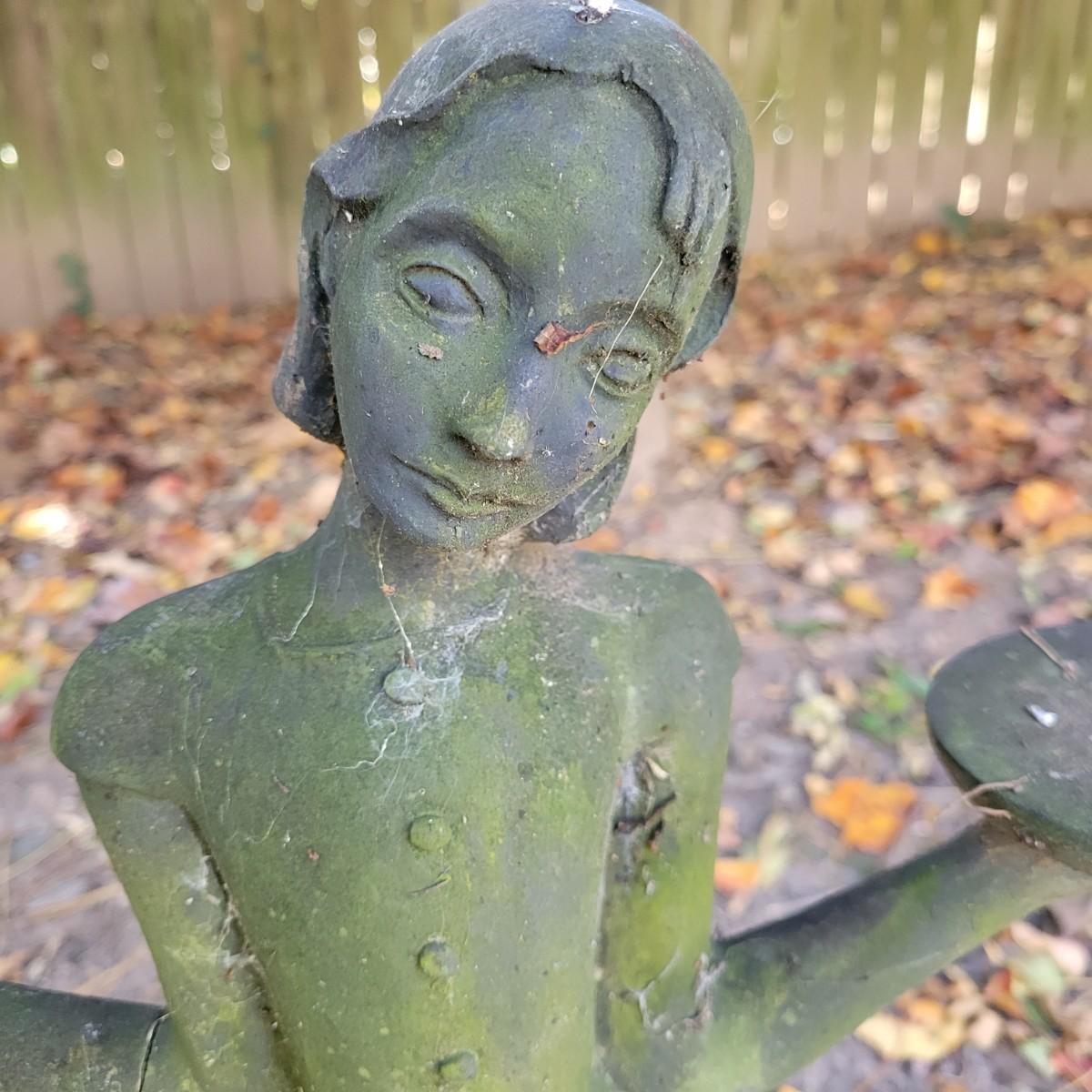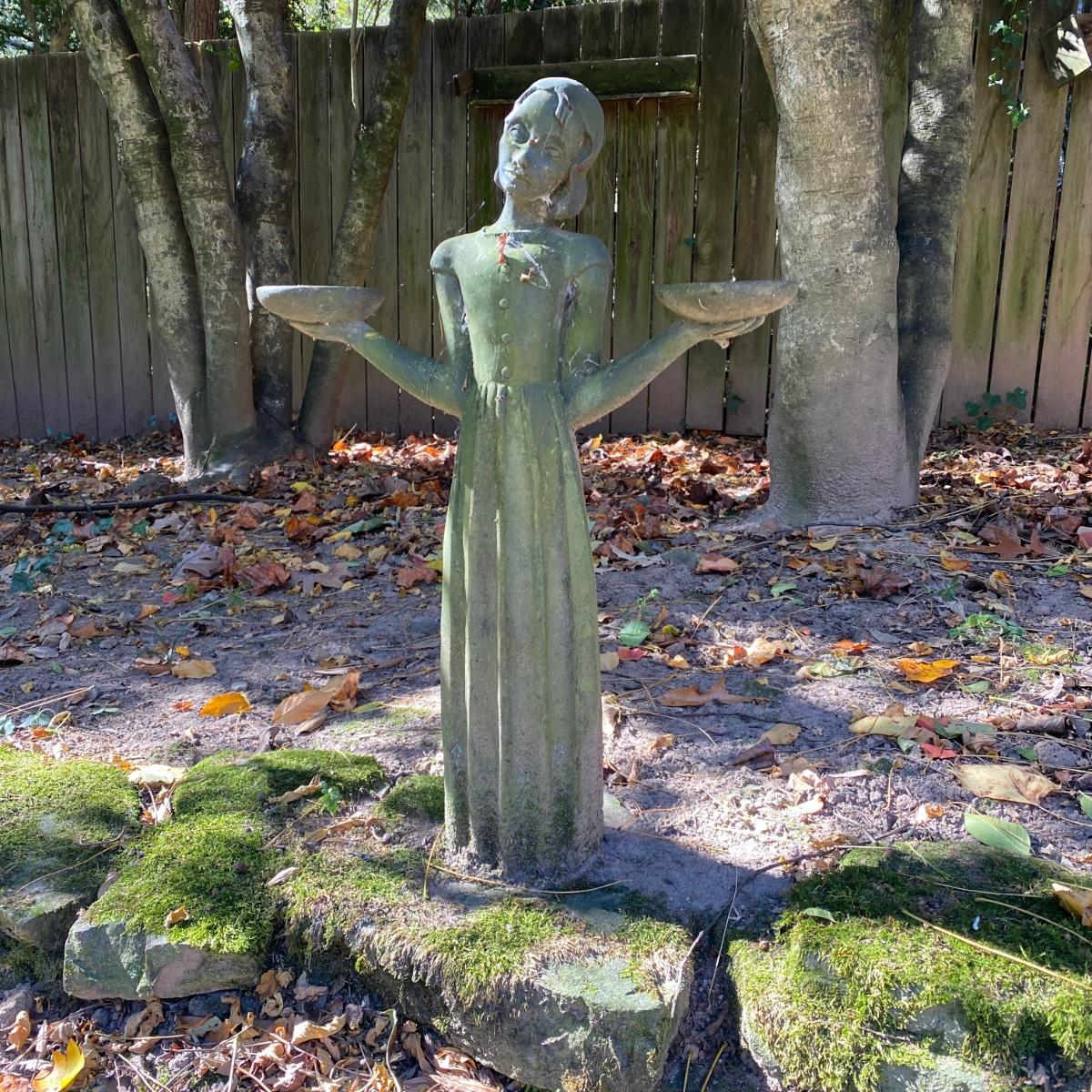 A cement statue of a girl holding two plates for feeding birds. It has a lovely patina from being outside and measures approximately 16.5" x 3" x 24"H. One arm has a crack in it, but appears to be structurally sound. Local pickup only