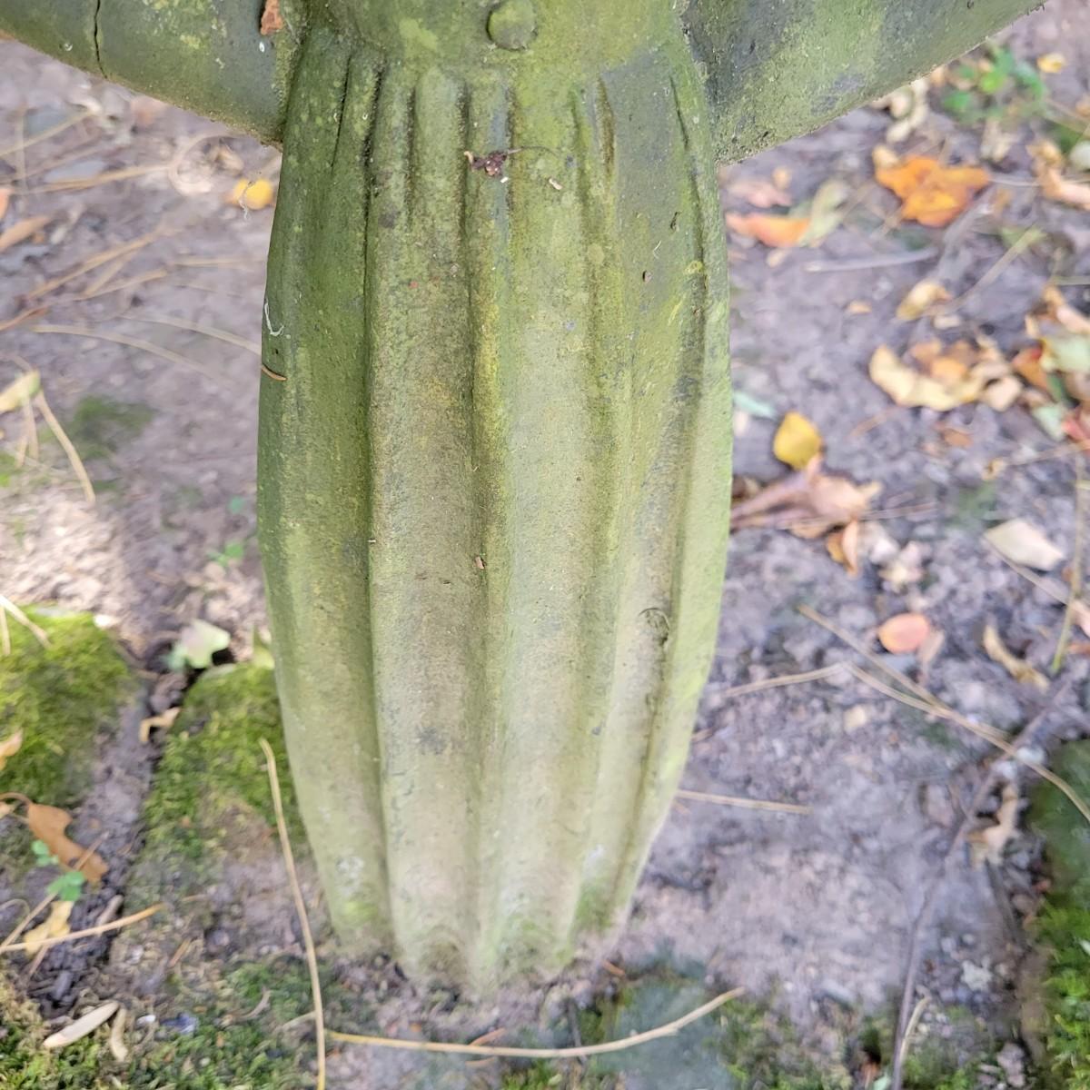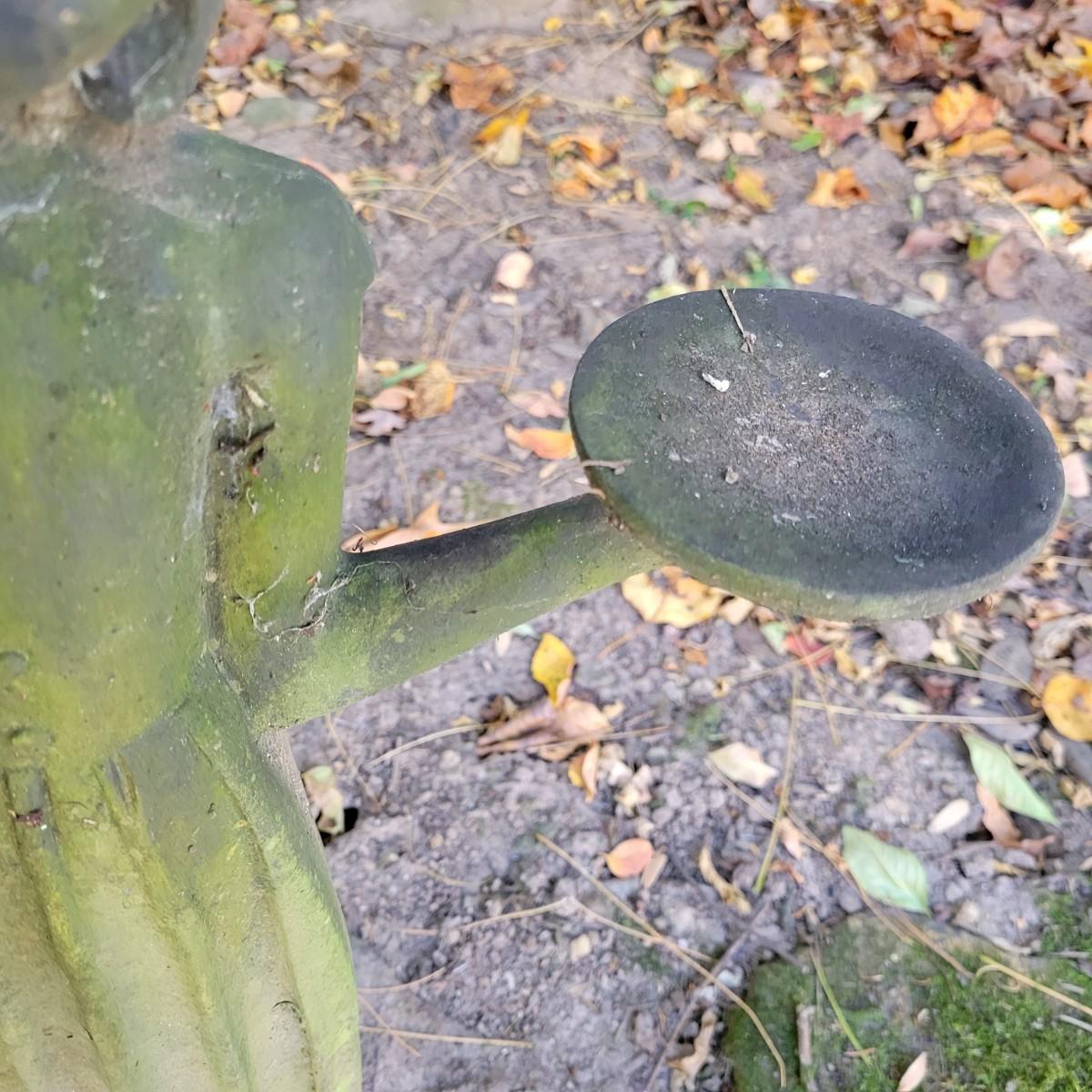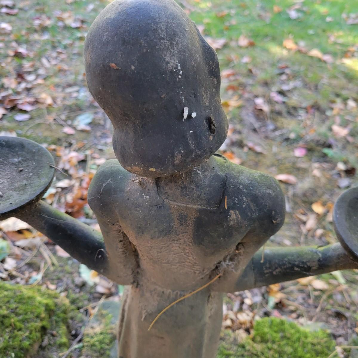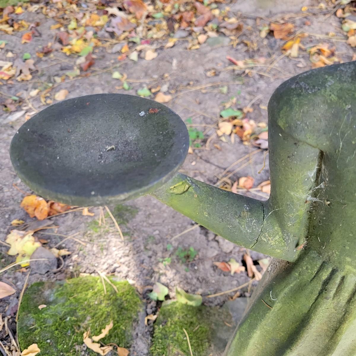 A cement statue of a girl holding two plates for feeding birds. It has a lovely patina from being outside and measures approximately 16.5" x 3" x 24"H. One arm has a crack in it, but appears to be structurally sound. Local pickup only