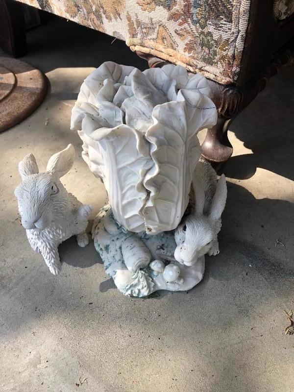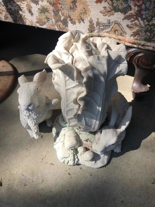 I cannot find any chips or cracks or breakage to this little statue it is heavy but it is not made of cement and the one bunny is separate and not attached to the statue which I am including it looks like a statue itself has lost coloring and has now become all white so please make a note of that before bidding.I cannot find any chips or cracks or breakage to this little statue it is heavy but it is not made of cement and the one bunny is separate and not attached to the statue which I am including it looks like the statue itself has lost coloring and has now become all white so please make a note of that before bidding