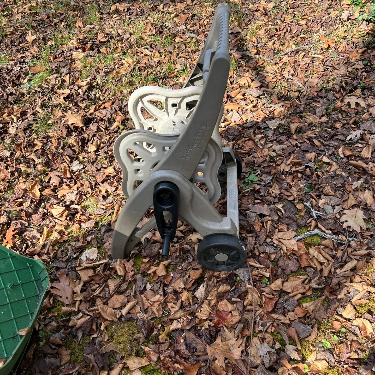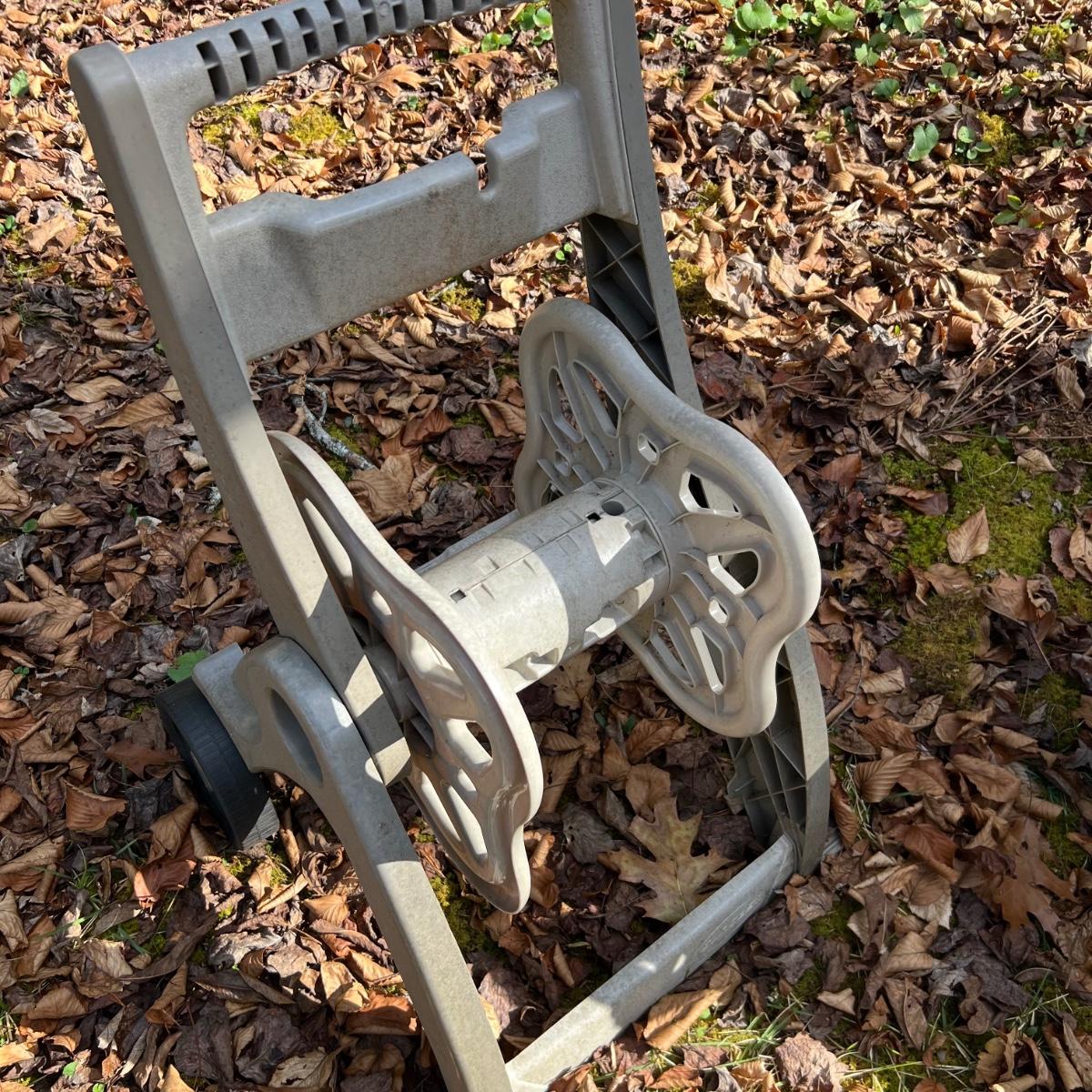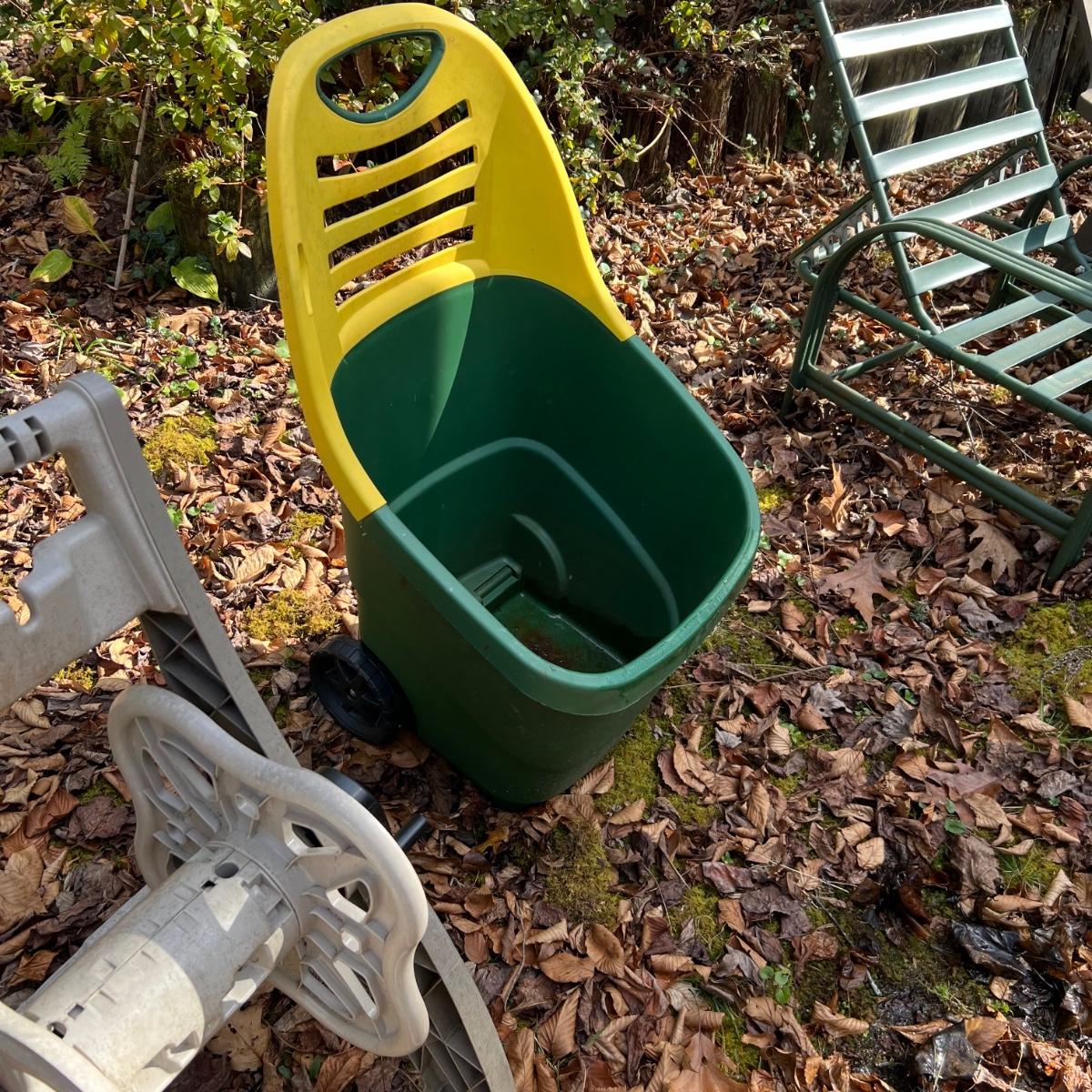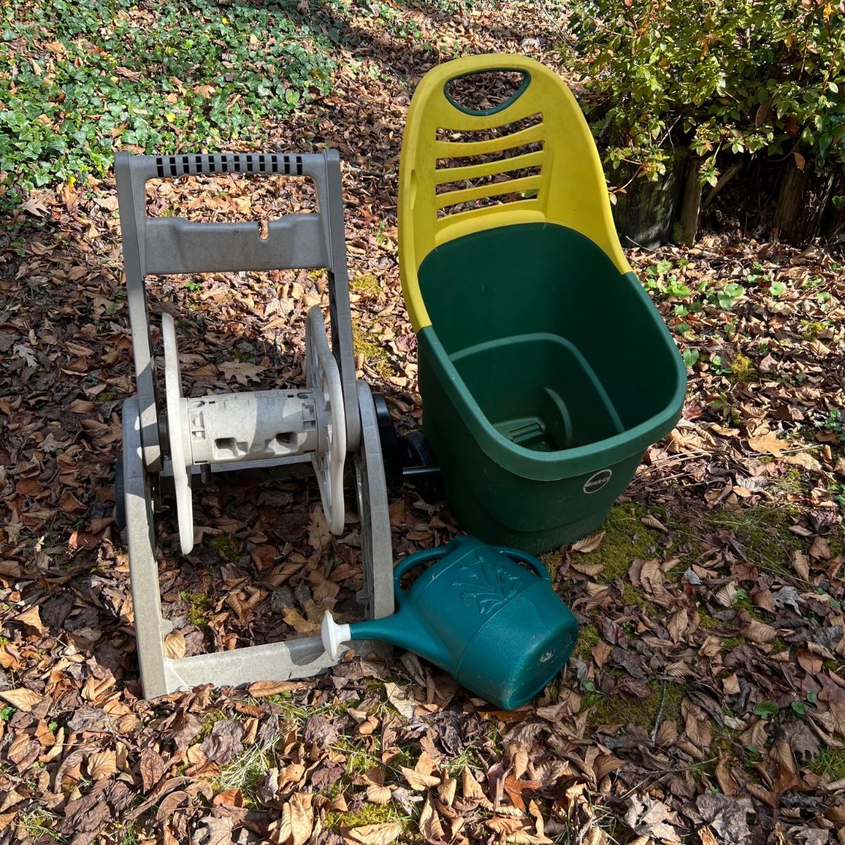 Three useful items for yard work includes a plastic green garden cart on two wheels, a plastic watering can and a hose reel.