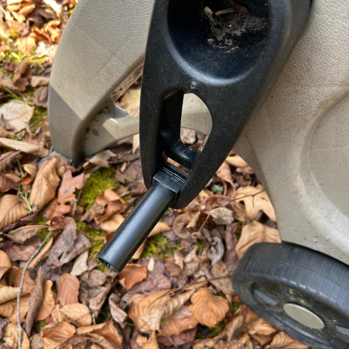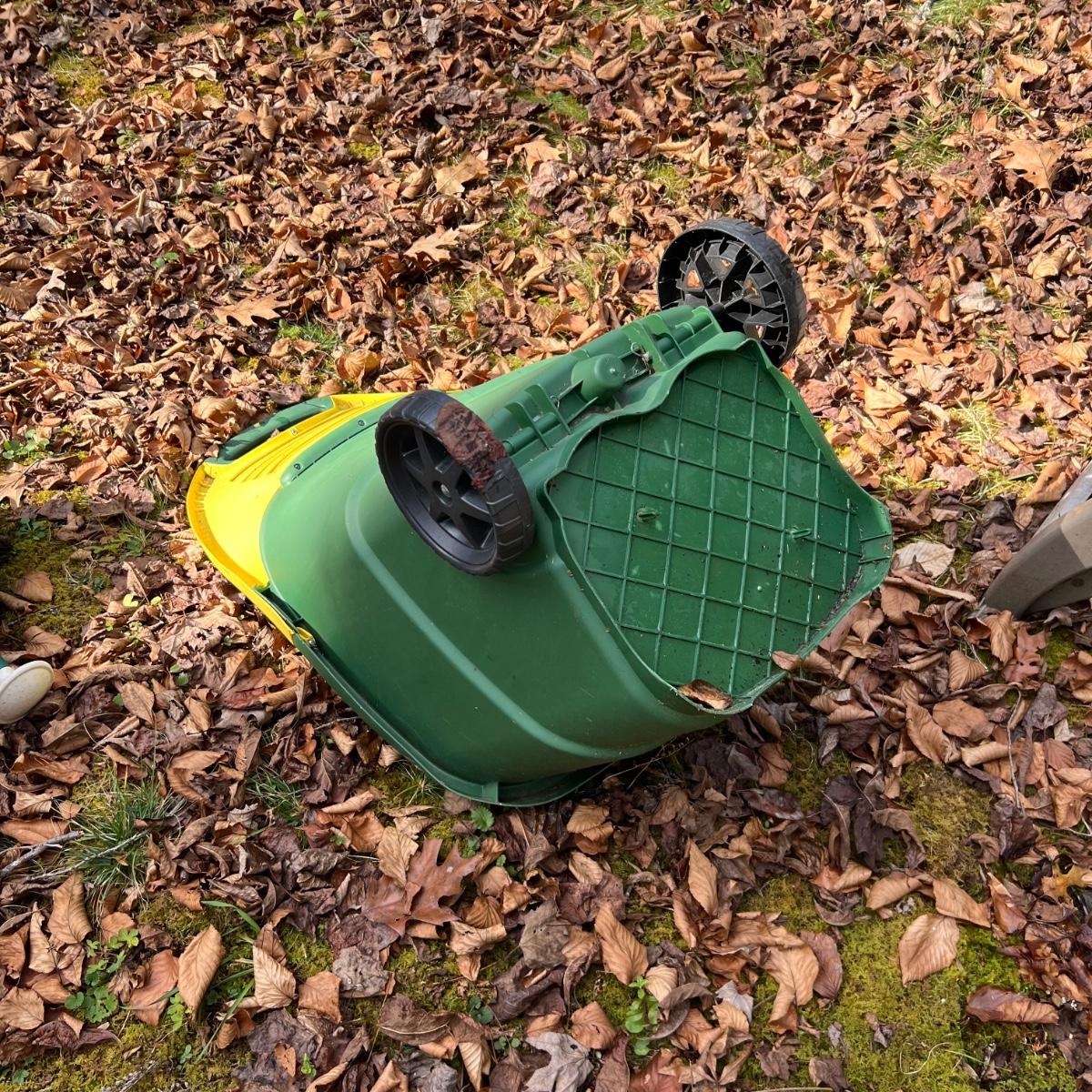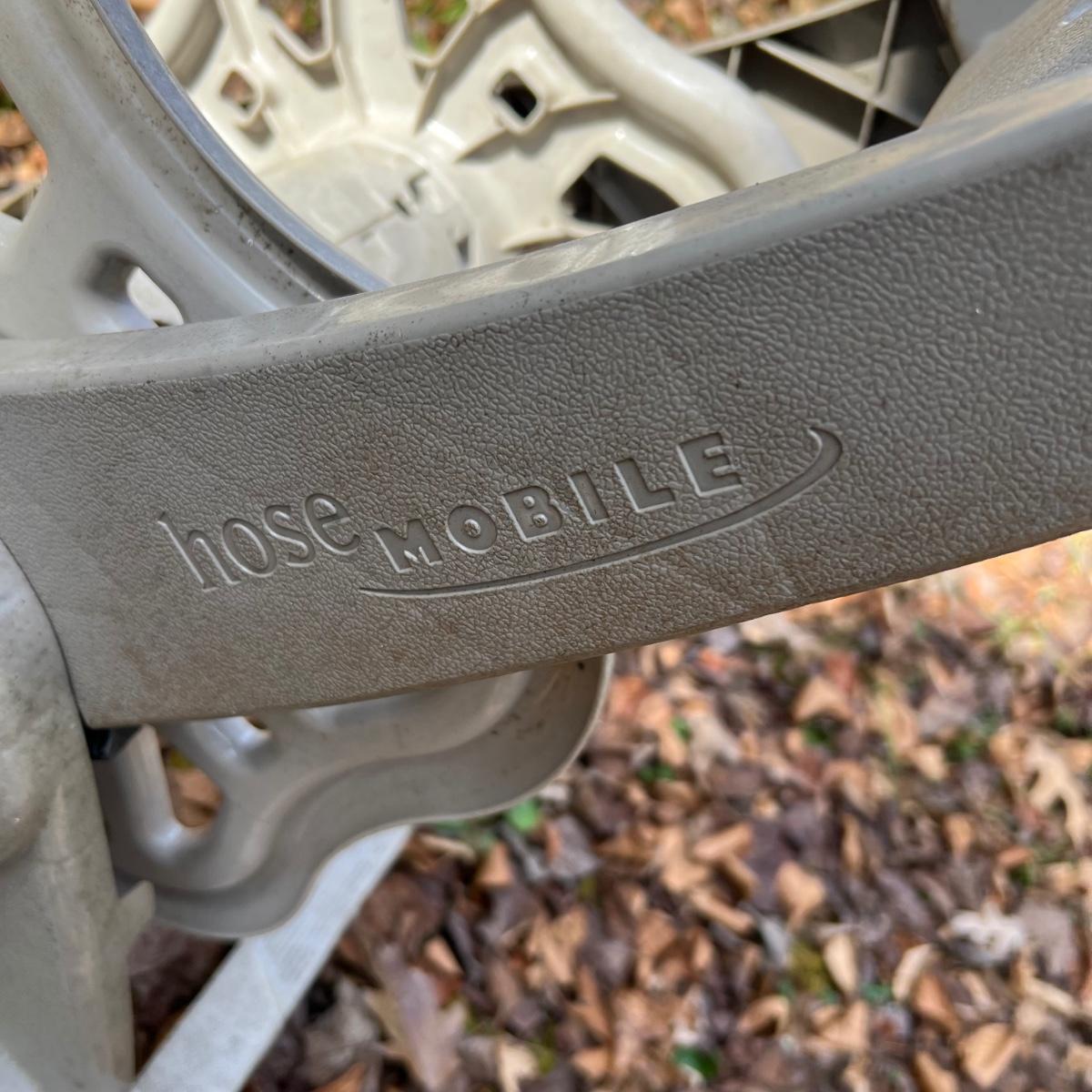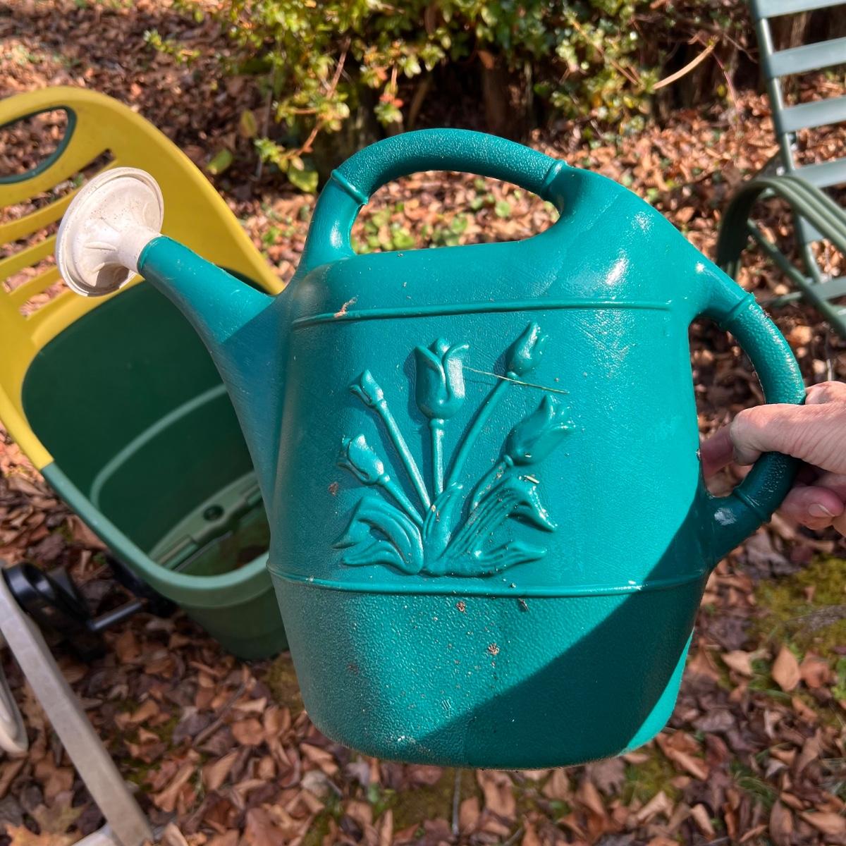 Three useful items for yard work includes a plastic green garden cart on two wheels, a plastic watering can and a hose reel.