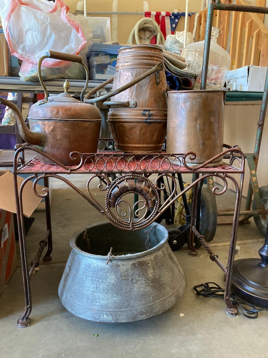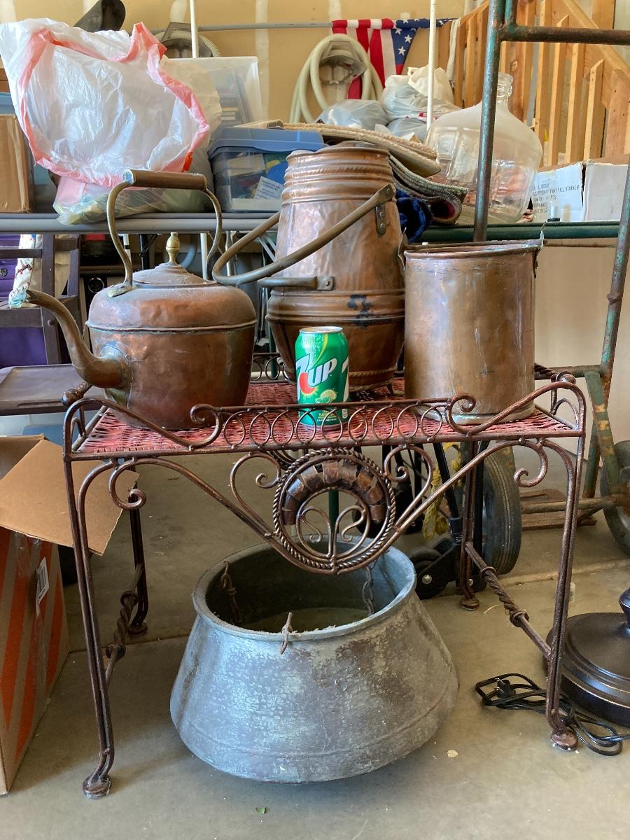 #372 Garden Collection: Garden Table, 3 Vintage Pots, I Large Metal Hanging Pot Lot of 5