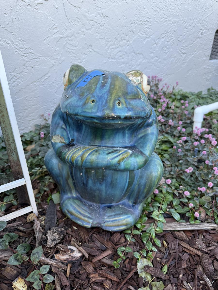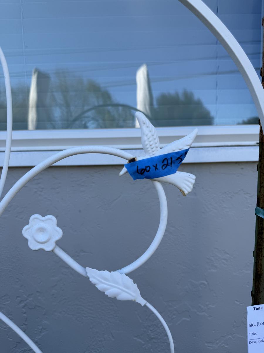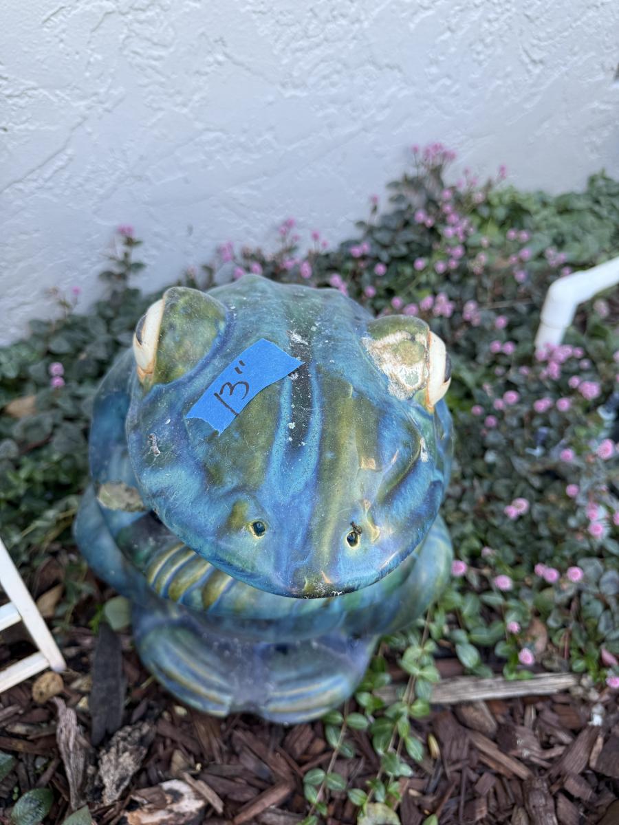 Trellises 60x21.5, frog statue 13”, mosaic pot and porcelain pot.