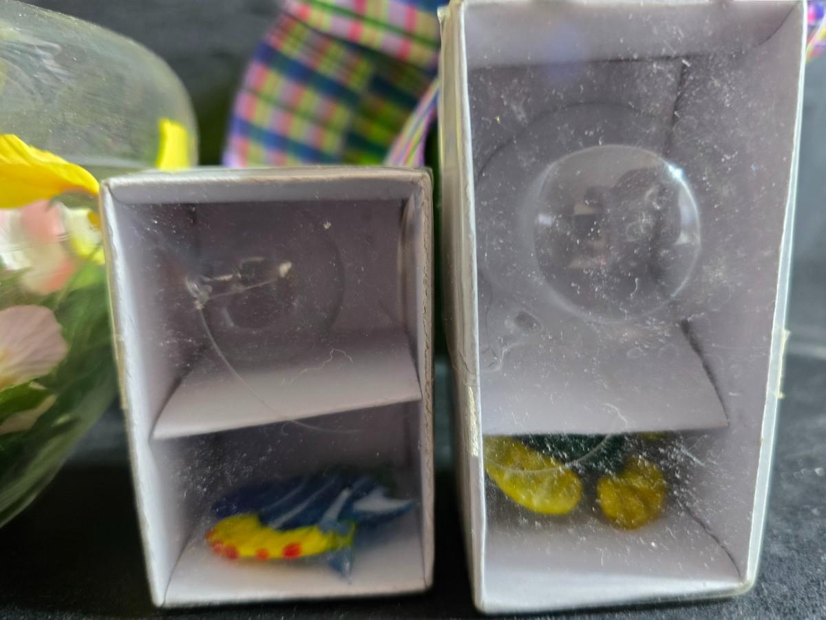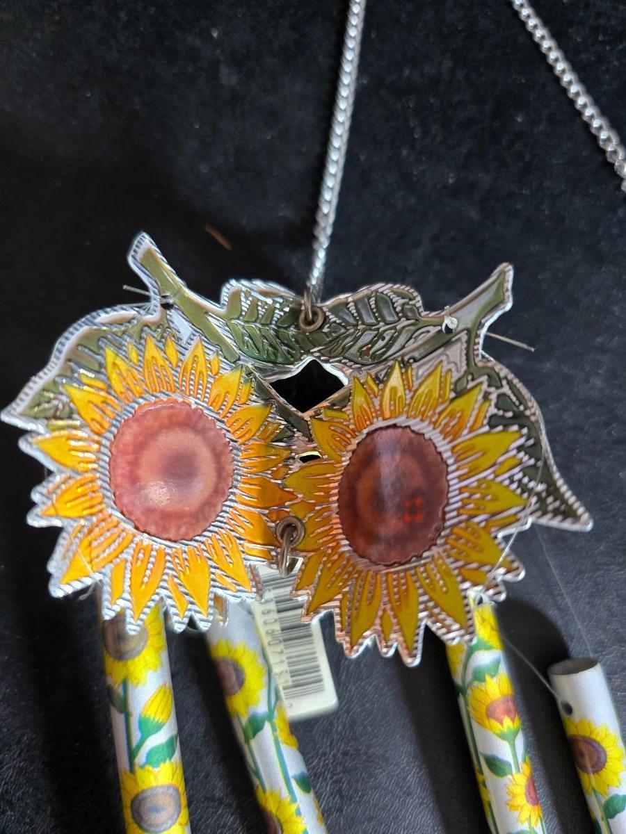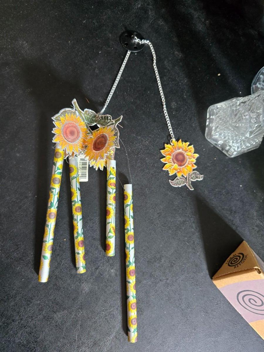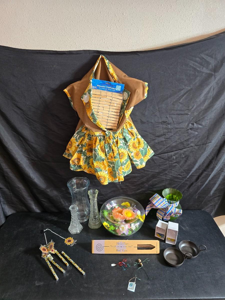 Garden decor - Hanging clothesline bag with new pins - Sunflower wind chime - floating fish - vases and more