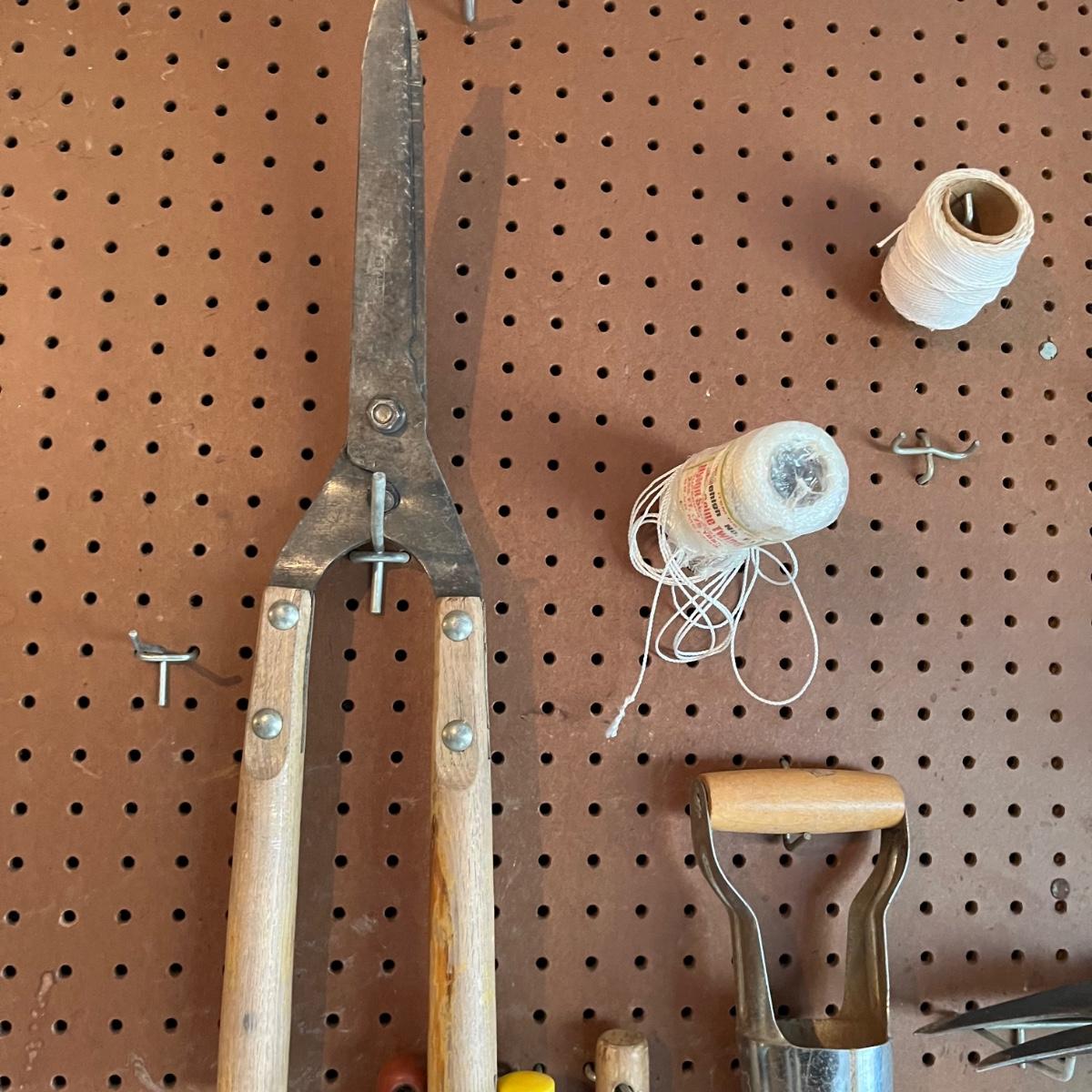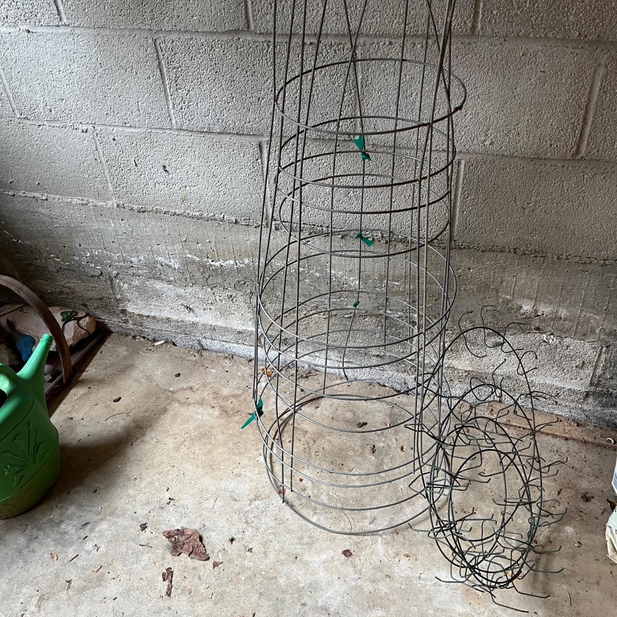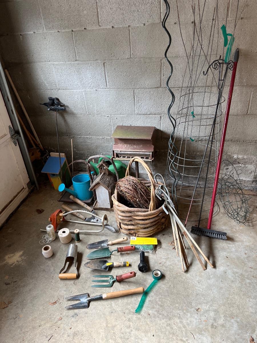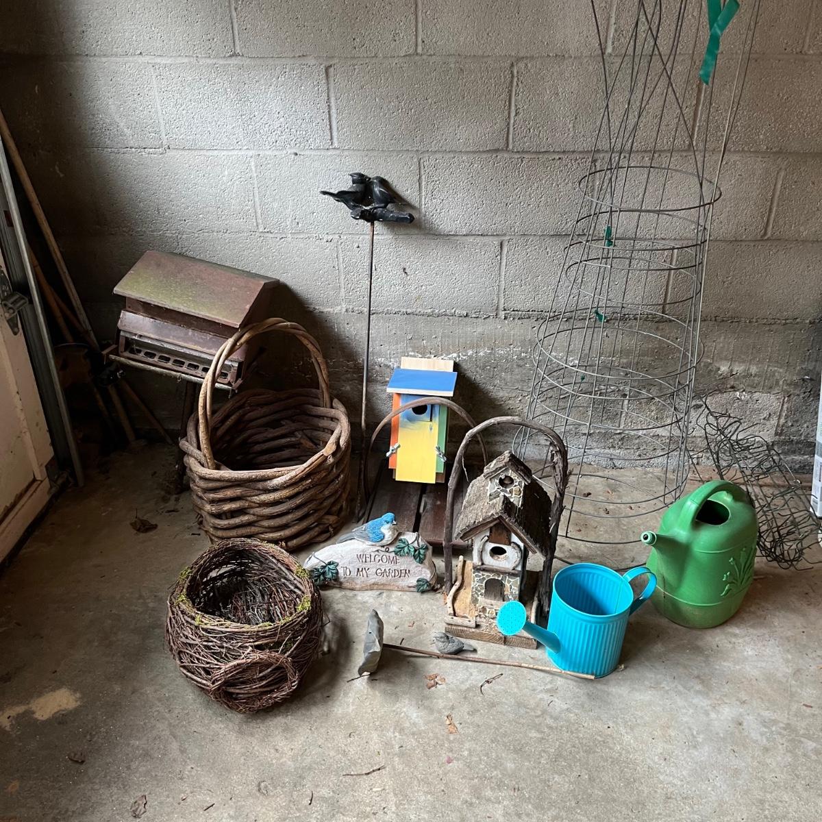 Lot contains a assortment of garden essentials including wooden birdhouses, woven basket, tomato cages, hedge trimmers, sprinkler, hand fork and shovel, bird decorations and more. Largest basket measures 17”D x 22” tall. Local Pickup Only
