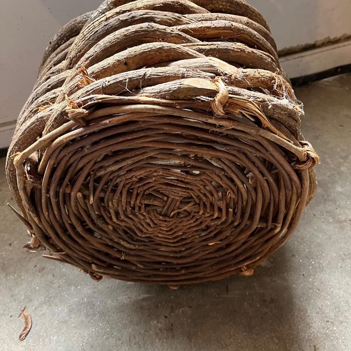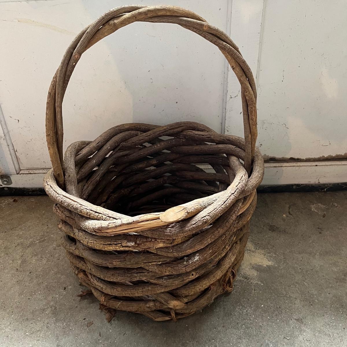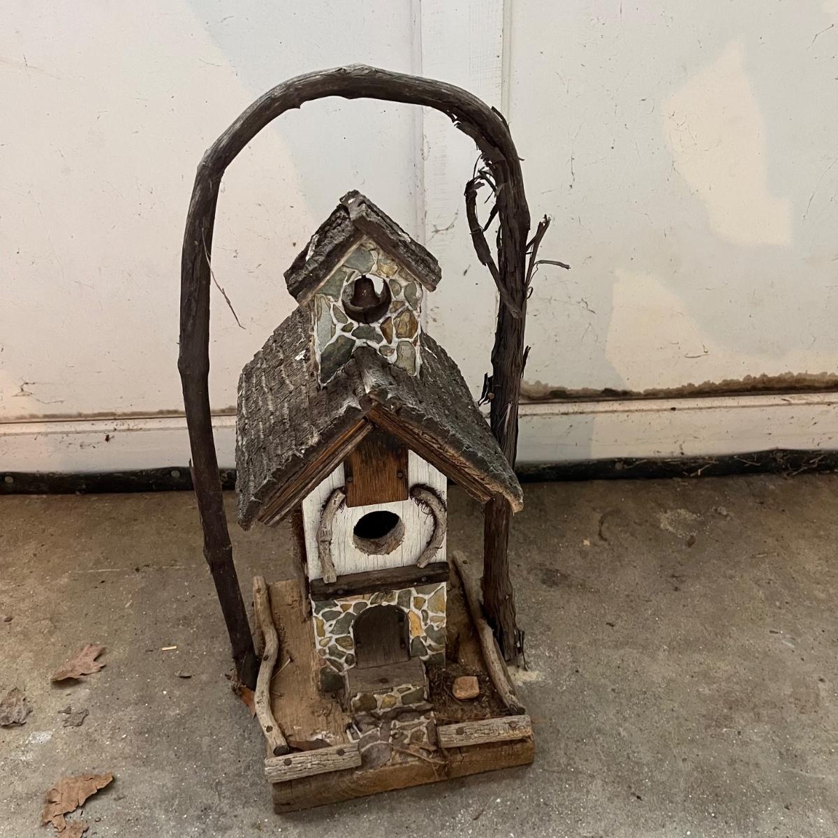 Lot contains a assortment of garden essentials including wooden birdhouses, woven basket, tomato cages, hedge trimmers, sprinkler, hand fork and shovel, bird decorations and more. Largest basket measures 17”D x 22” tall. Local Pickup Only