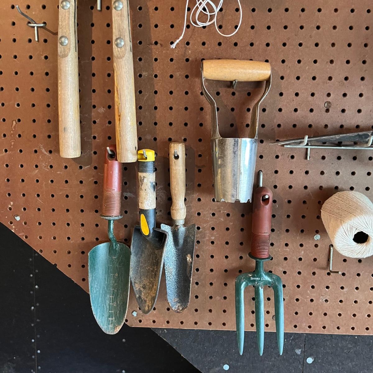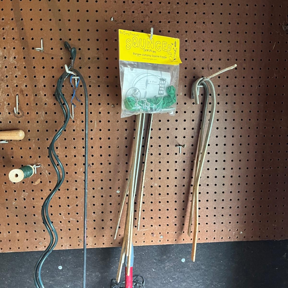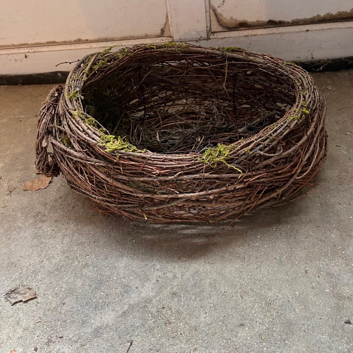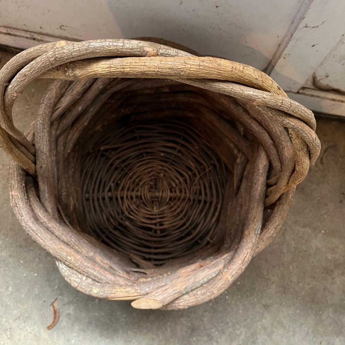 Lot contains a assortment of garden essentials including wooden birdhouses, woven basket, tomato cages, hedge trimmers, sprinkler, hand fork and shovel, bird decorations and more. Largest basket measures 17”D x 22” tall. Local Pickup Only