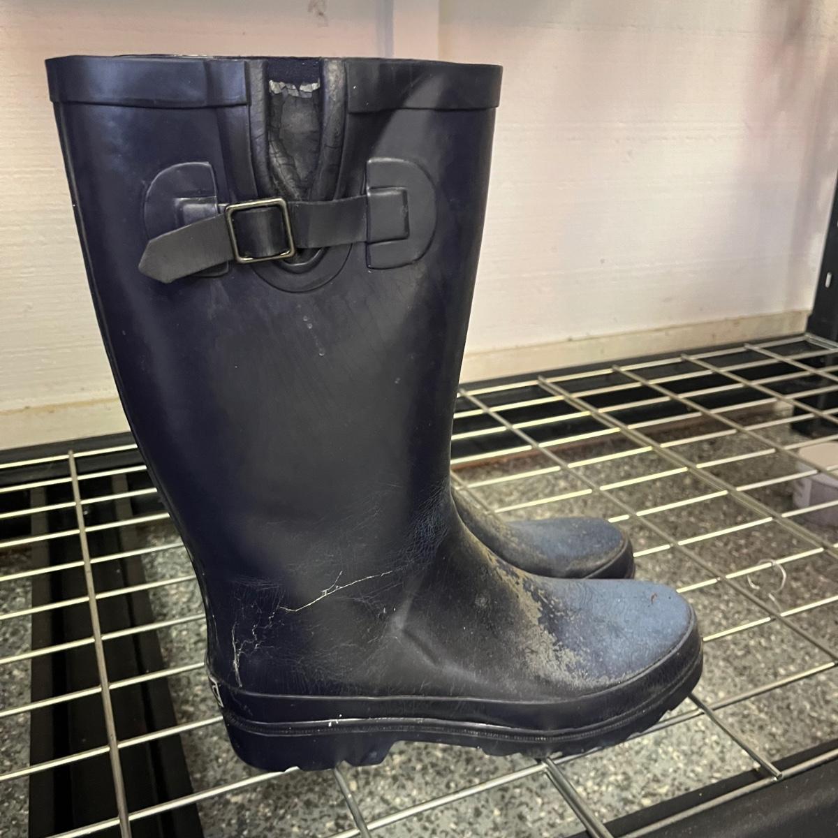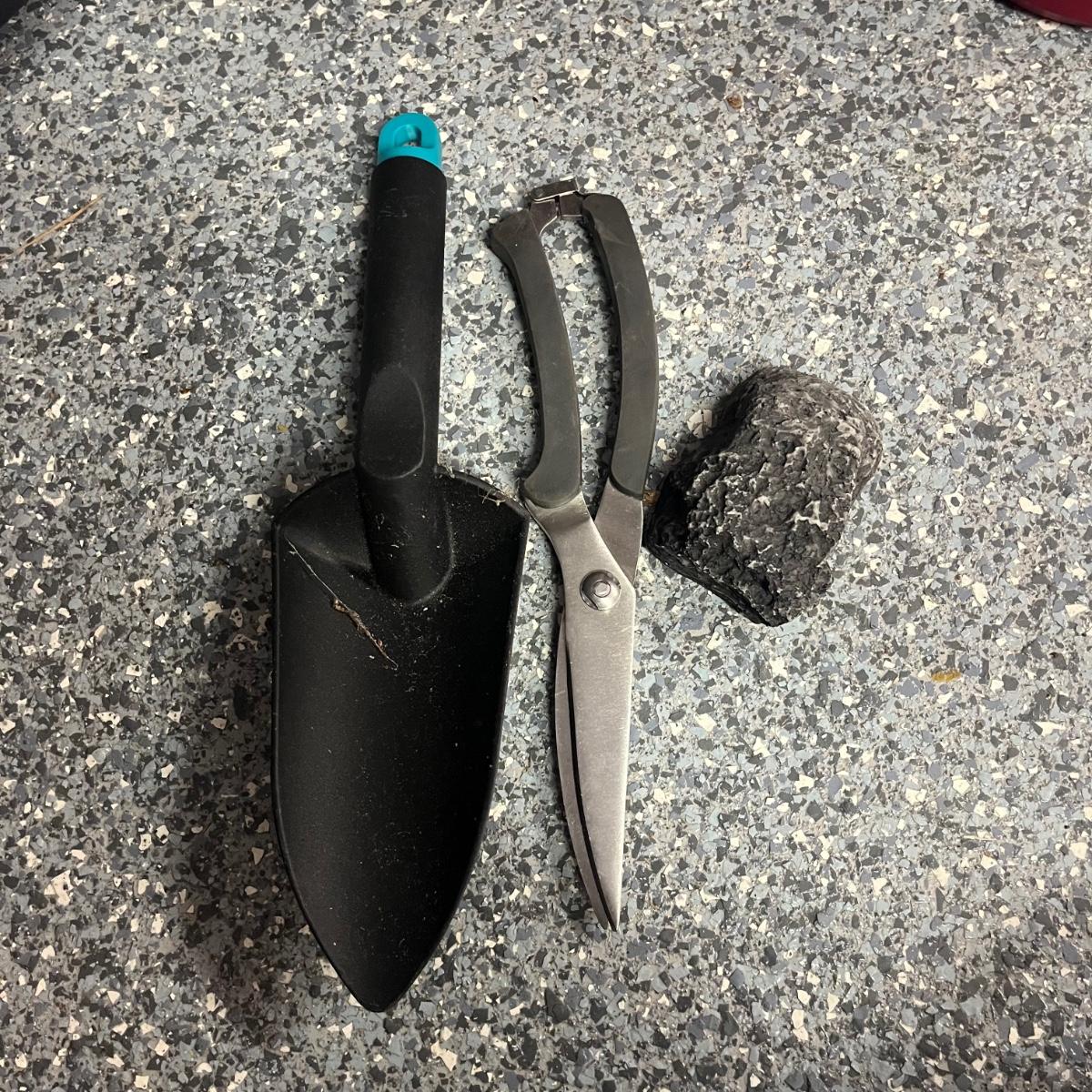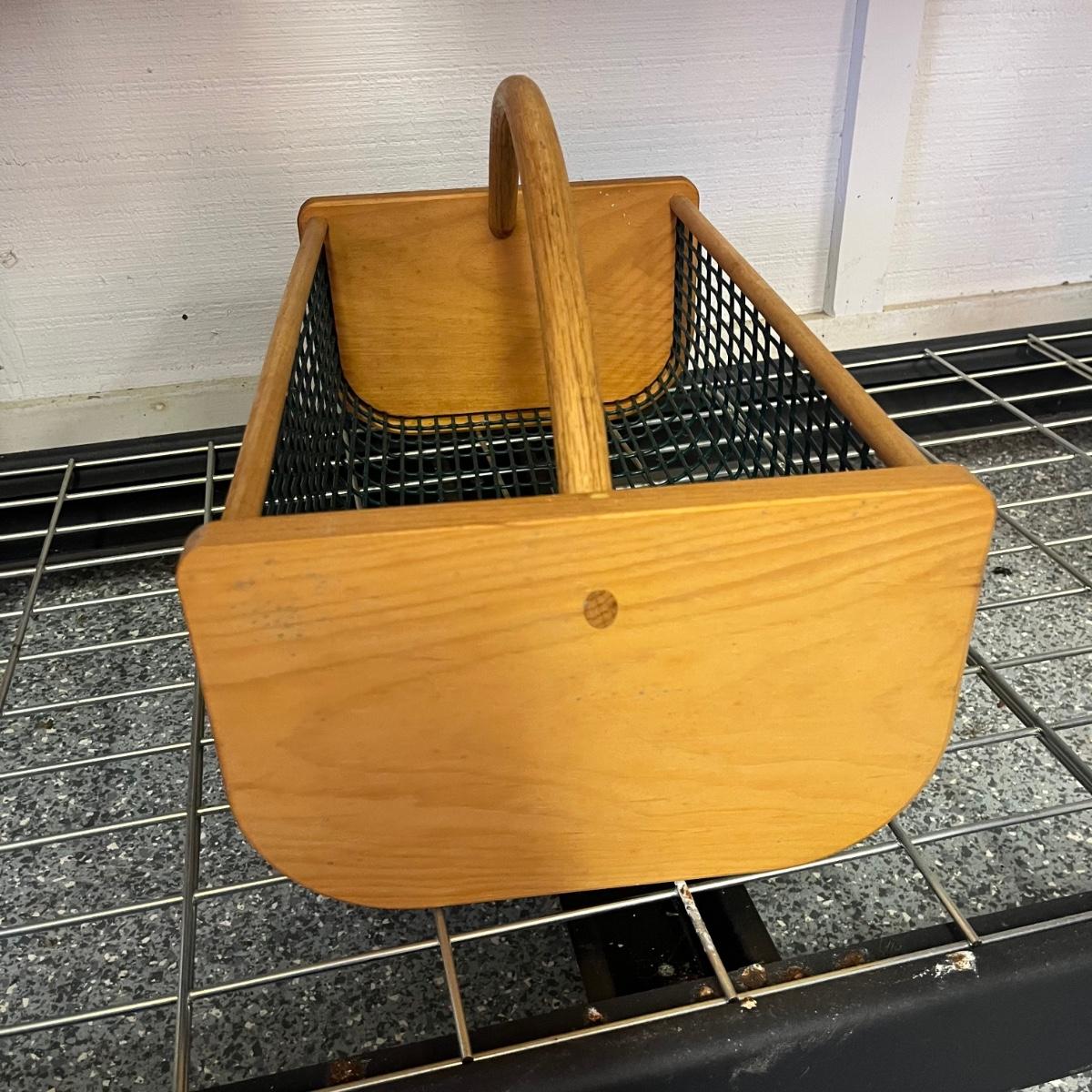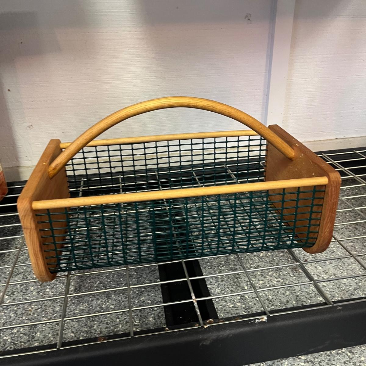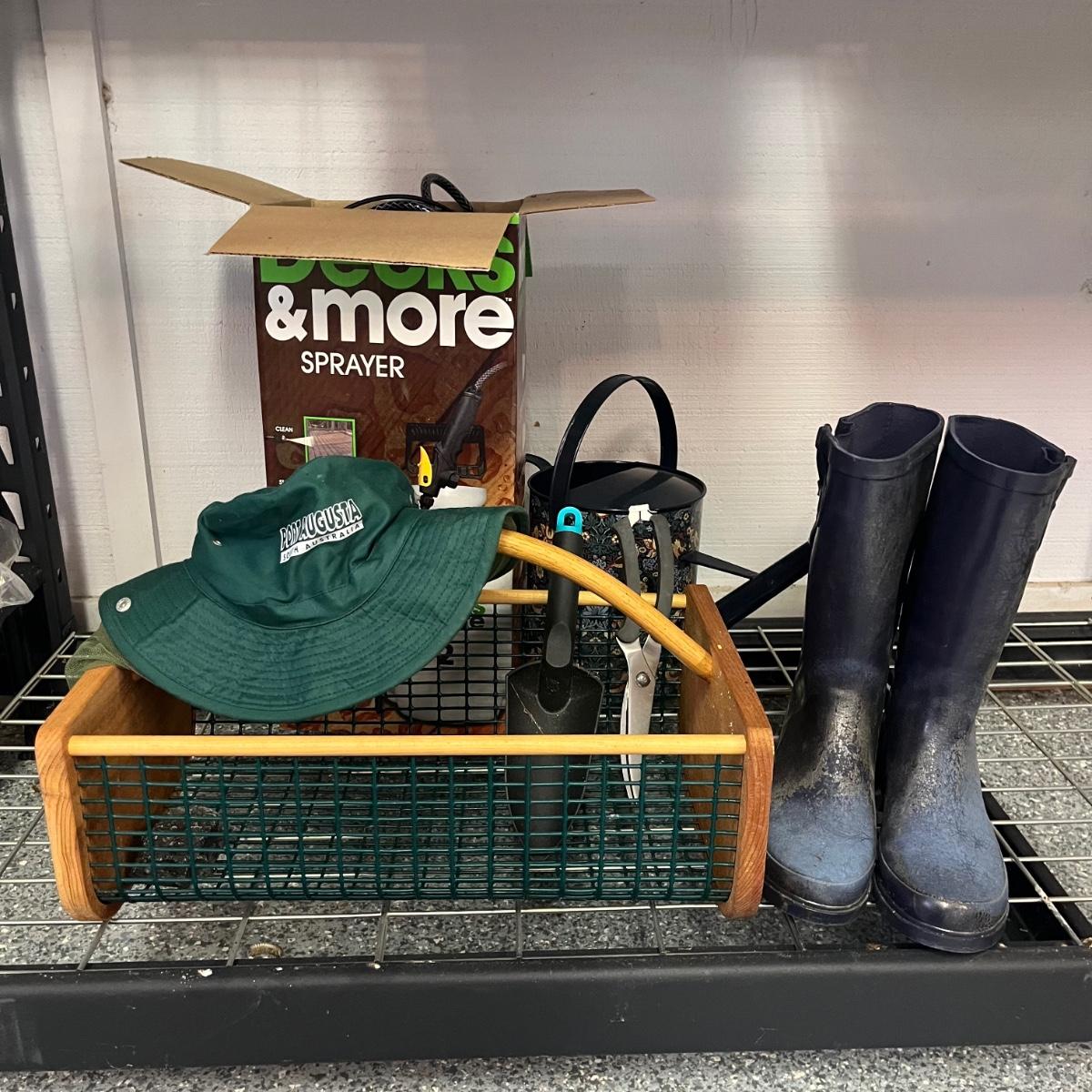Lot includes a wooden and mesh basket, Sugar size nine rubber boots, Australian screen hat, two gallon sprayer, metal watering can and more.