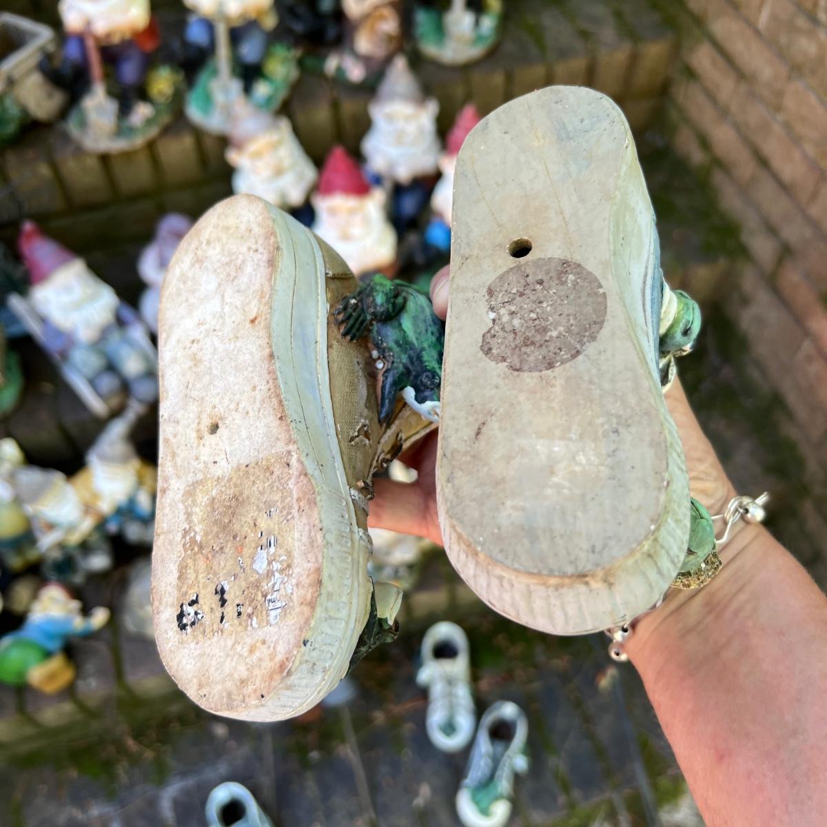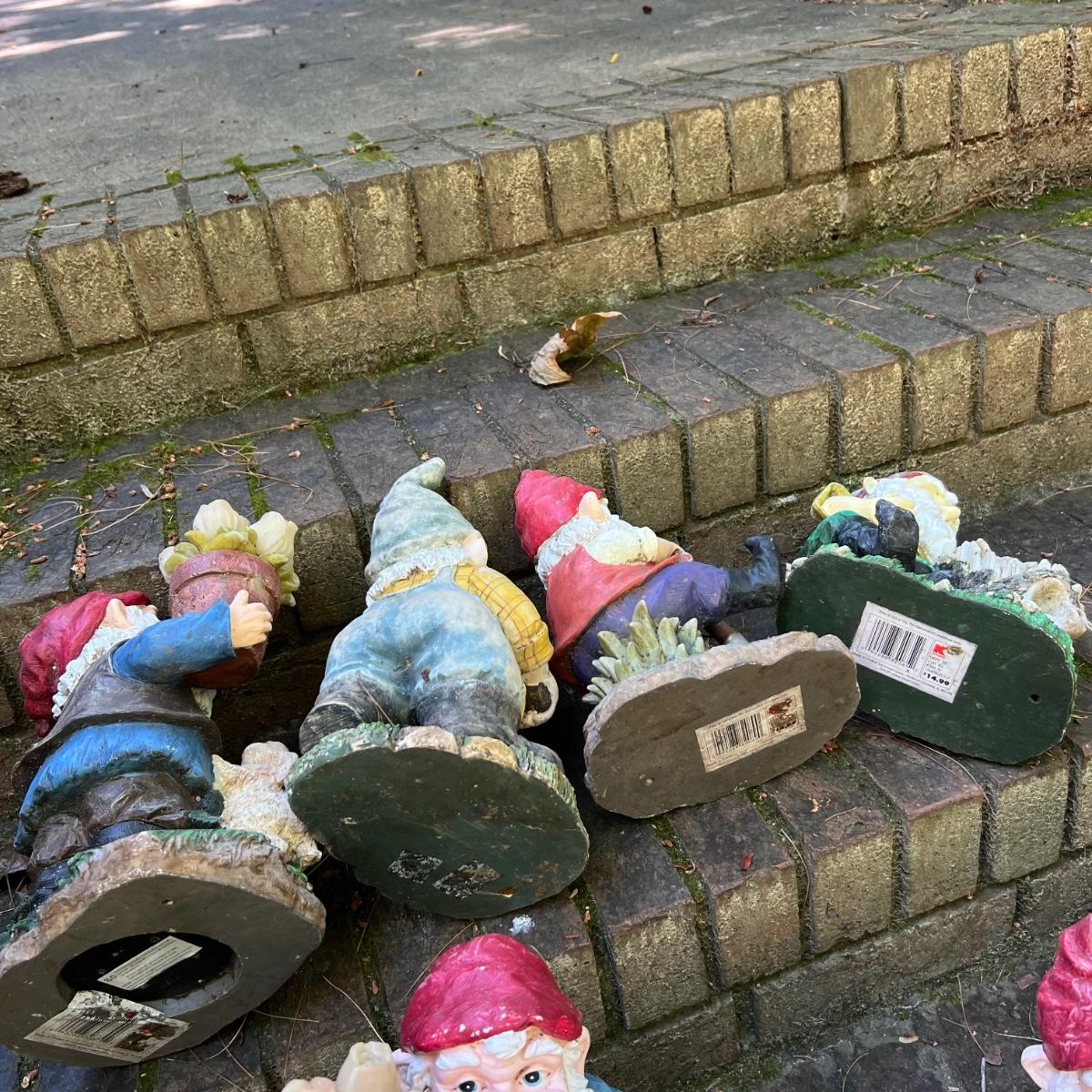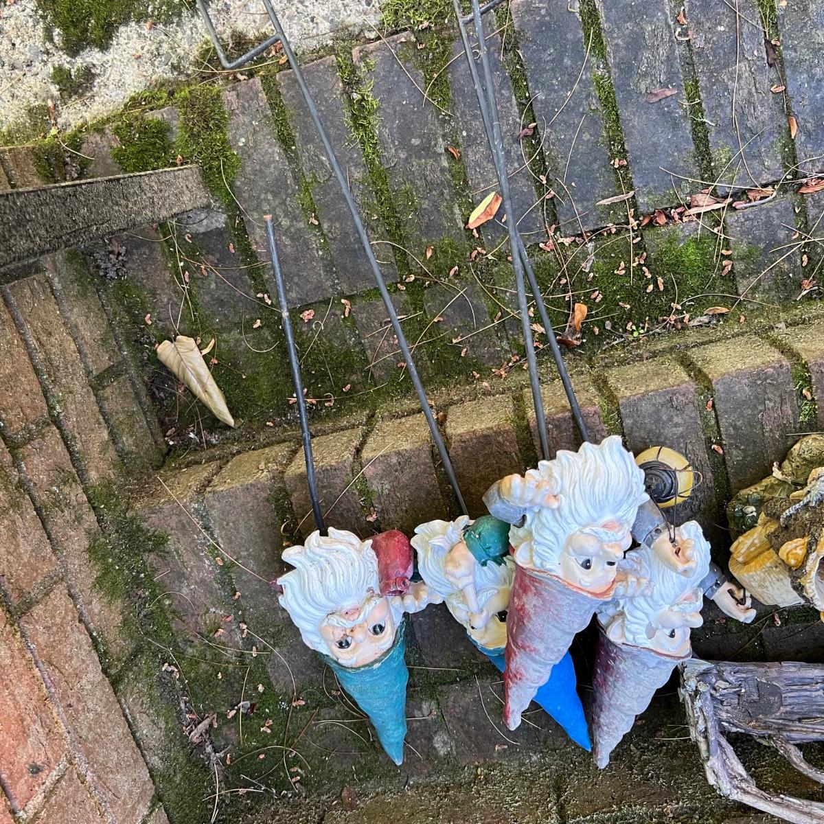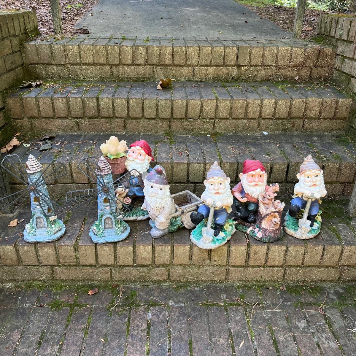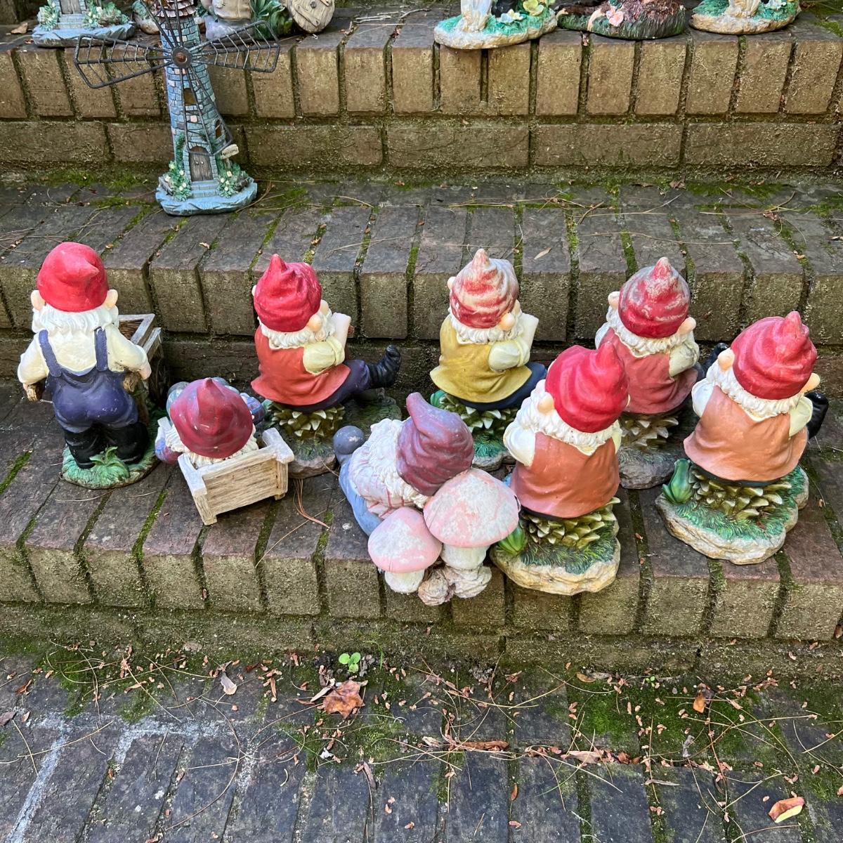 Gnomes of all shapes and sizes in this 20 plus lot. Most are figurines, but some have stakes and a few have solar panels which have not been tested. See image for smallest and largest gnomes. One of the gnomes with rose bouquet has slight damage to the flowers and bouquet needs gluing into place. Most show wear from being outdoors. Most appear to be made if a hard resin material.