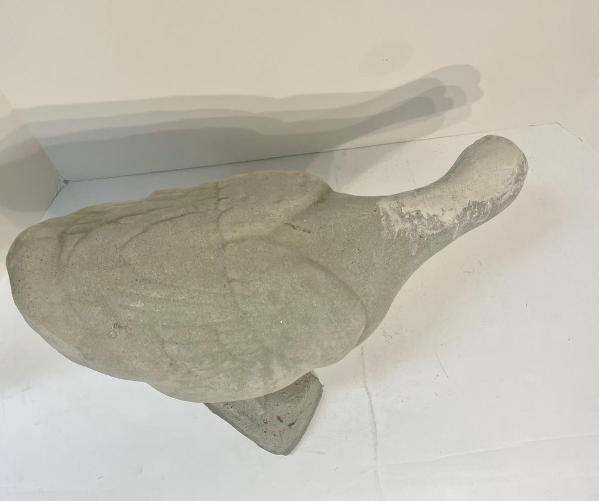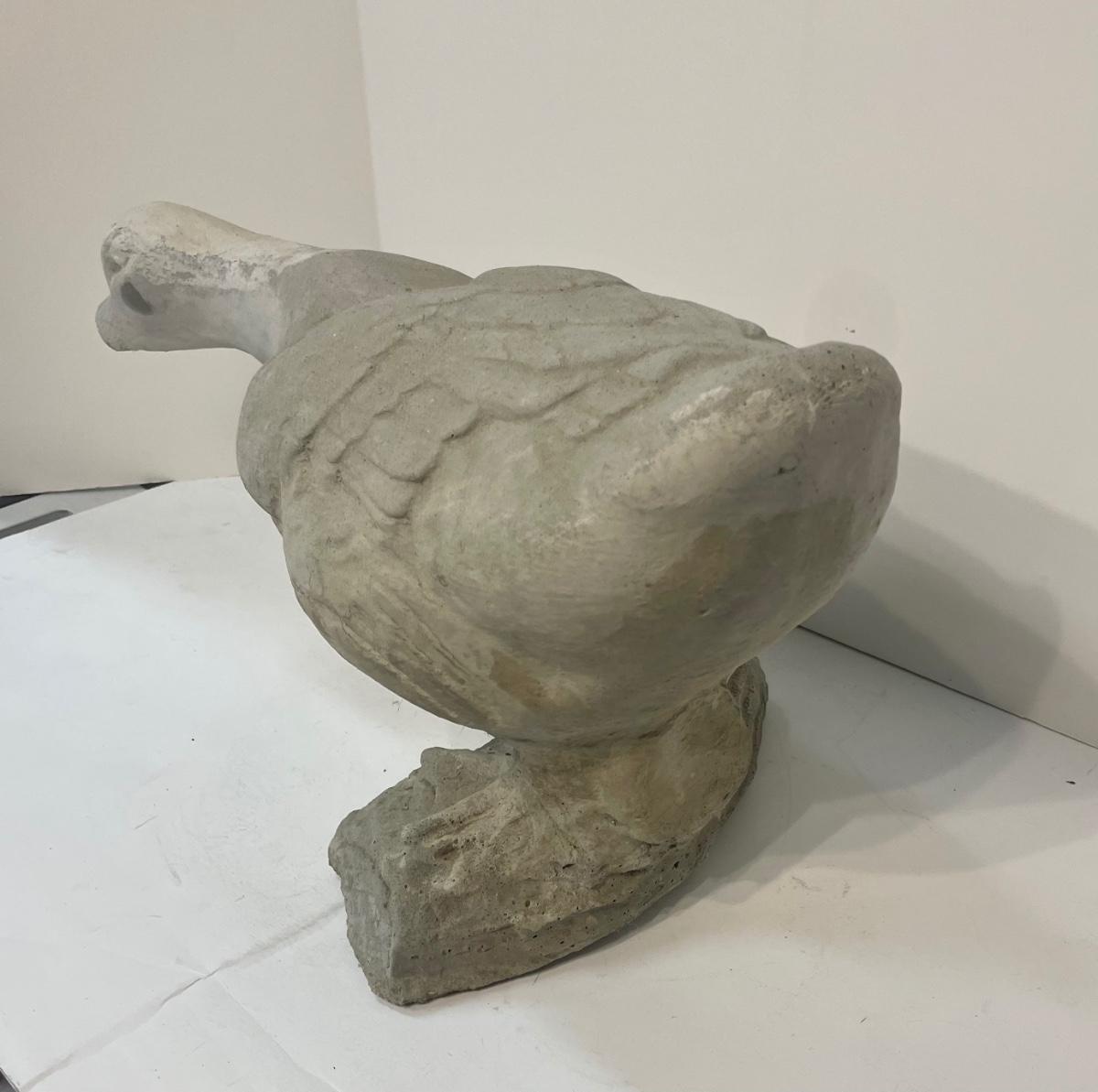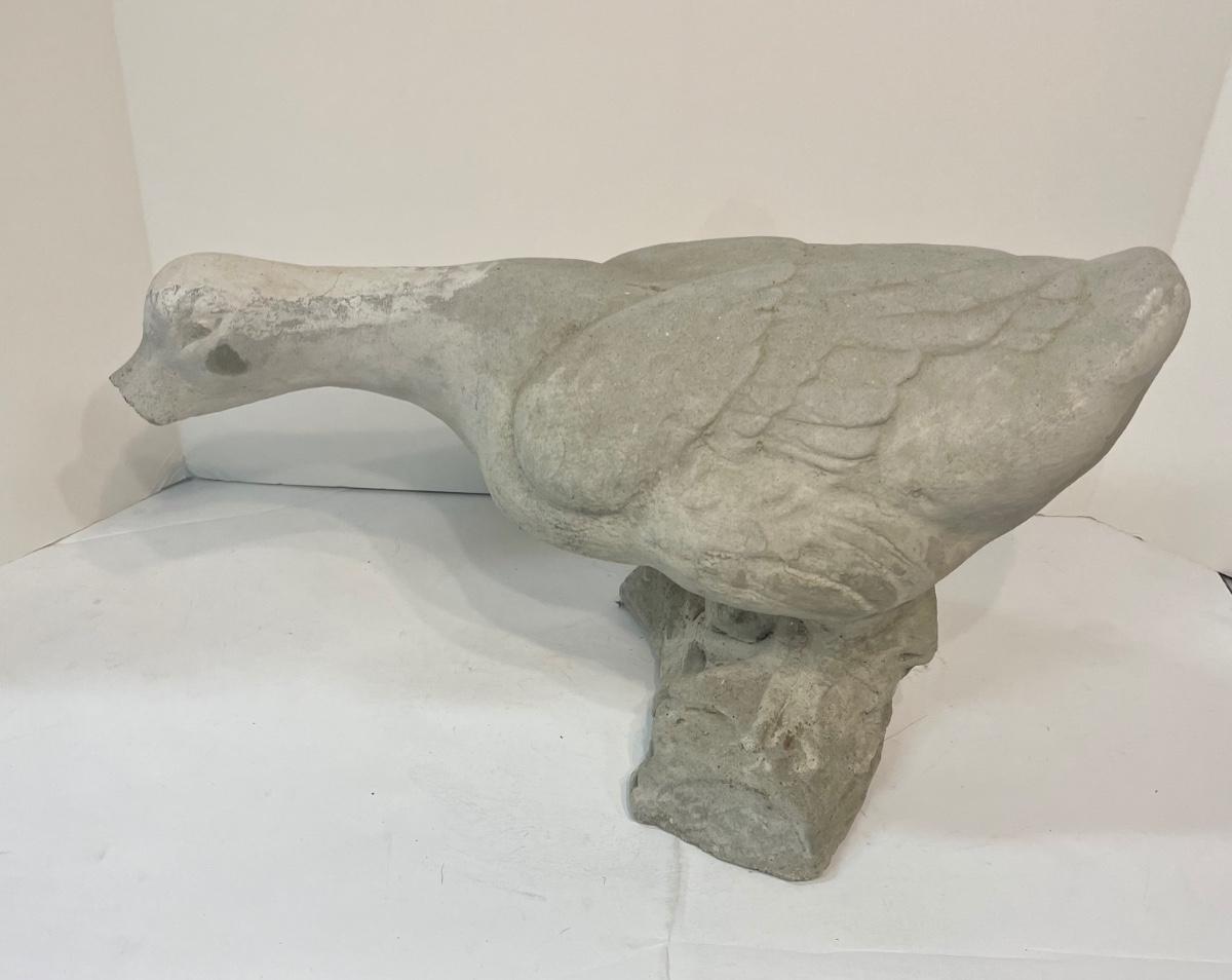 Concrete life-size garden goose, front portion of bill is broken off and paint is very faded.
