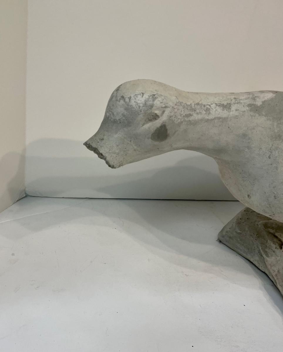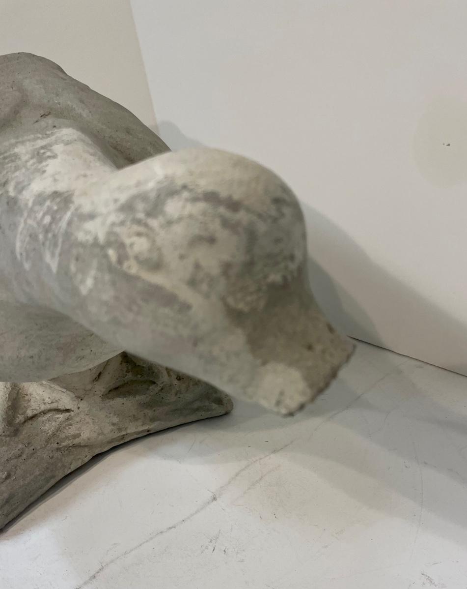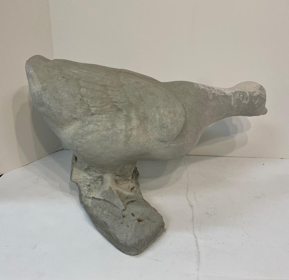 Concrete life-size garden goose, front portion of bill is broken off and paint is very faded.