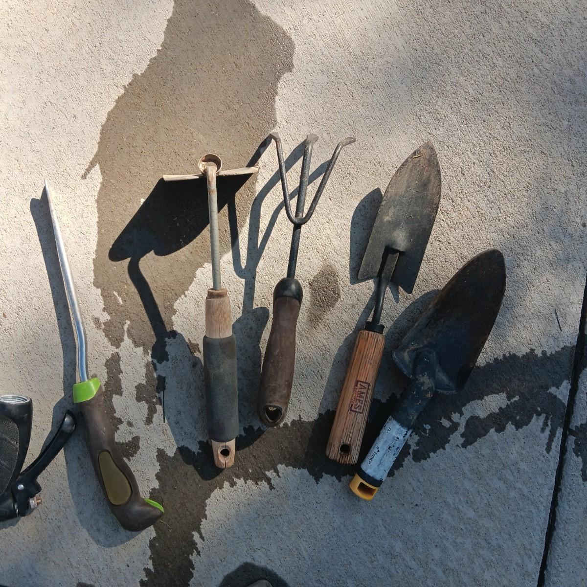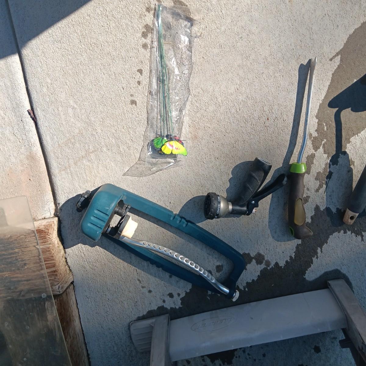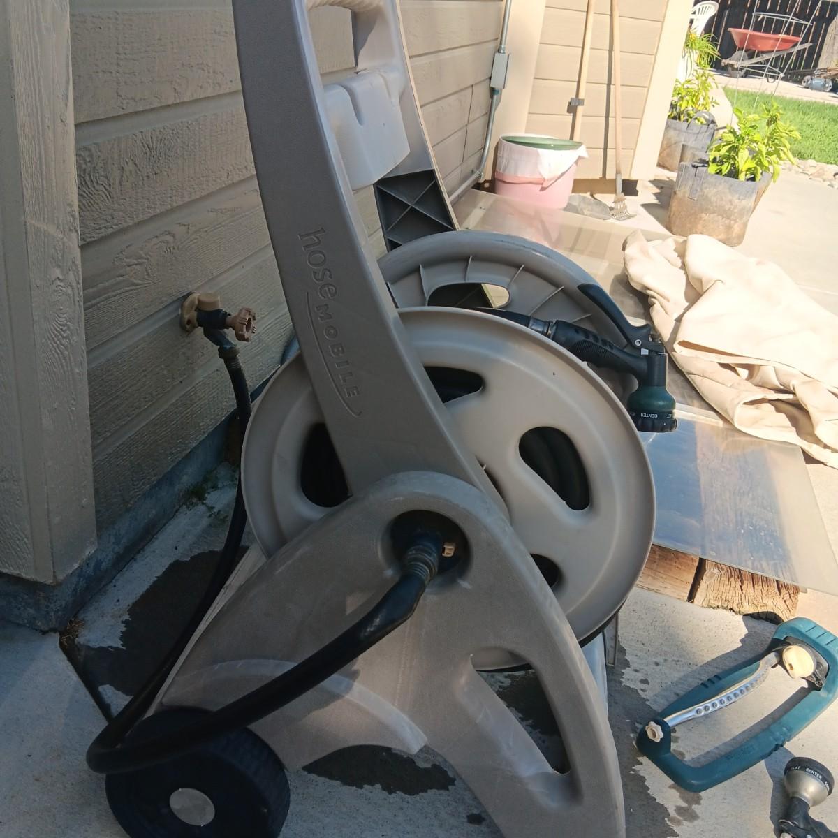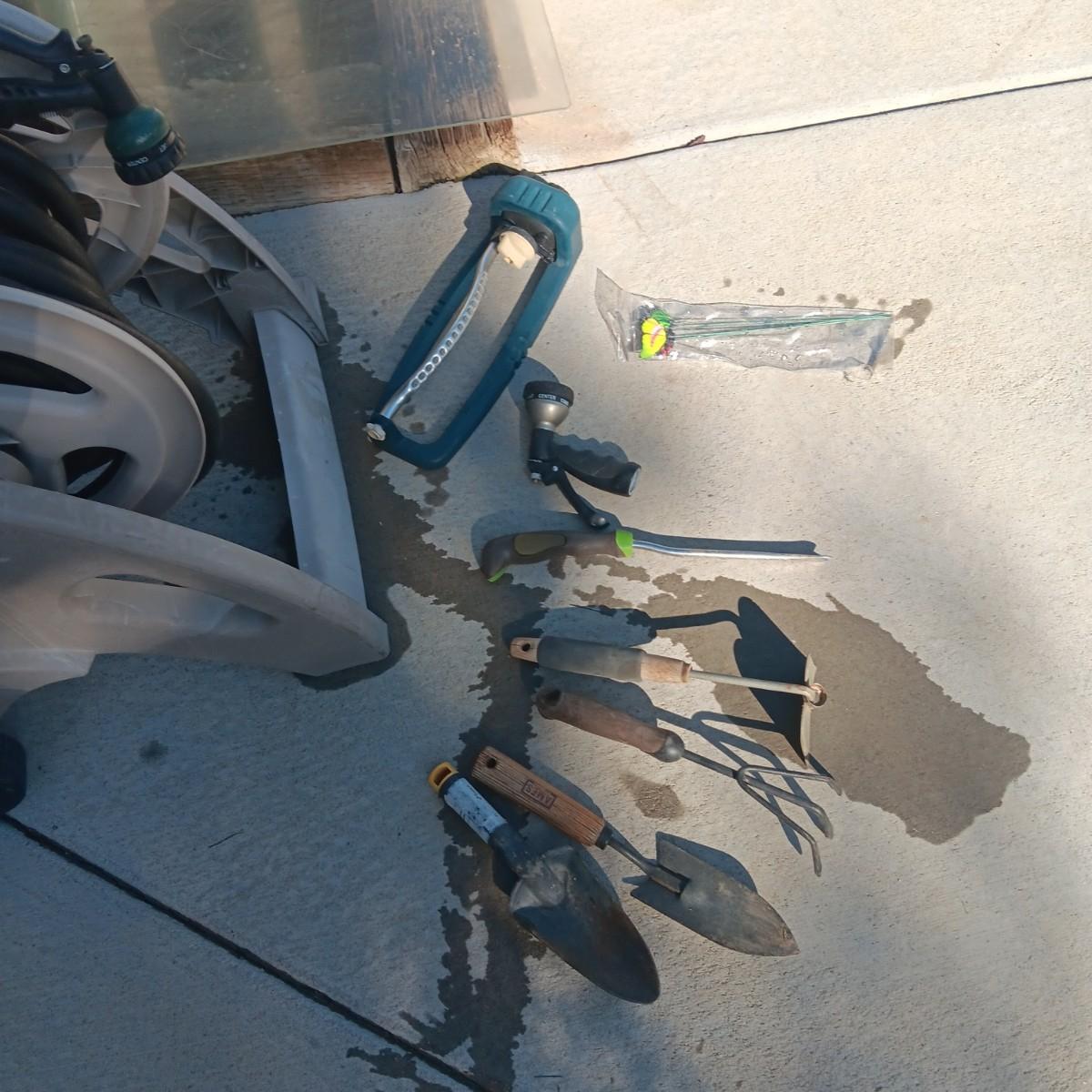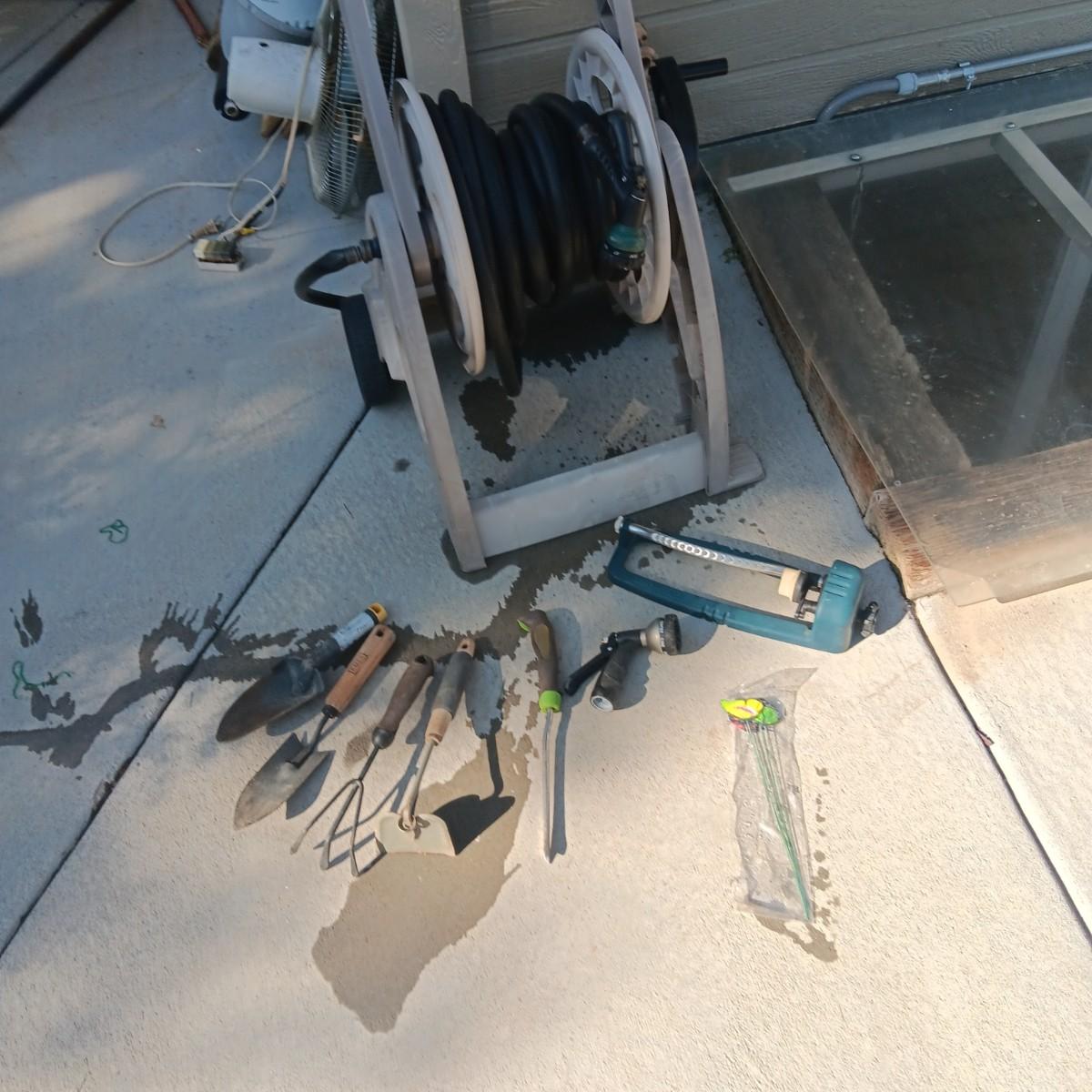 GARDEN HOSE ON A REEL, GARDENING TOOLS AND SPRINKLER