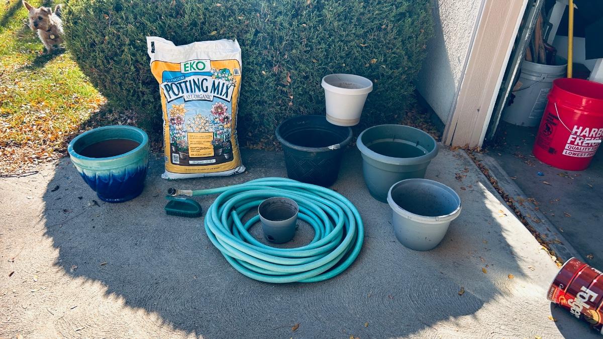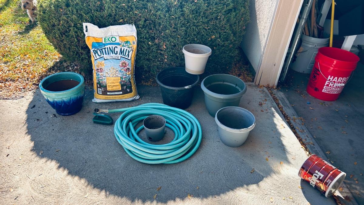 GARDEN HOSE, PLANTERS, AND POTTING SOIL