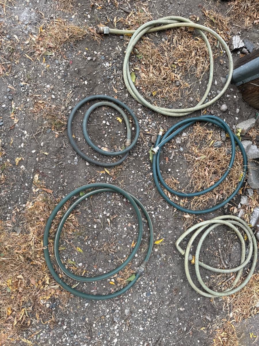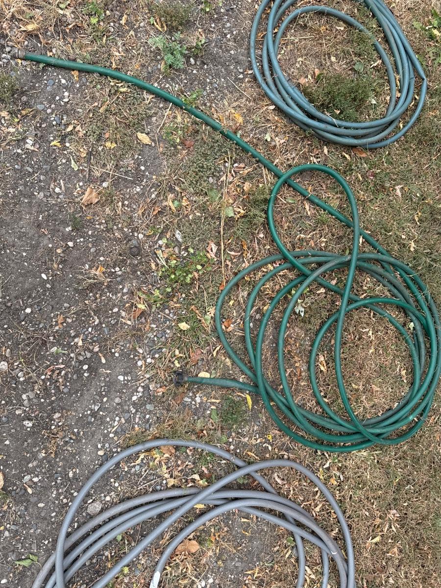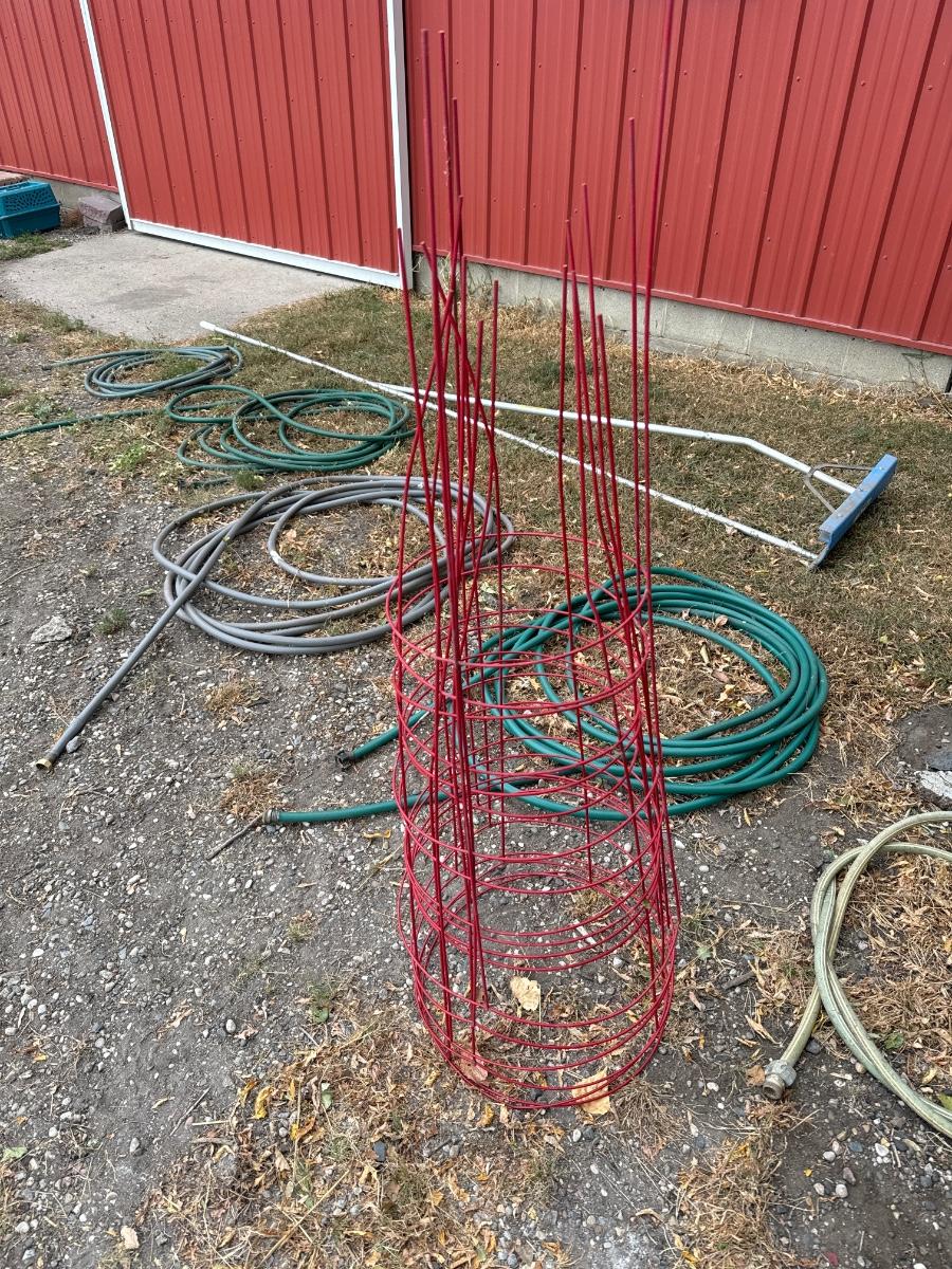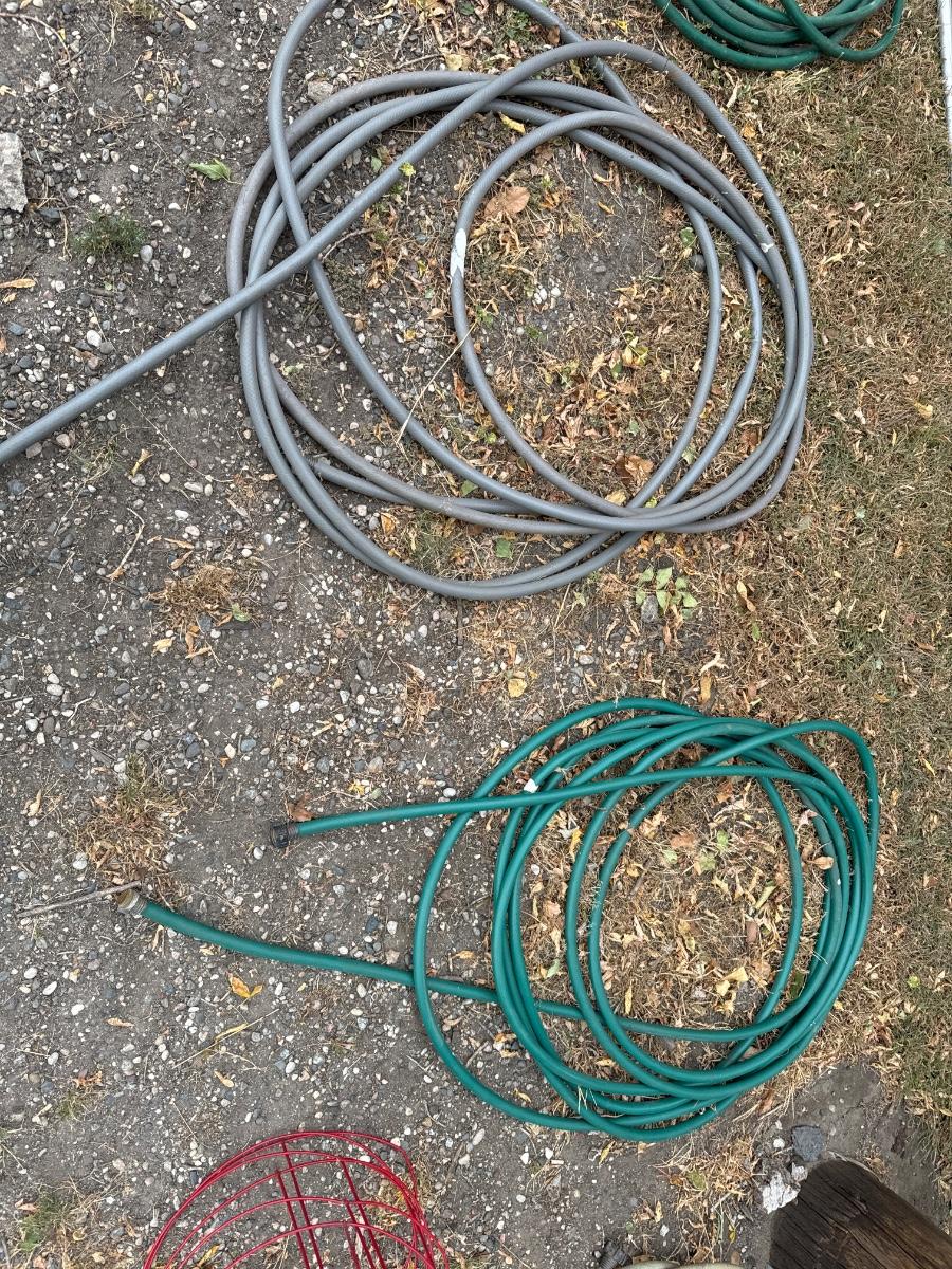 Nine Garden hoses and five tomato baskets