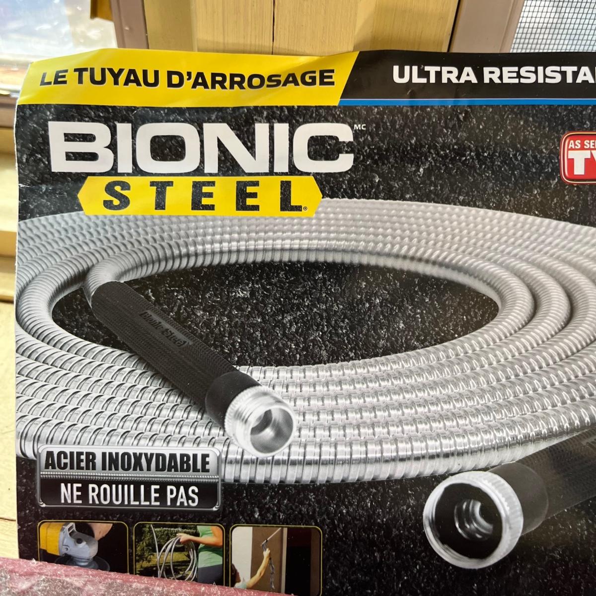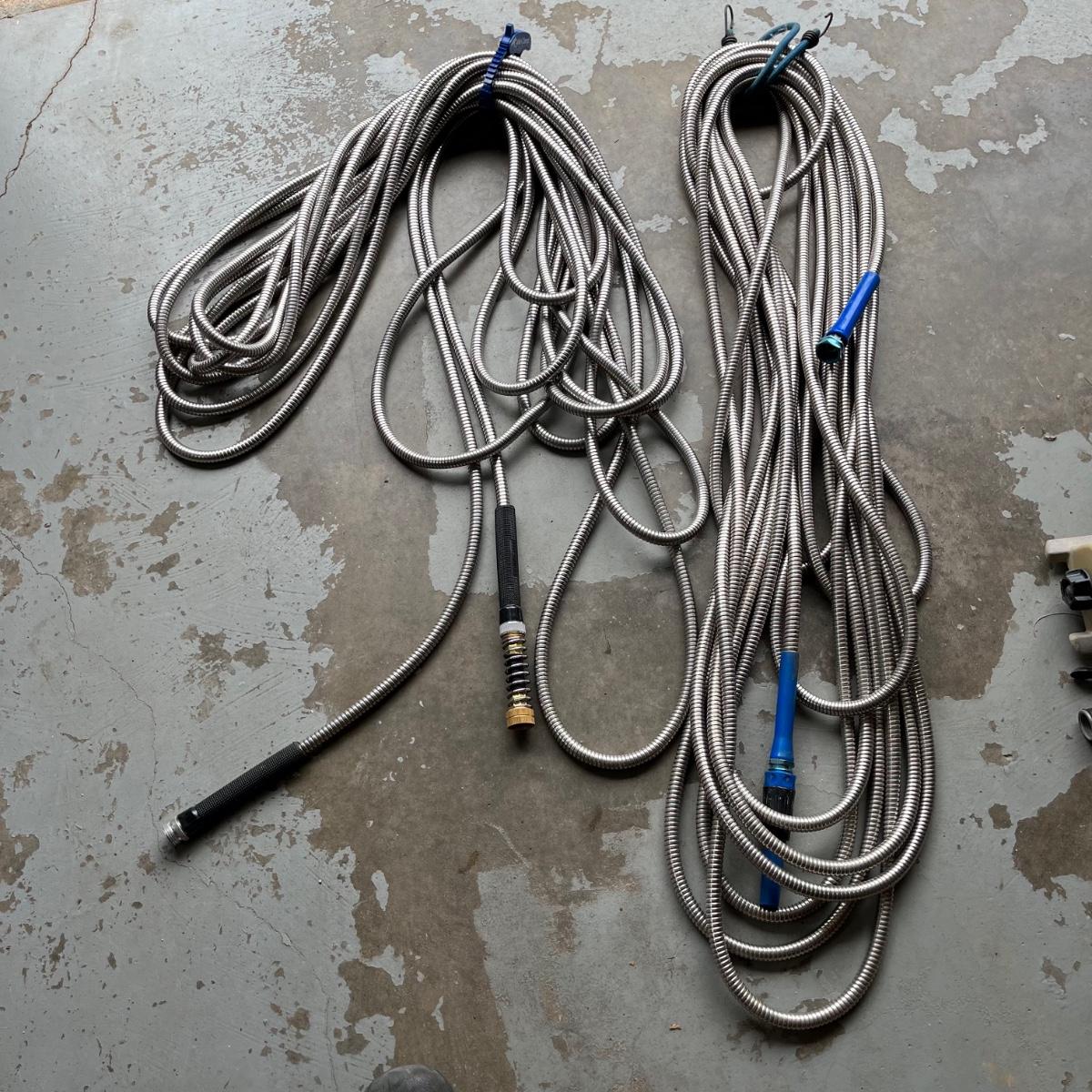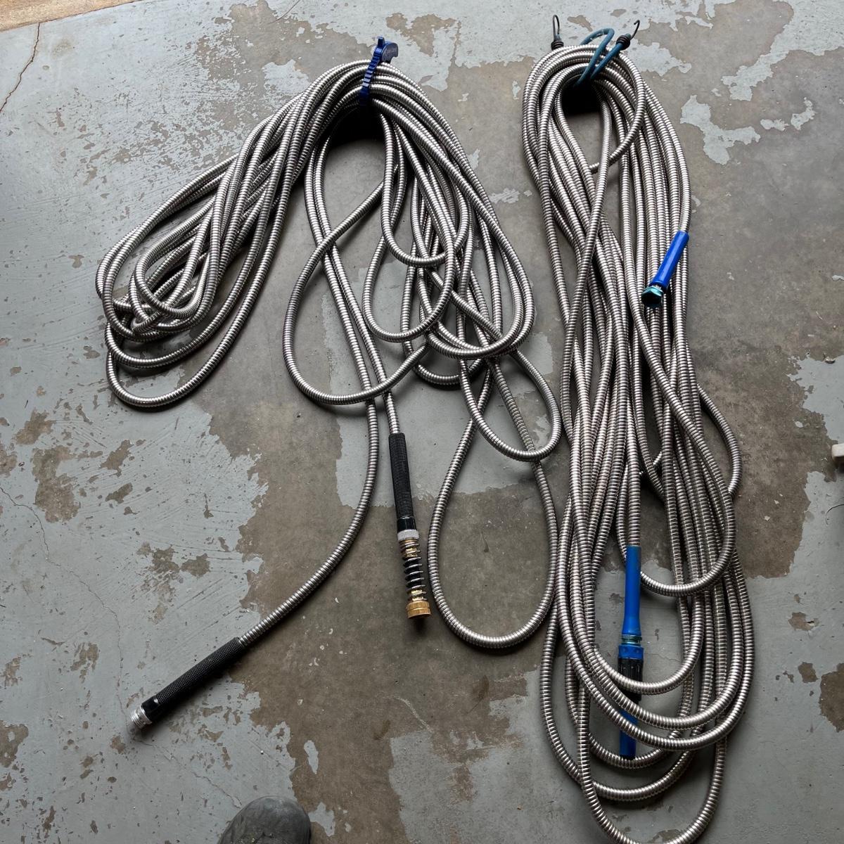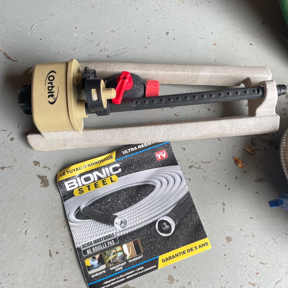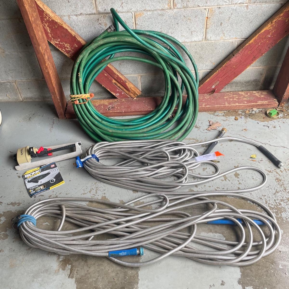 Lot includes one rubber garden hose, two bionic steel hoses, and one plastic sprinkler.