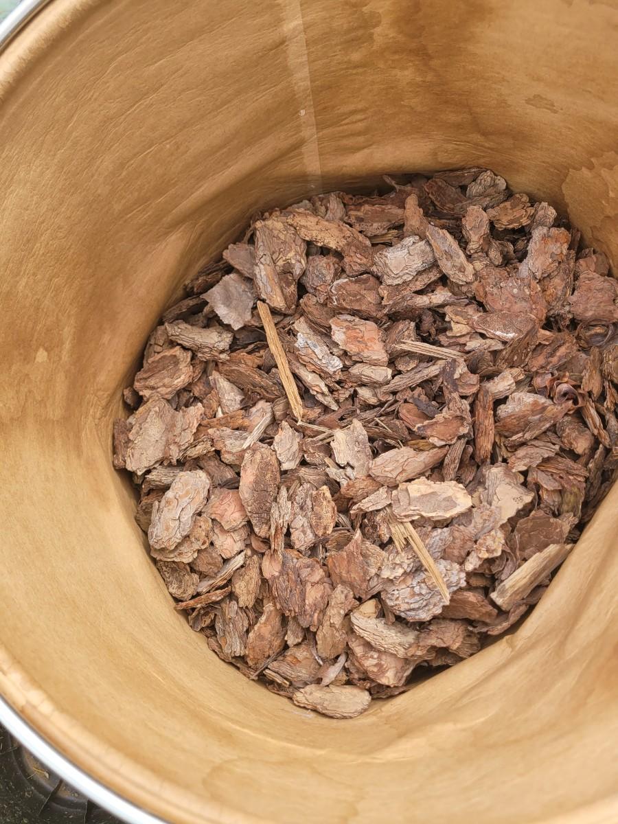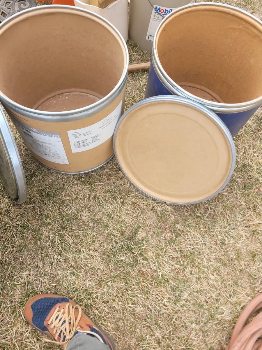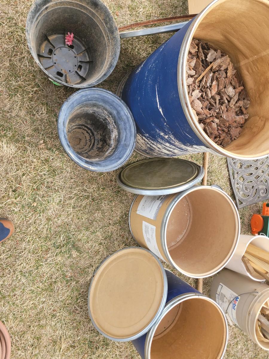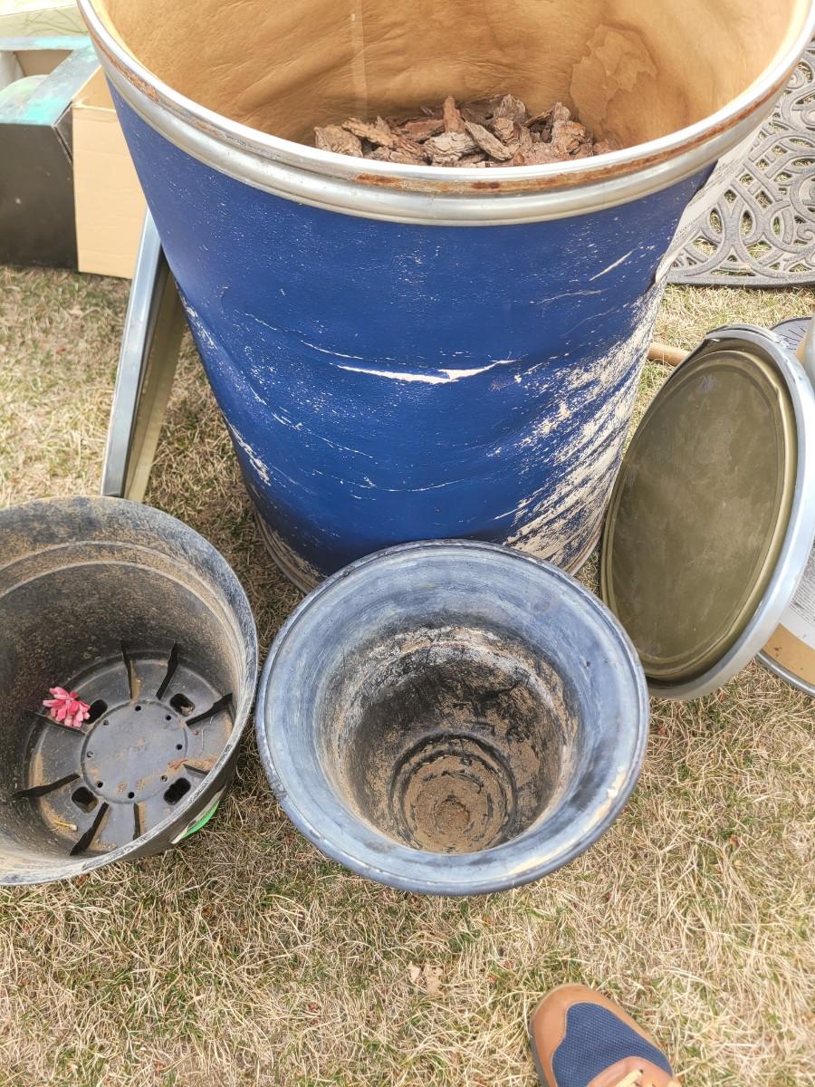 Bark for a garden with lid, 2 cardboard barrels with lids 2 pots, one meant to be sunken.