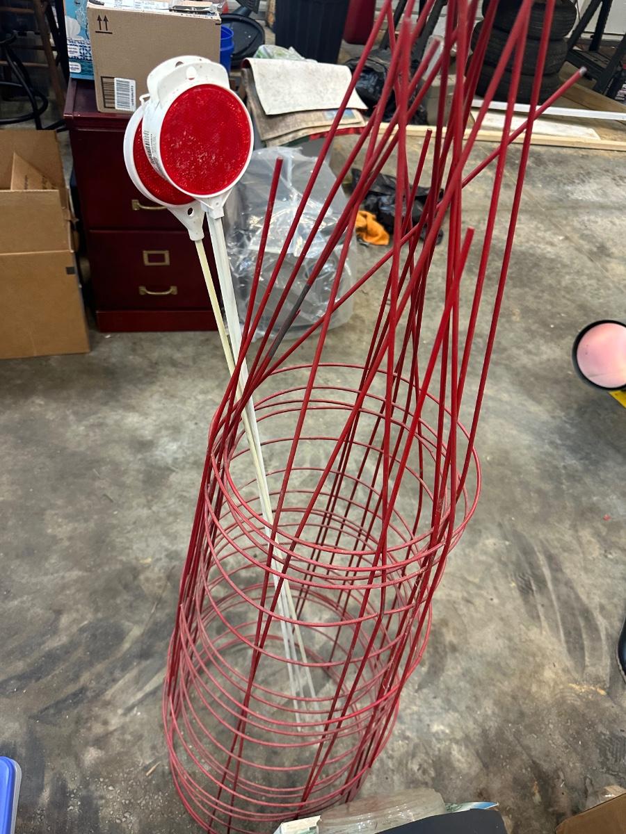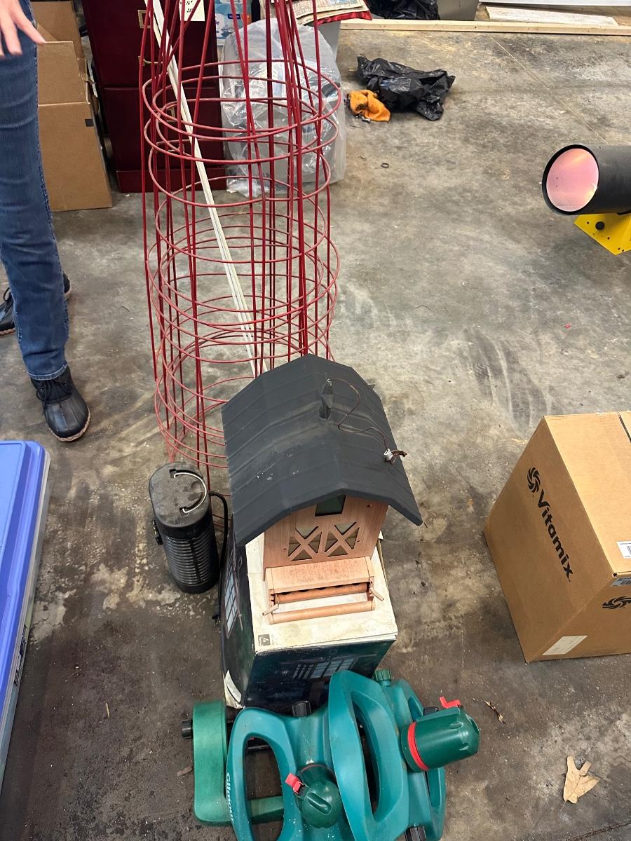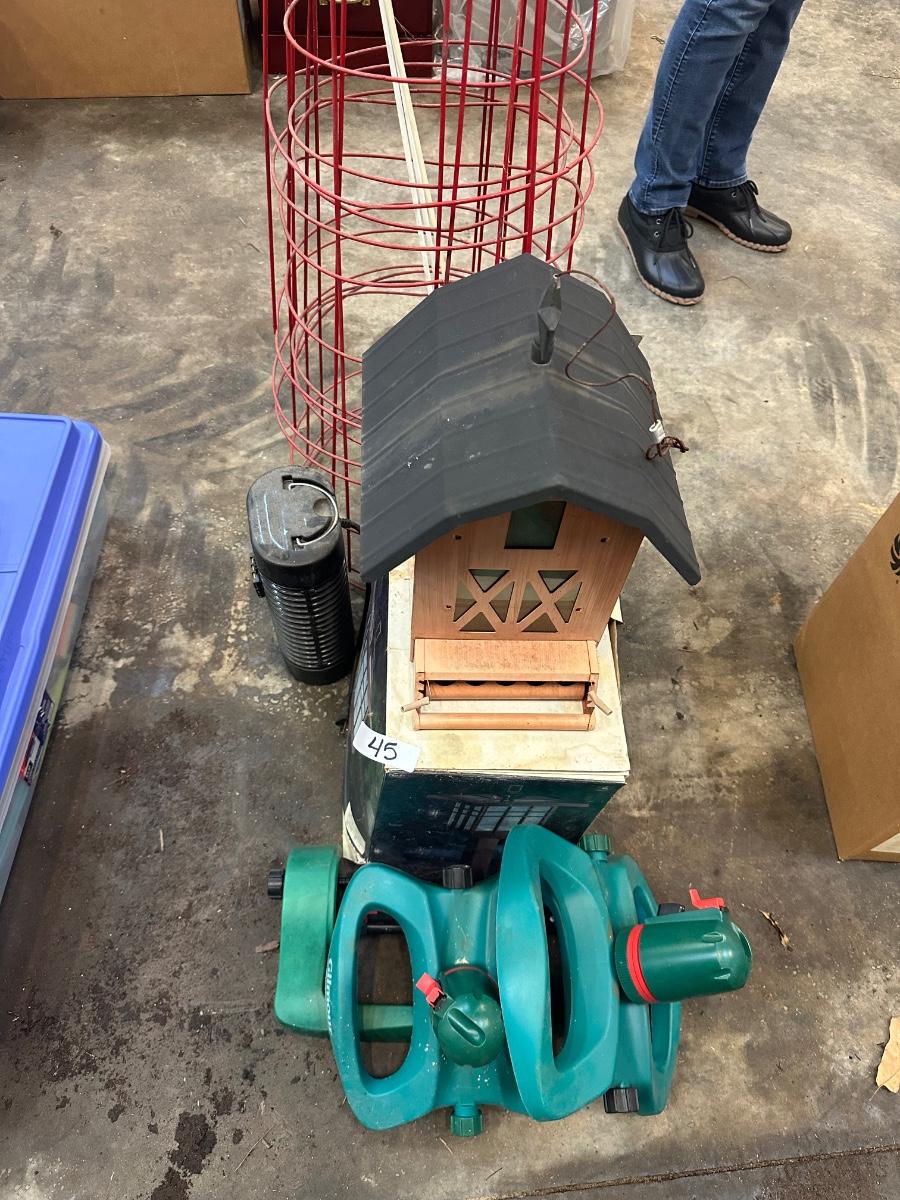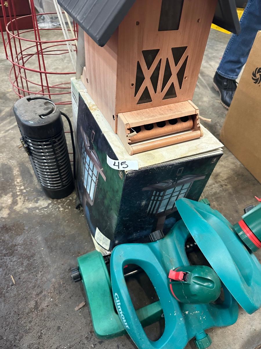 GARDEN LOT ICLUDES TOMATO CGES, SPRINKLERS, SOLAR LIGHT AND BIRDHOUSE