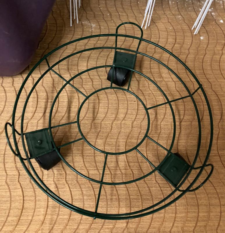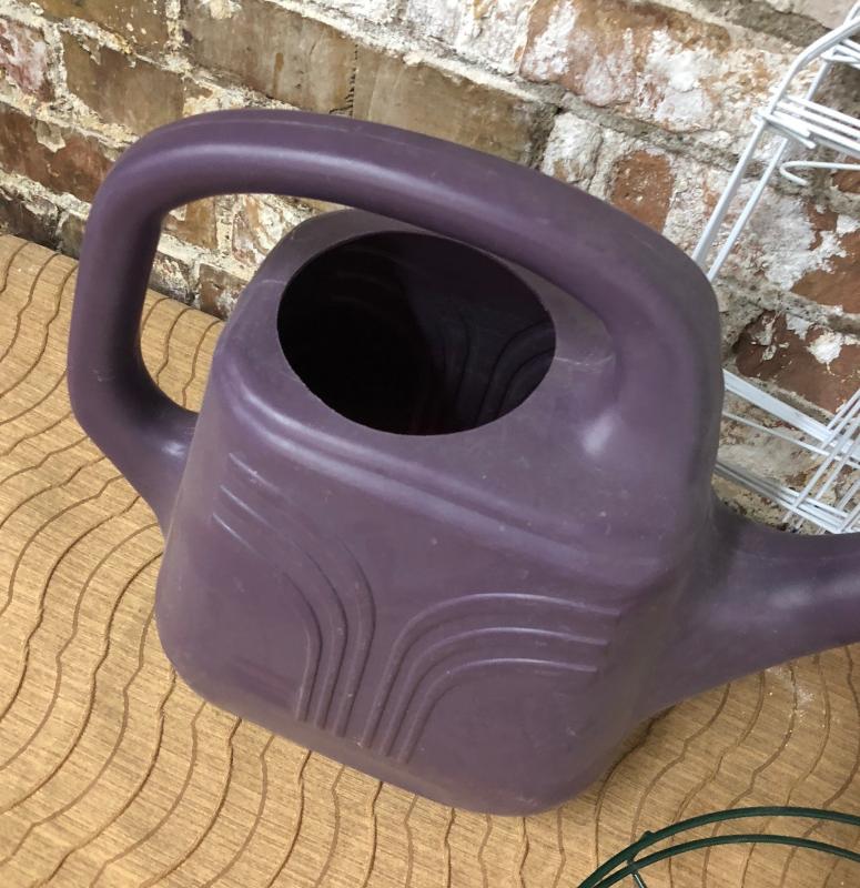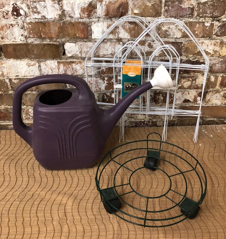Here is garden lot with a plastic watering can and a folding fence as well as a plant cart for a large jardiniere...New condition...