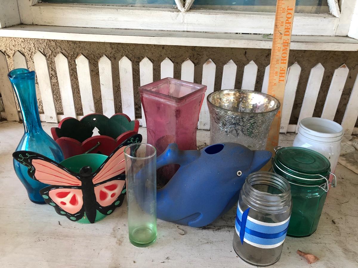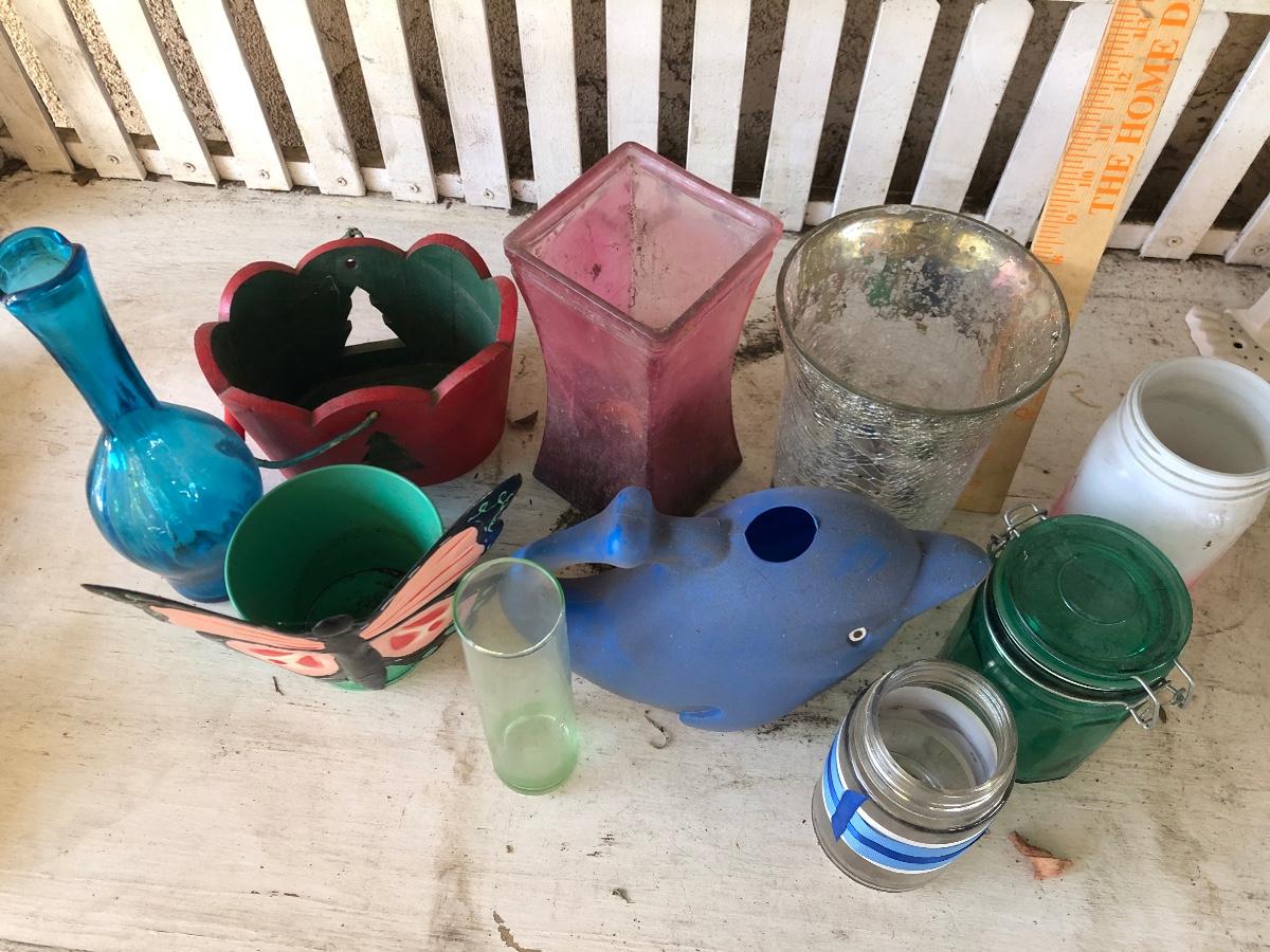 Blue dolphin plastic watering can, glassware, pots, vases, jars