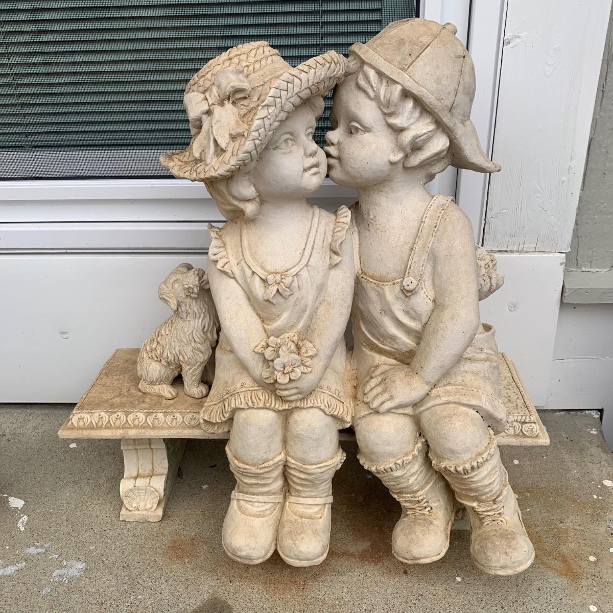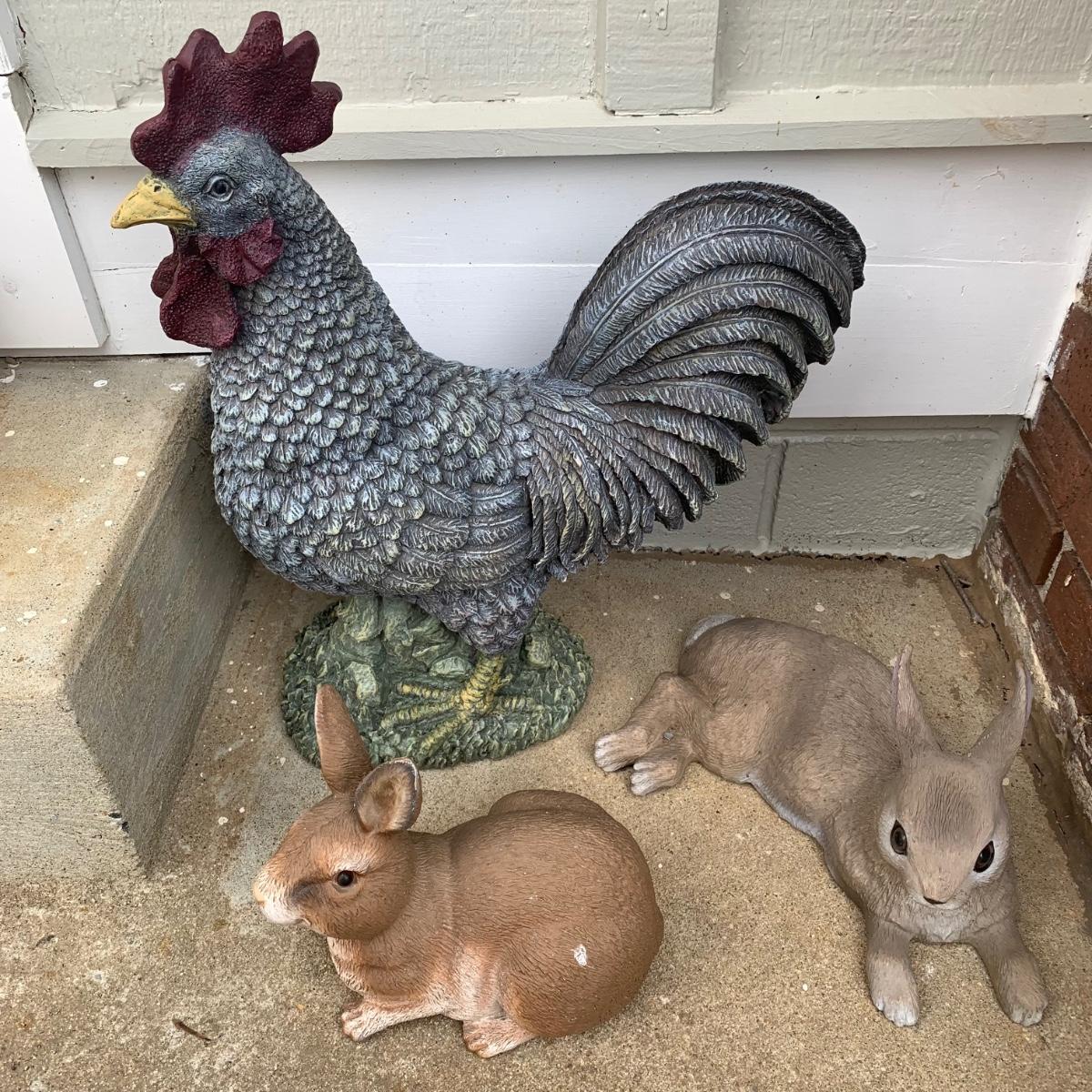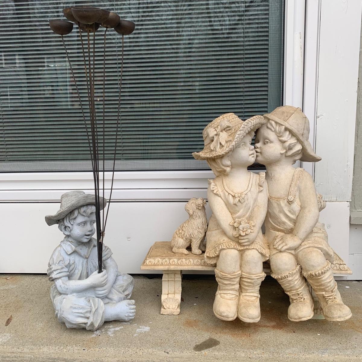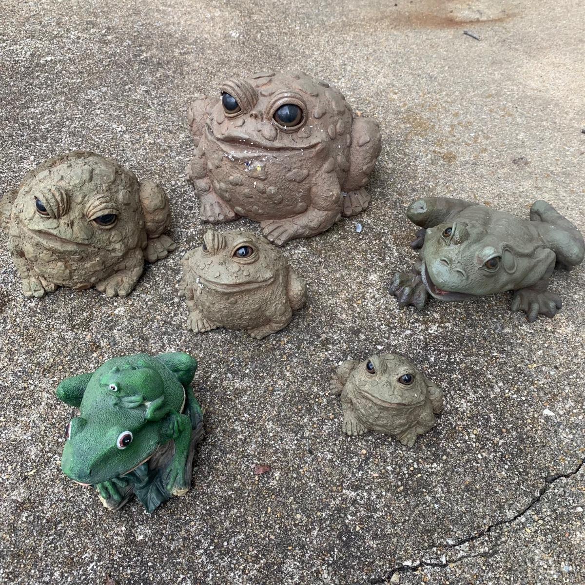 Lot includes a large collection of garden ornaments. Selection includes frogs, snails, and bunnies. Most items are colored plastic, however five items are concrete. Please note that some items are weathered, but still appear to have a bit of life left. Largest item measures approximately , 17” x 9” x 16”. Shipping available. Shipping can be costly. We suggest contacting our preferred local shipping provider, Postage Express, with dimensions and getting an estimate before bidding: (828) 670-5501 or postageexpress@yahoo.com.