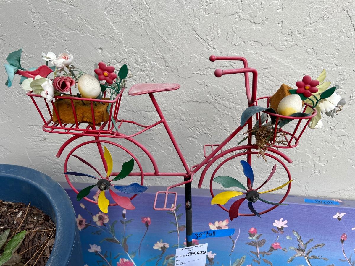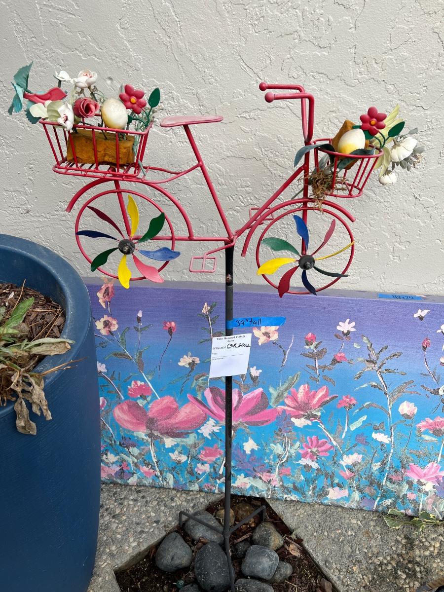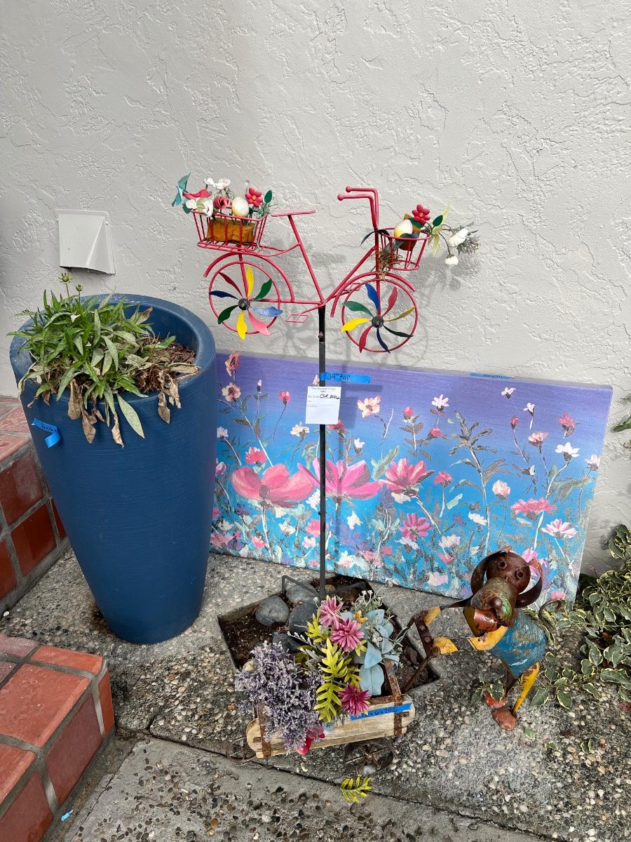 Includes floral print on canvas, tall plastic planter, bicycle garden stake, and metal dog sculpture.