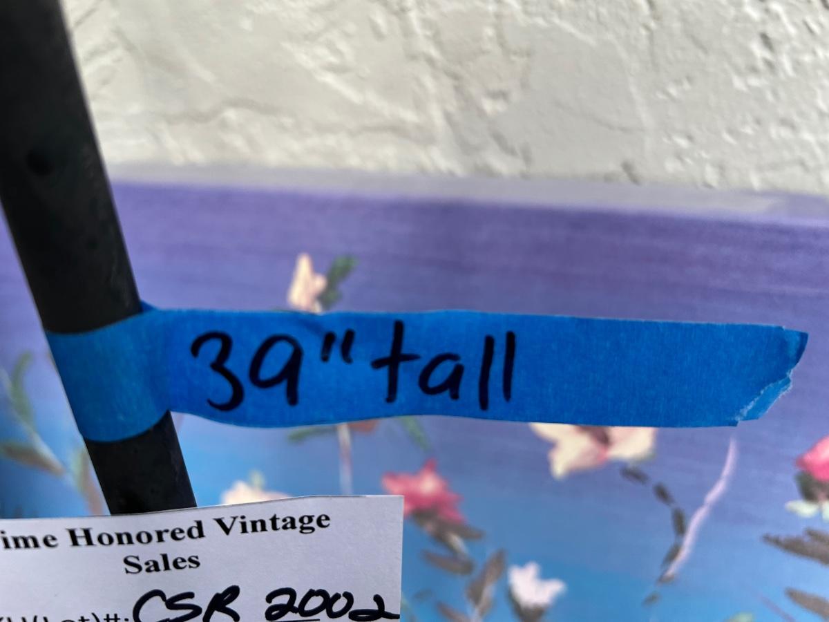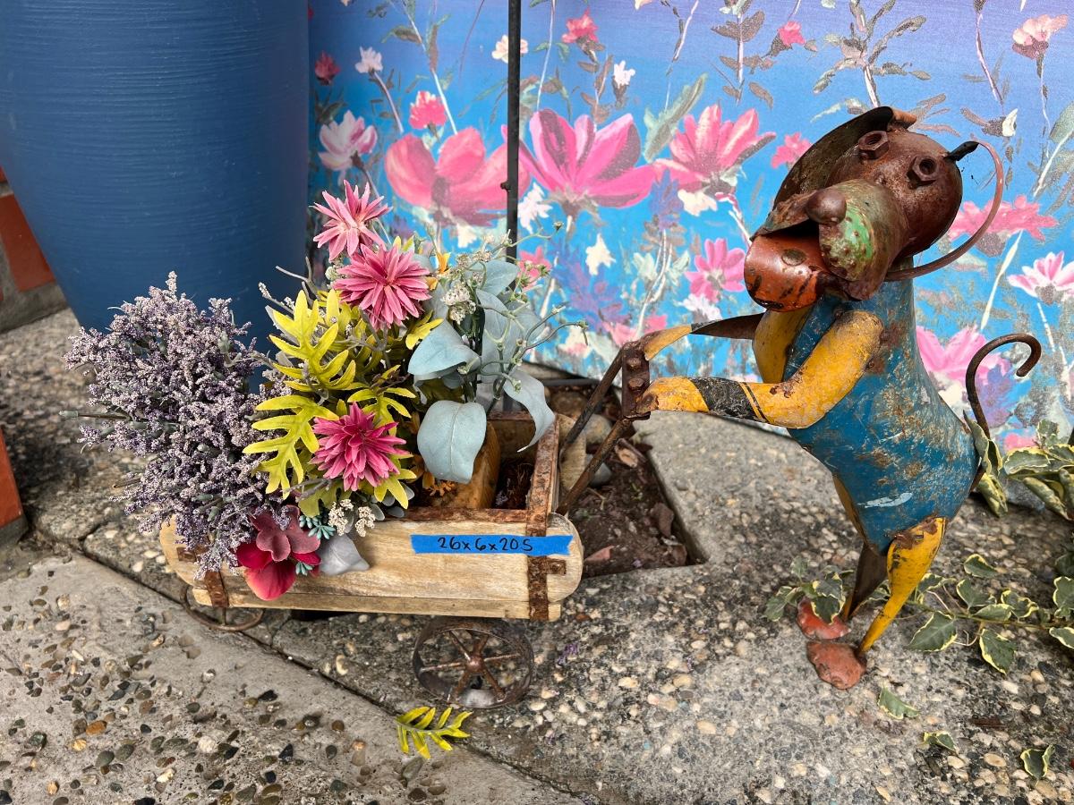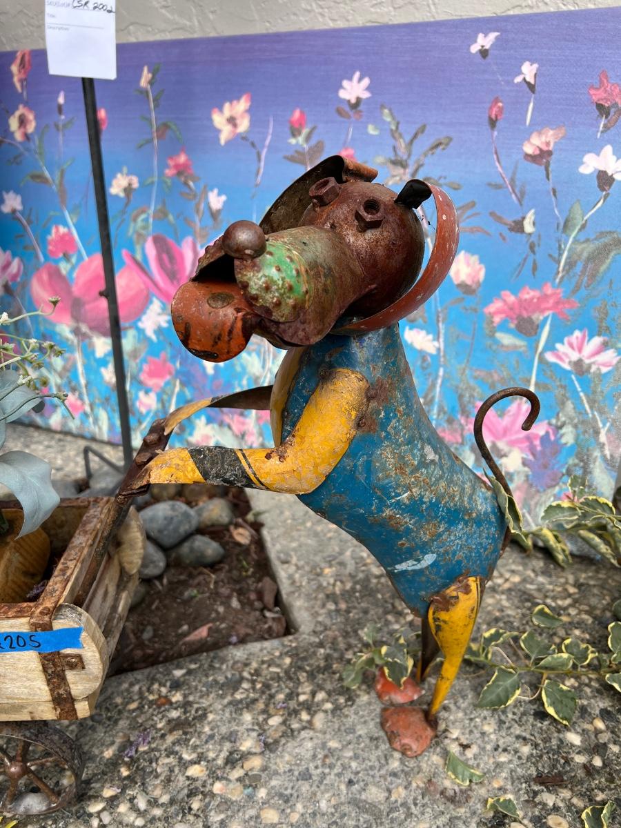 Includes floral print on canvas, tall plastic planter, bicycle garden stake, and metal dog sculpture.
