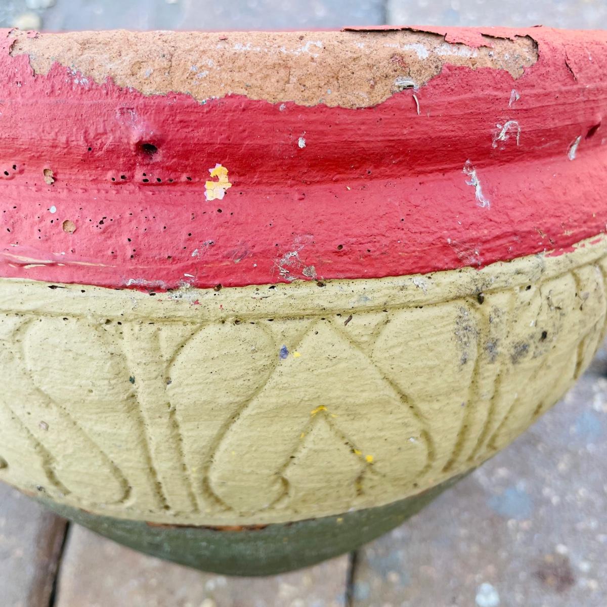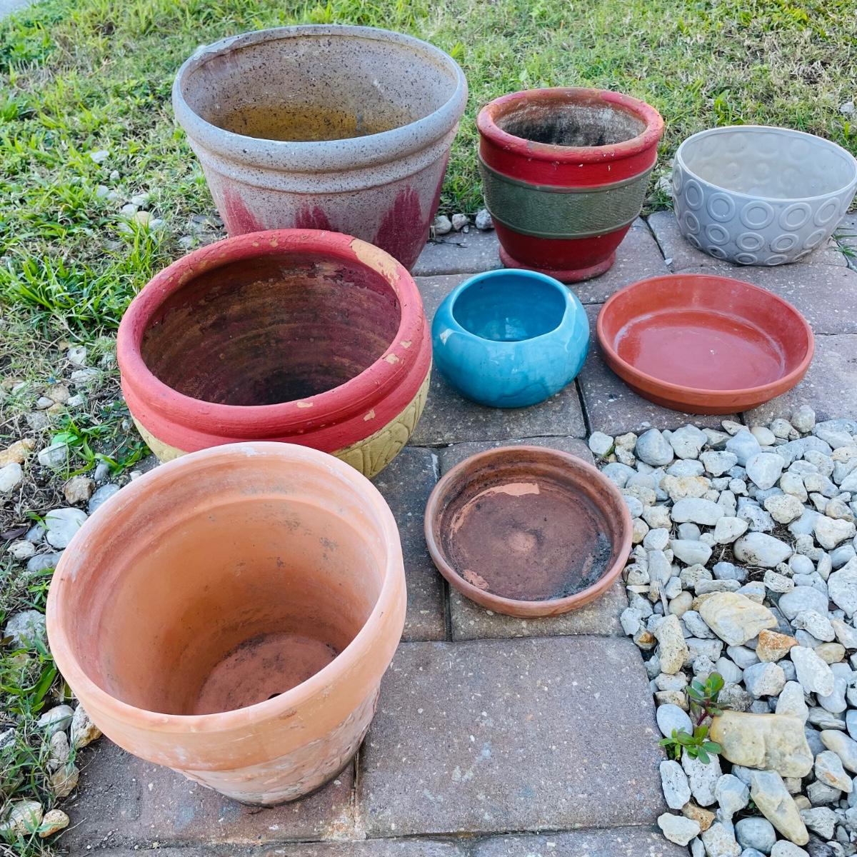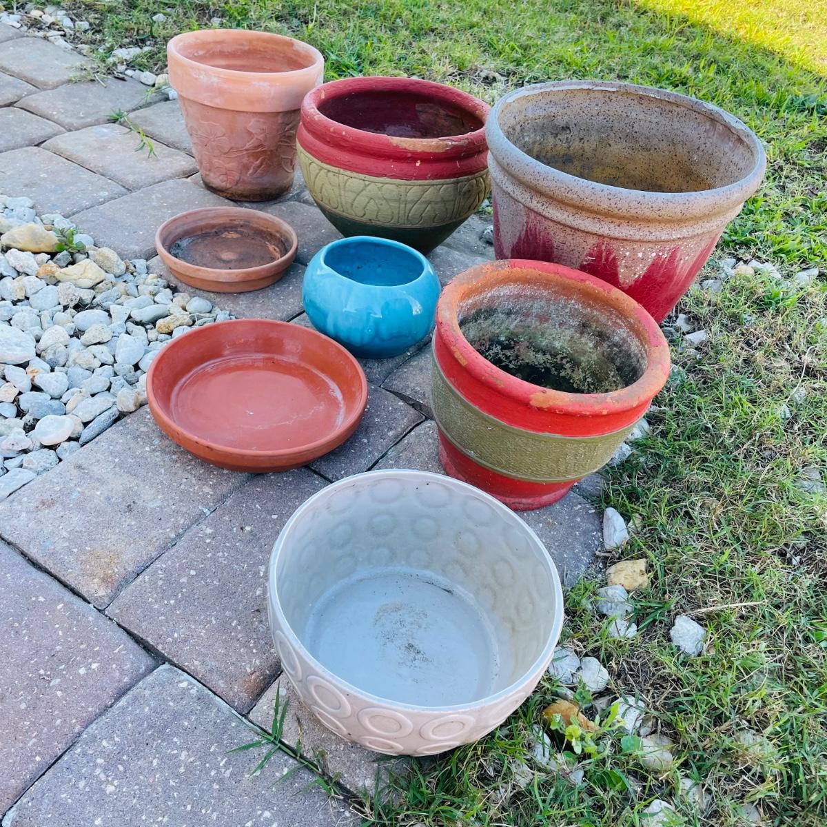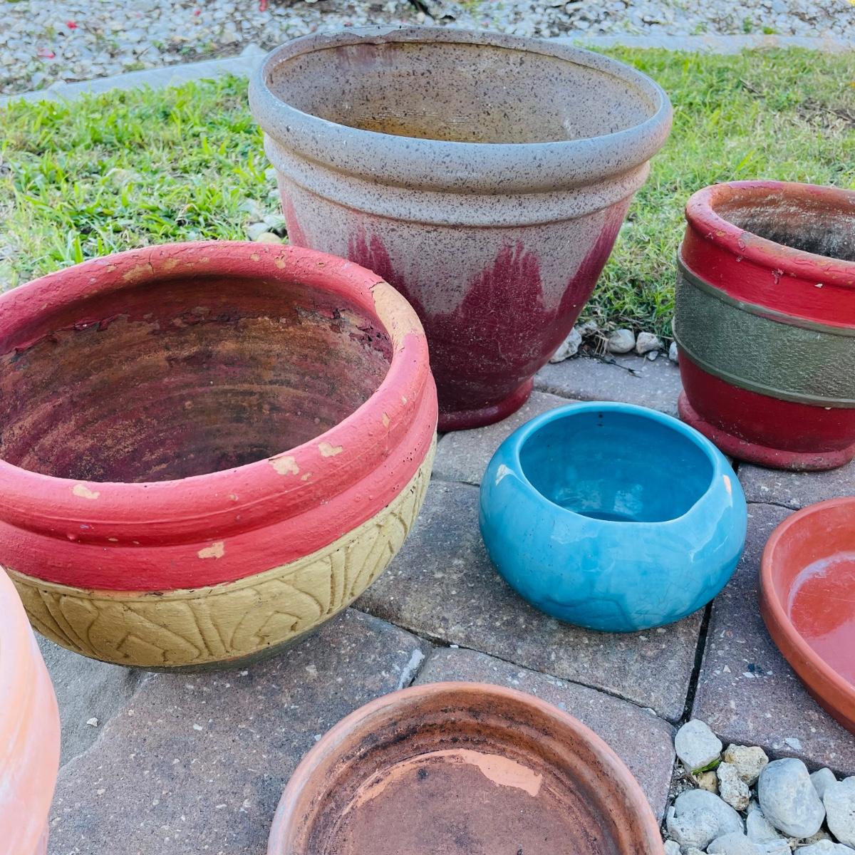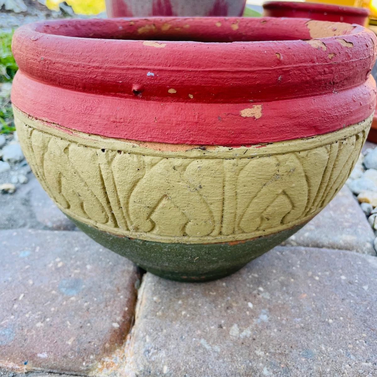 Lot includes an assortment of 6 flower pots. 3 terra cotta pots. One with a floral relief pattern, 2 painted pots. One red and green, one red yellow and green, some chipped paint from natural weathering. 2 clay pots. One blue crackle finish, and one gray finish with a circle relief pattern. One resin flower pot with a red and green finish. Largest flower pot is 12” opening, 10.5” H with a 7” bottom. The smallest opening 4.5” opening and 4.5” H. The drain trays are 8.5” round and 7” round.