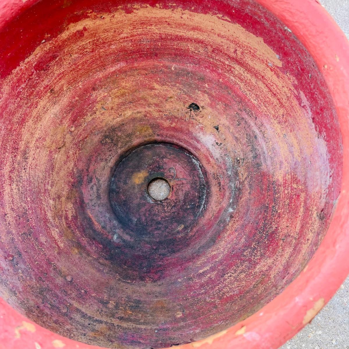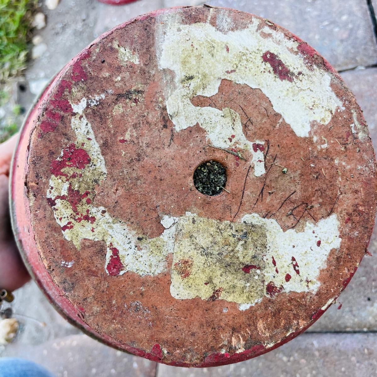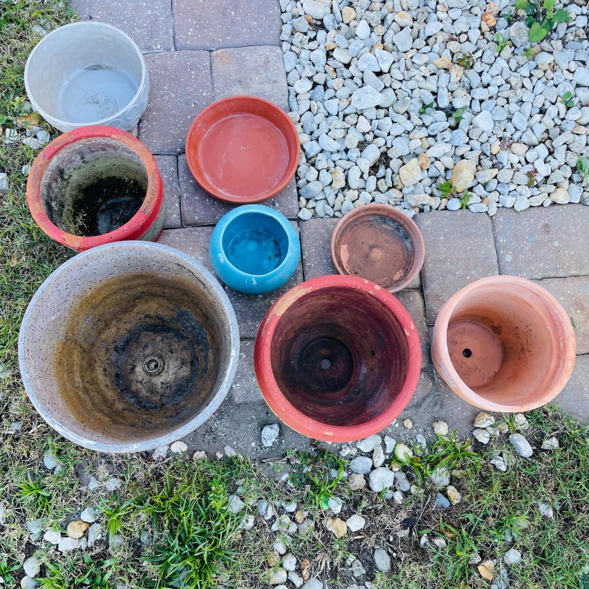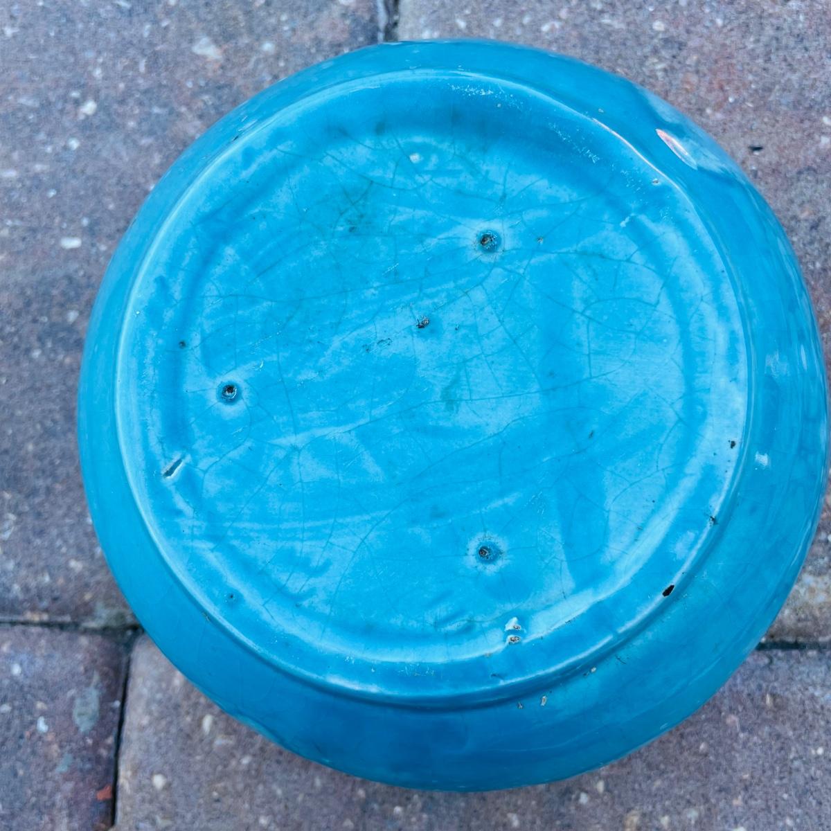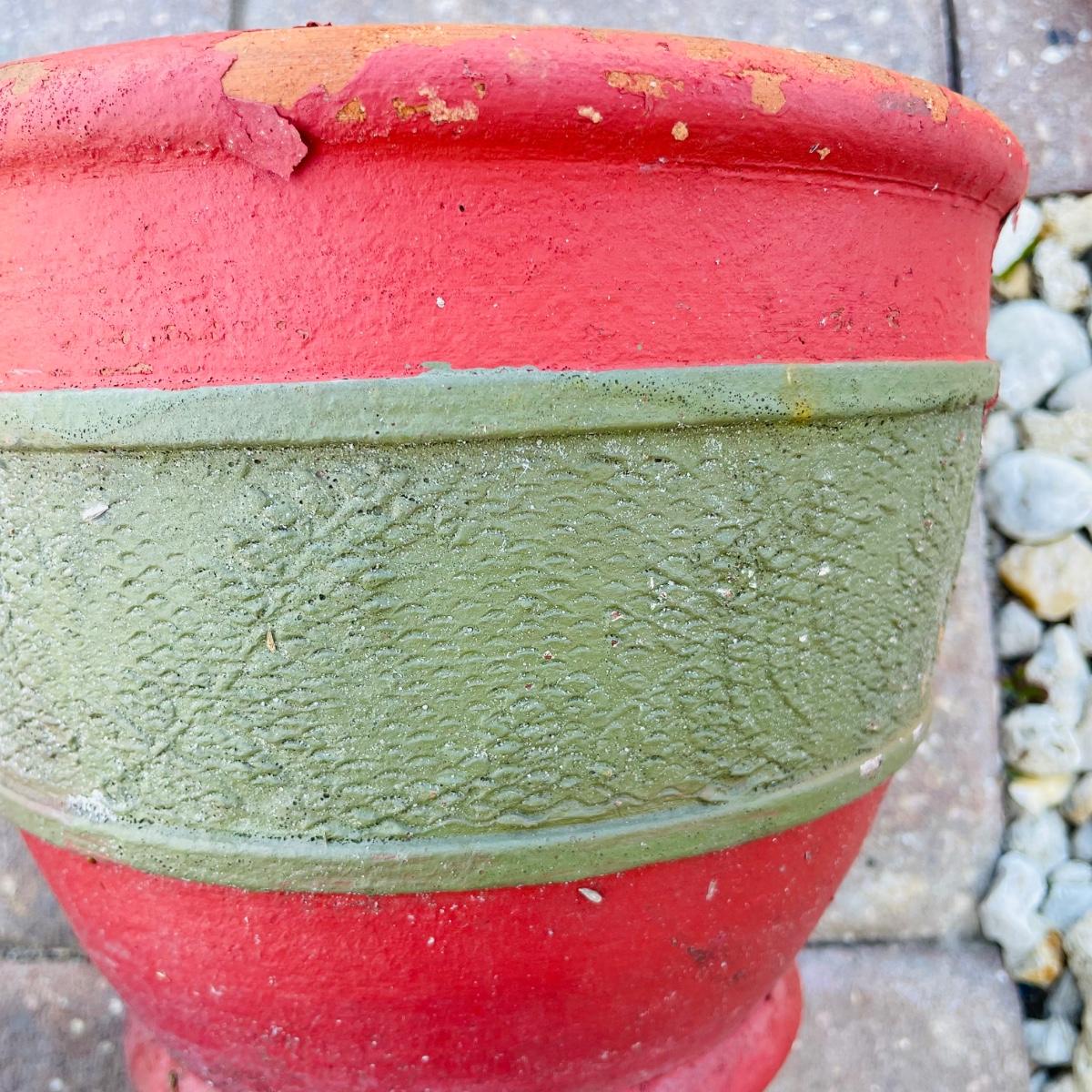 Lot includes an assortment of 6 flower pots. 3 terra cotta pots. One with a floral relief pattern, 2 painted pots. One red and green, one red yellow and green, some chipped paint from natural weathering. 2 clay pots. One blue crackle finish, and one gray finish with a circle relief pattern. One resin flower pot with a red and green finish. Largest flower pot is 12” opening, 10.5” H with a 7” bottom. The smallest opening 4.5” opening and 4.5” H. The drain trays are 8.5” round and 7” round.