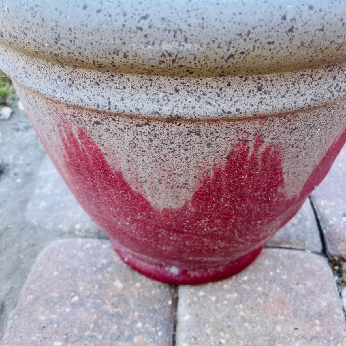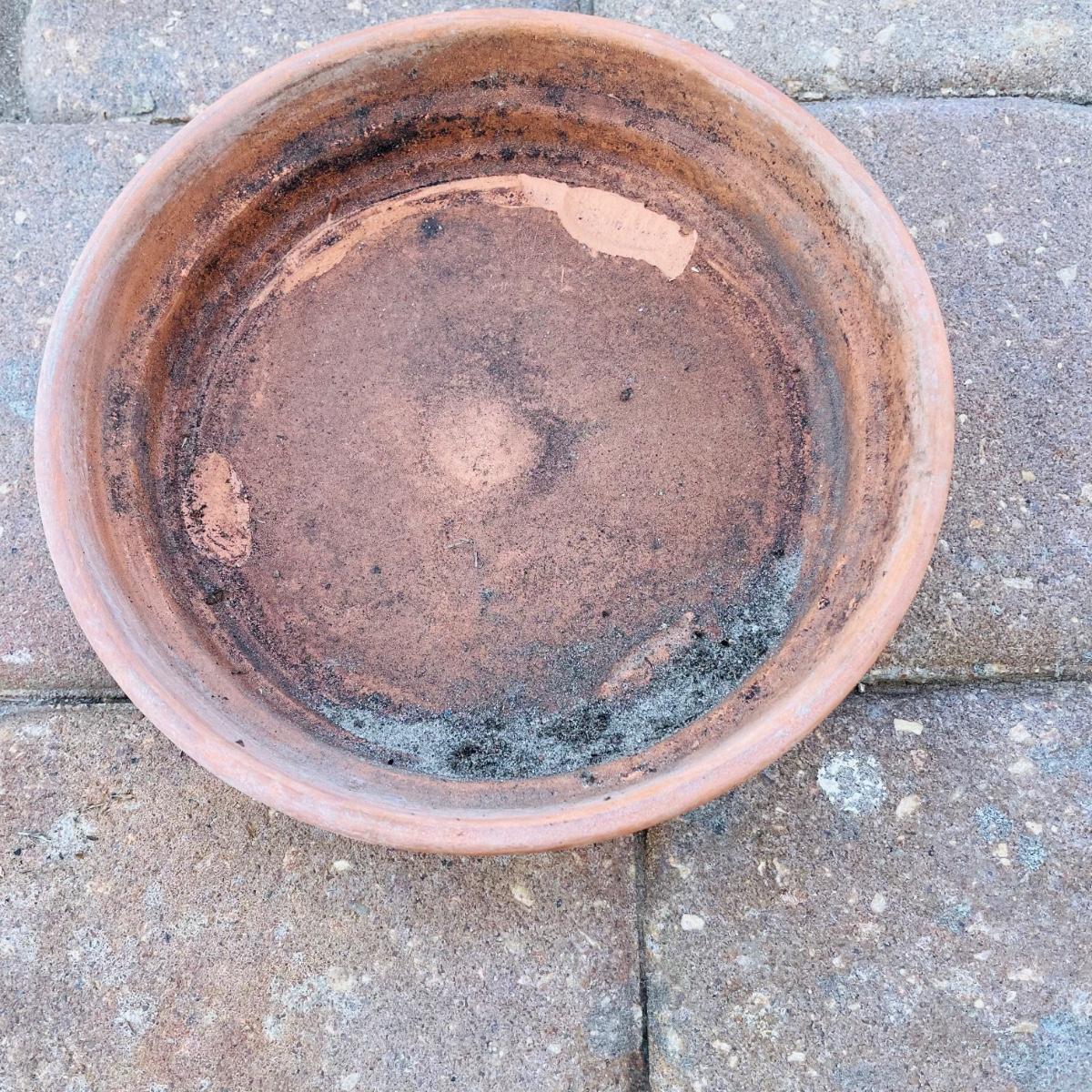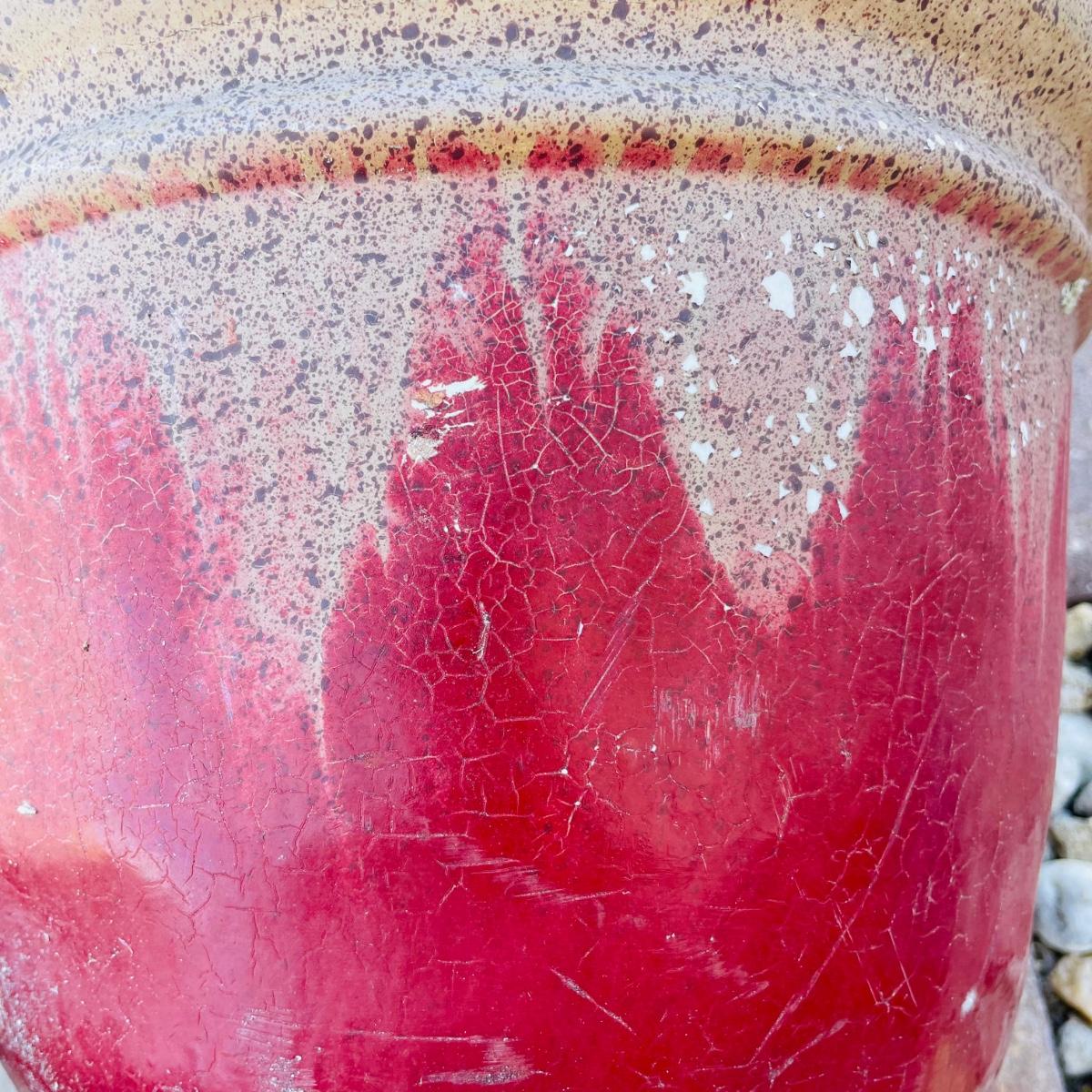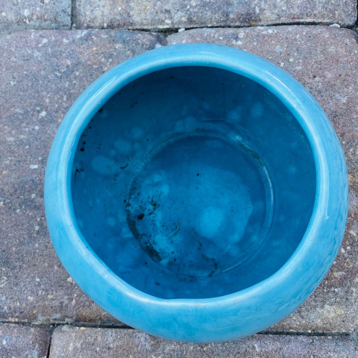 Lot includes an assortment of 6 flower pots. 3 terra cotta pots. One with a floral relief pattern, 2 painted pots. One red and green, one red yellow and green, some chipped paint from natural weathering. 2 clay pots. One blue crackle finish, and one gray finish with a circle relief pattern. One resin flower pot with a red and green finish. Largest flower pot is 12” opening, 10.5” H with a 7” bottom. The smallest opening 4.5” opening and 4.5” H. The drain trays are 8.5” round and 7” round.