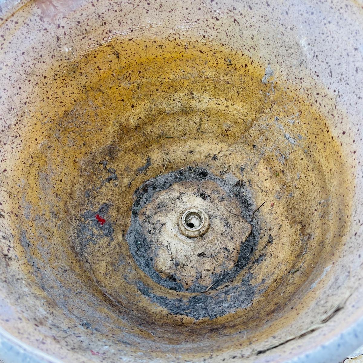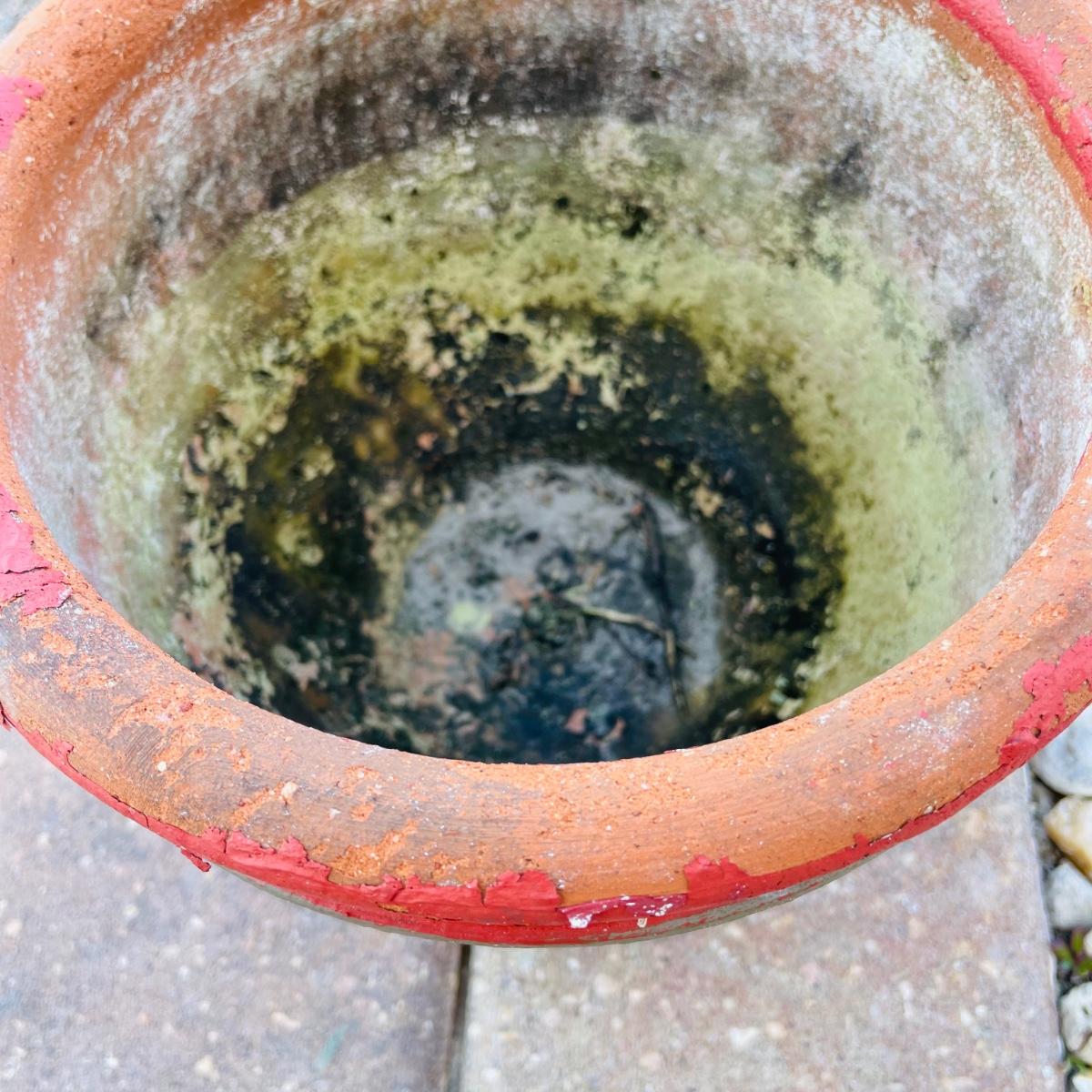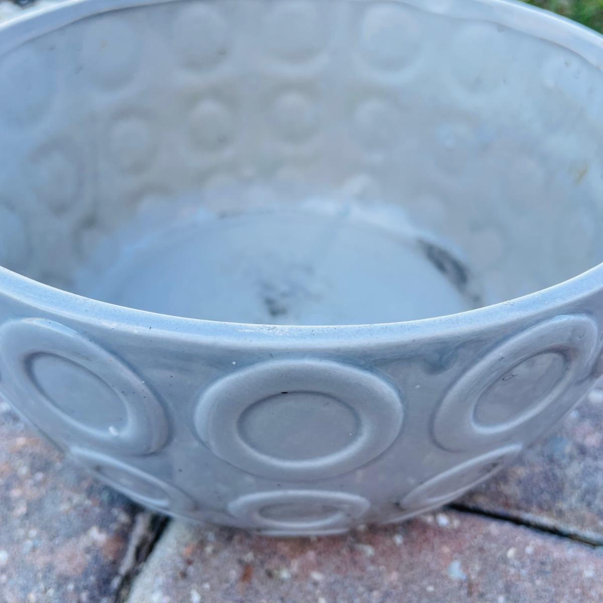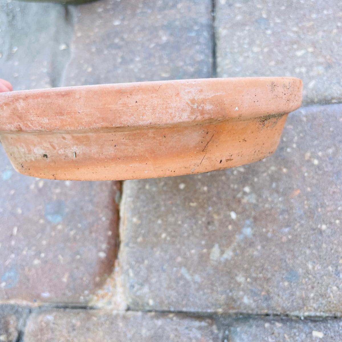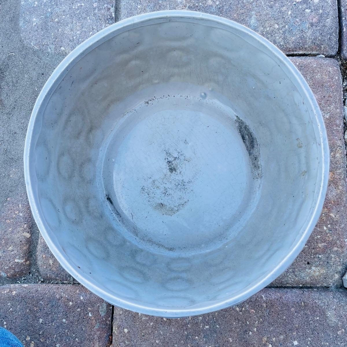 Lot includes an assortment of 6 flower pots. 3 terra cotta pots. One with a floral relief pattern, 2 painted pots. One red and green, one red yellow and green, some chipped paint from natural weathering. 2 clay pots. One blue crackle finish, and one gray finish with a circle relief pattern. One resin flower pot with a red and green finish. Largest flower pot is 12” opening, 10.5” H with a 7” bottom. The smallest opening 4.5” opening and 4.5” H. The drain trays are 8.5” round and 7” round.