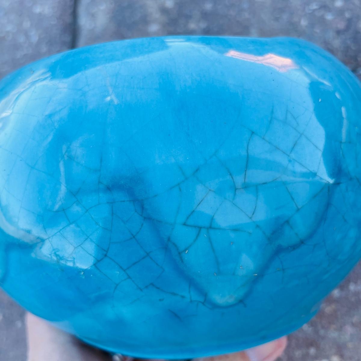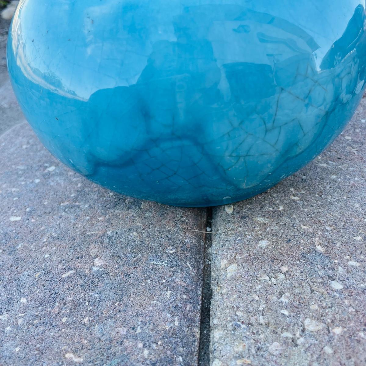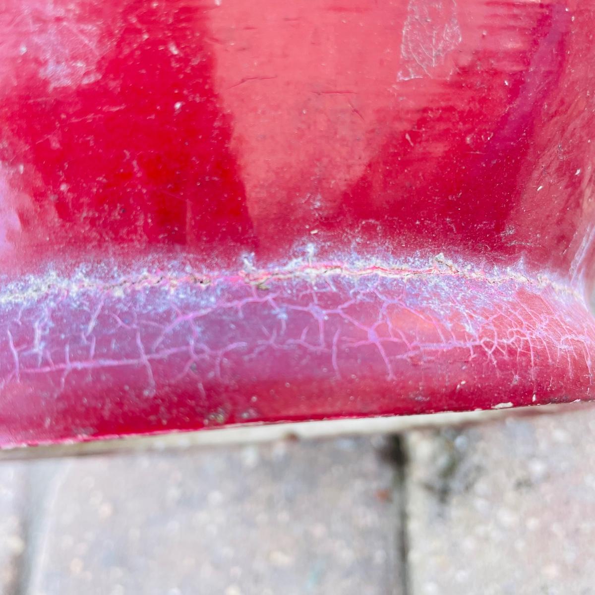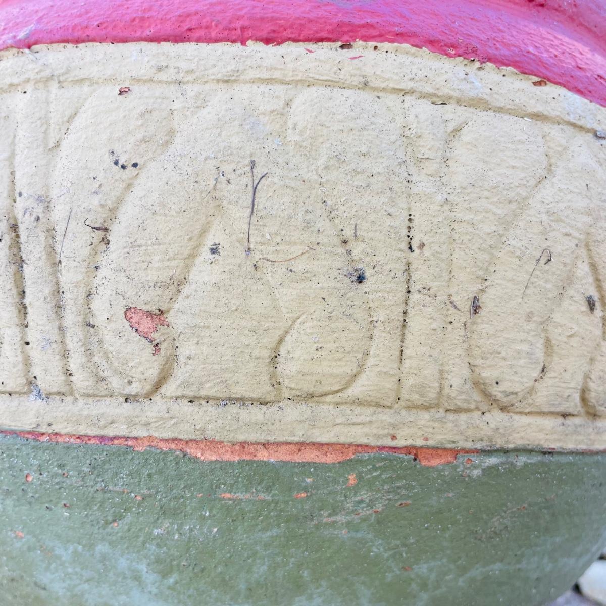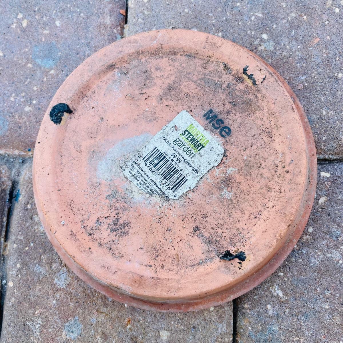 Lot includes an assortment of 6 flower pots. 3 terra cotta pots. One with a floral relief pattern, 2 painted pots. One red and green, one red yellow and green, some chipped paint from natural weathering. 2 clay pots. One blue crackle finish, and one gray finish with a circle relief pattern. One resin flower pot with a red and green finish. Largest flower pot is 12” opening, 10.5” H with a 7” bottom. The smallest opening 4.5” opening and 4.5” H. The drain trays are 8.5” round and 7” round.