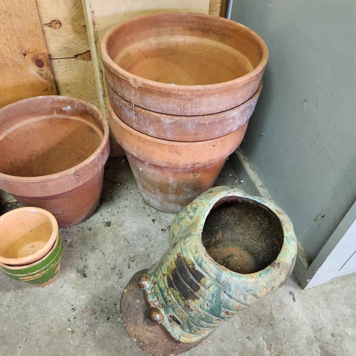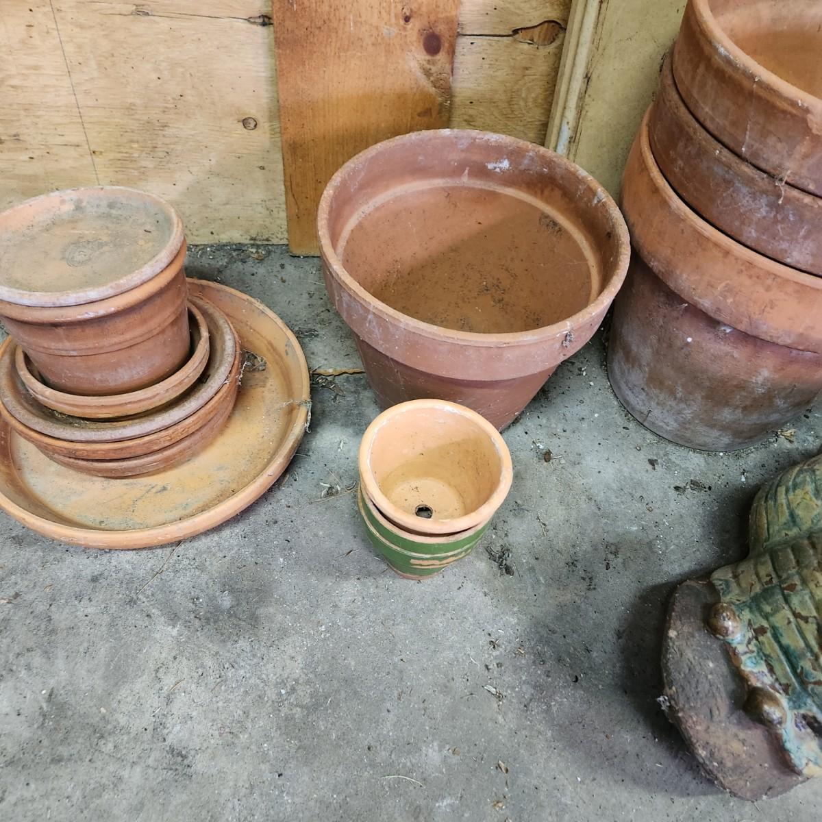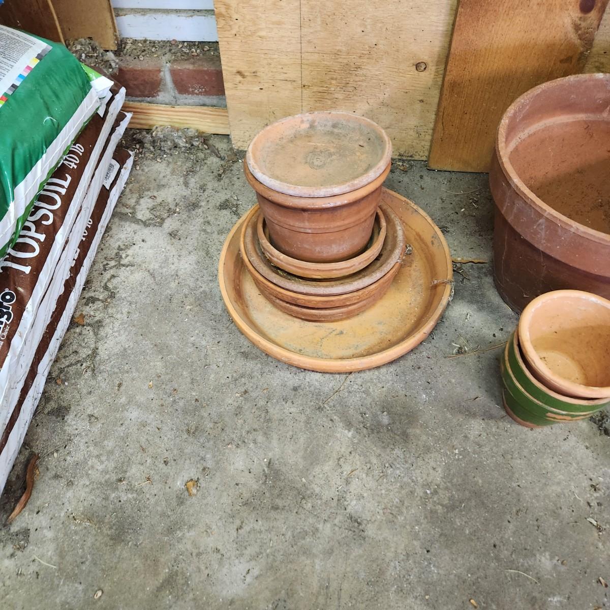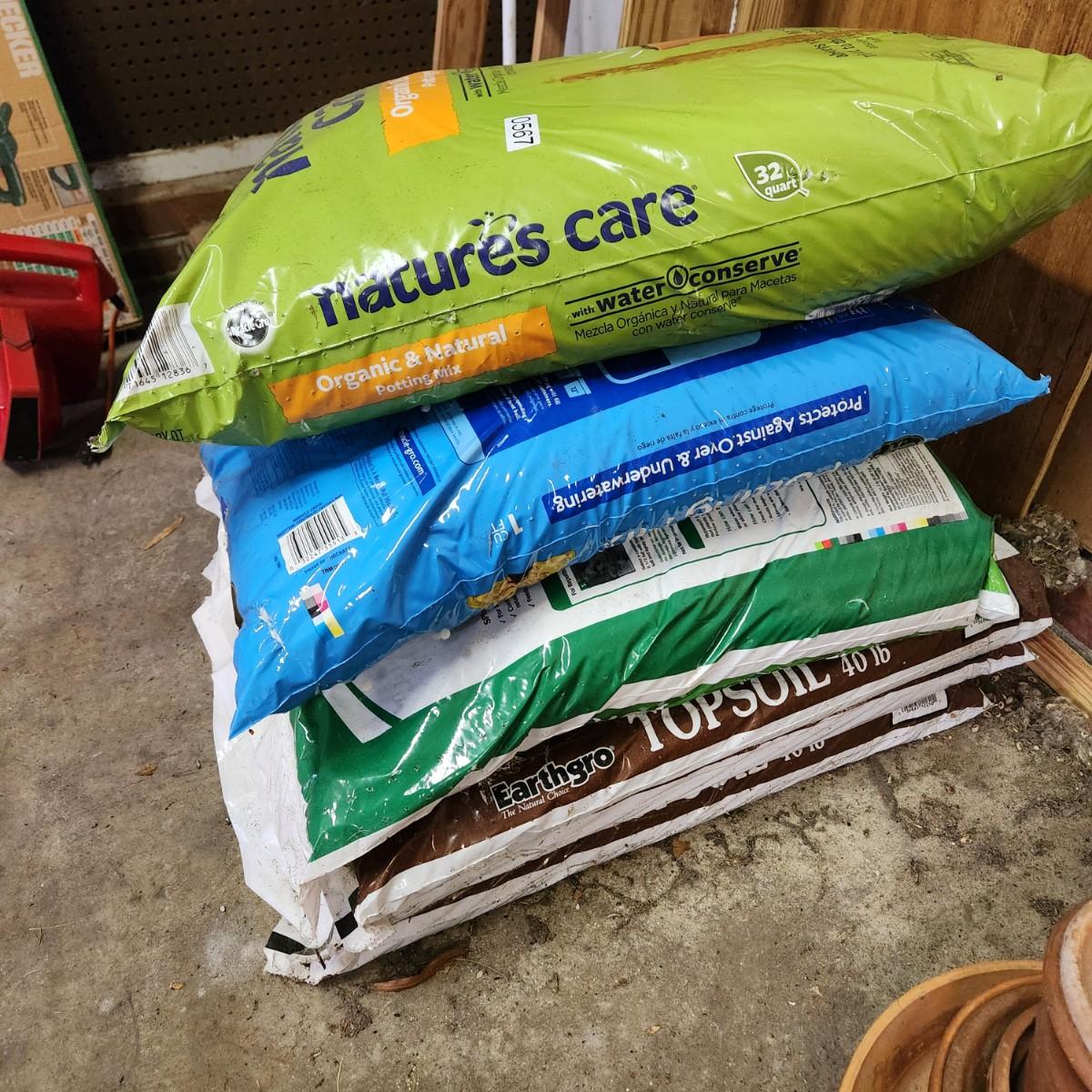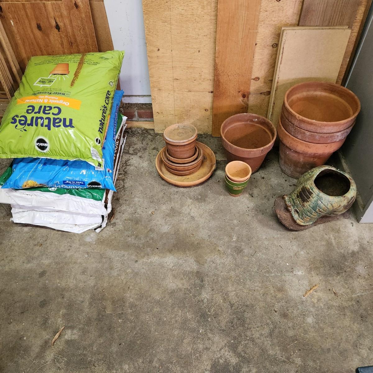 Garden Planting Lot Clay Planters, Potting Mix, Top Soil Bags