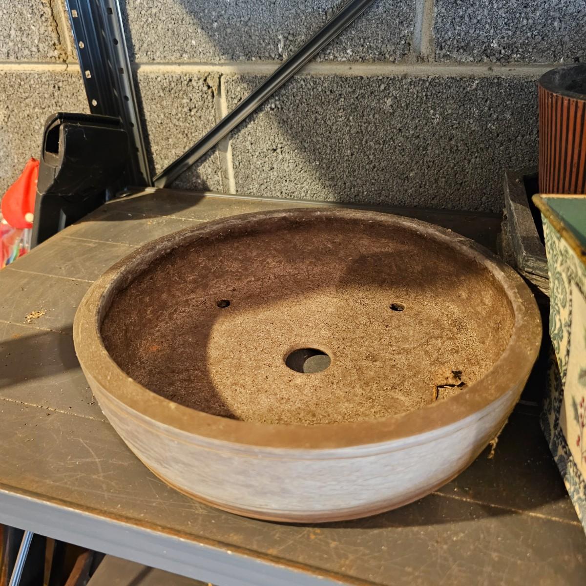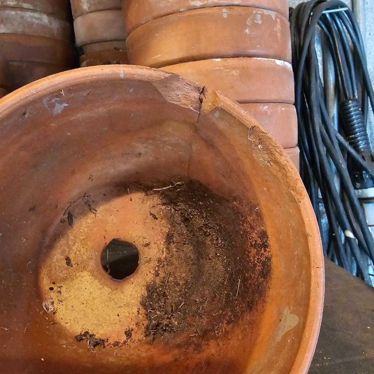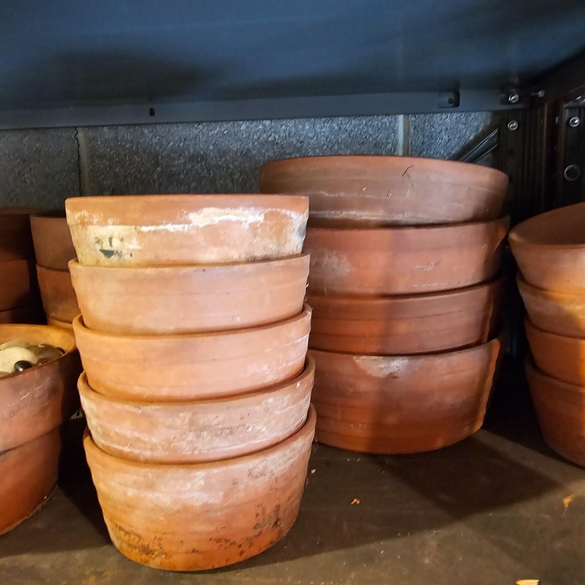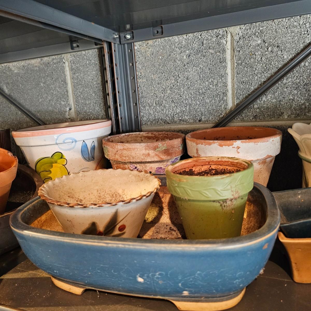 Terra cotta, plastic, plain, decorated, everything here for the gardener. Plain pots range from 4"D to 9"D. Trays are 5.5"D to 18"D. Some glazed, some hand painted, others plain. Minor cracks in some of the items, examples are shown in photos. See photos for details. Local pickup only. This is a large lot; we suggest the winning must bring assistance to help move and load this collection.