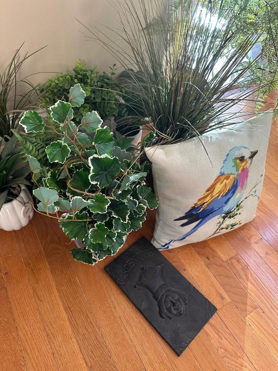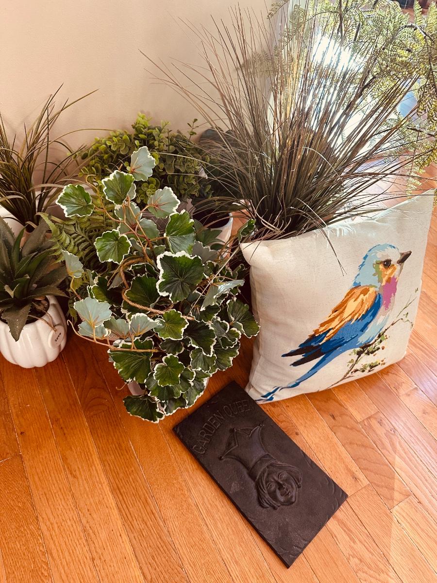 GARDEN QUEEN LOT FAUX PLANTS IN VESSELS, BIRD PILLOW, GARDEN QUEEN WALL ART AS PICTURED