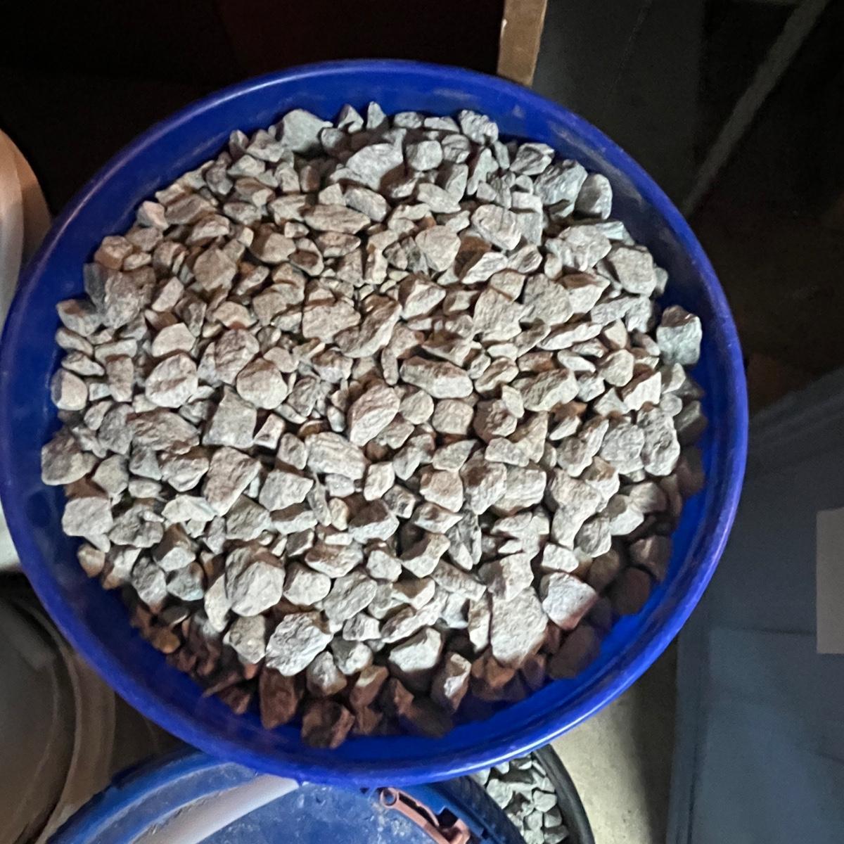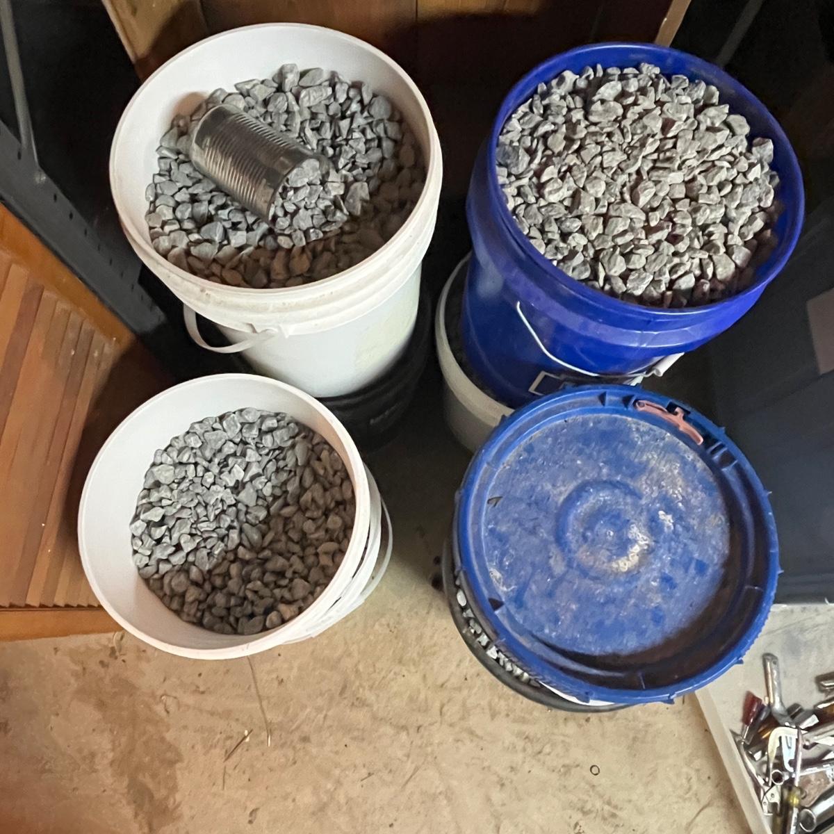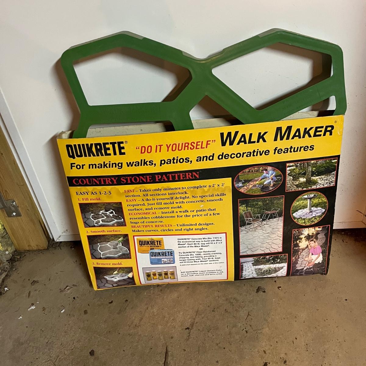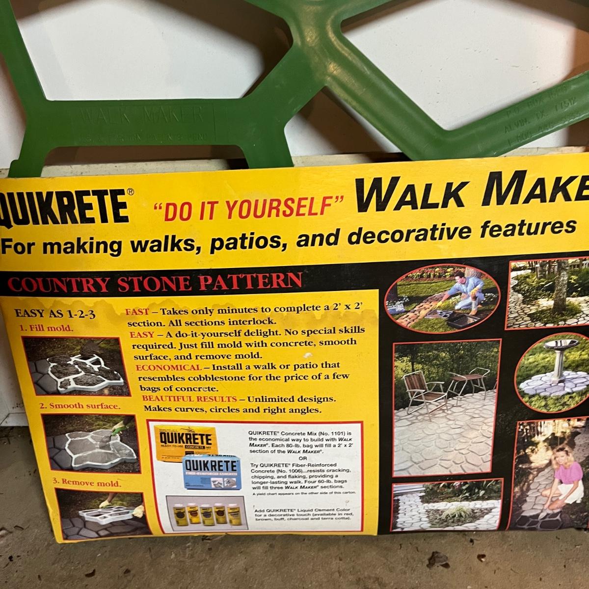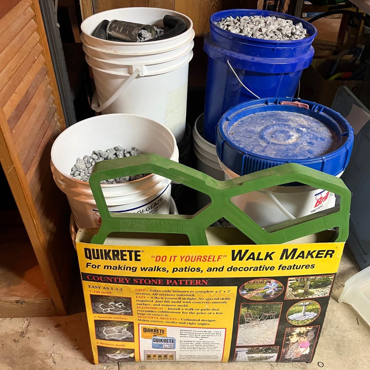 Lot includes eight buckets of garden rock with the largest bucket being a five gallon. Also includes Quikrete walk maker.