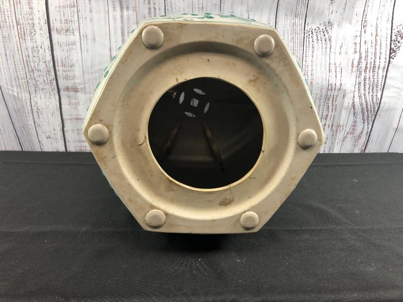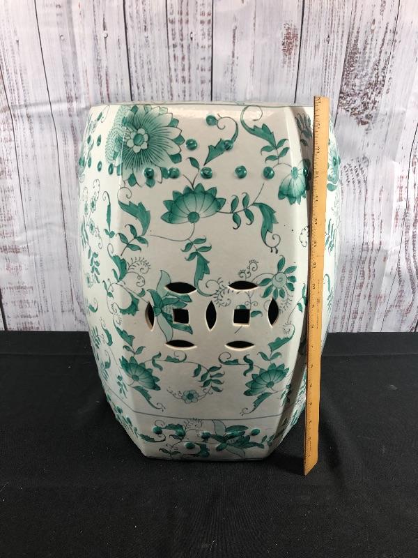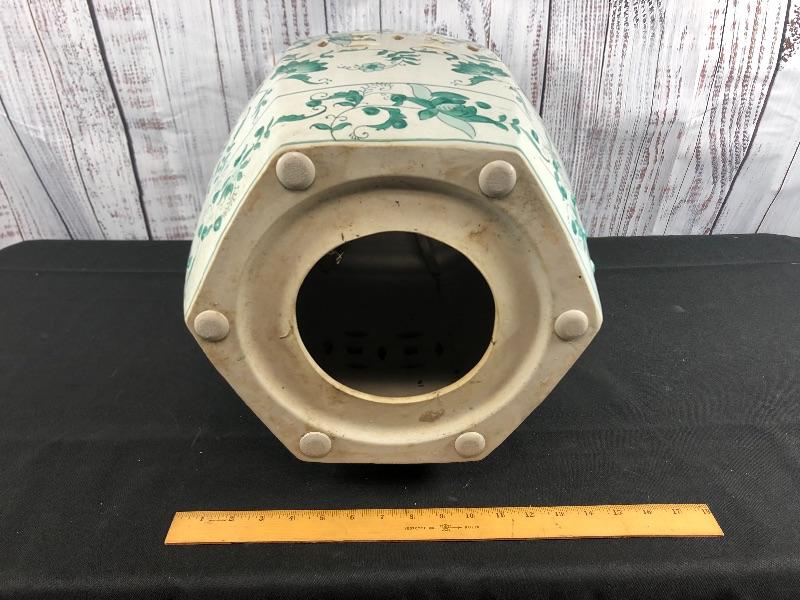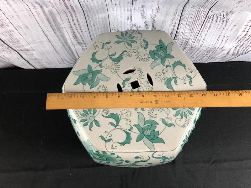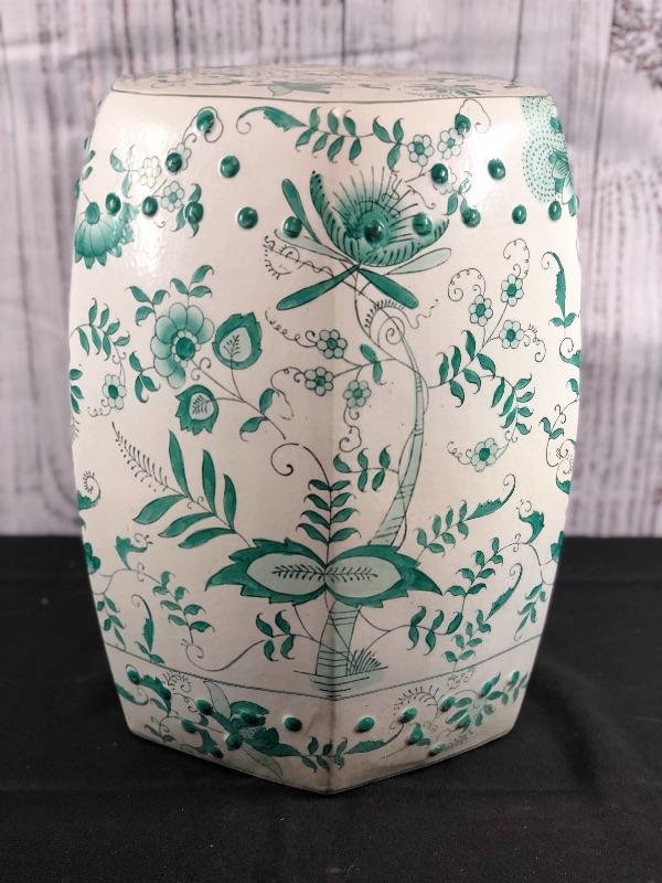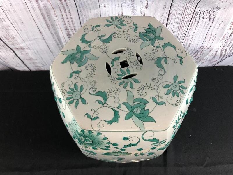 Ceramic garden stool. Green and white floral pattern. Hexagon shape. Good used condition. Great as side table or plant stand. Stands about 18".